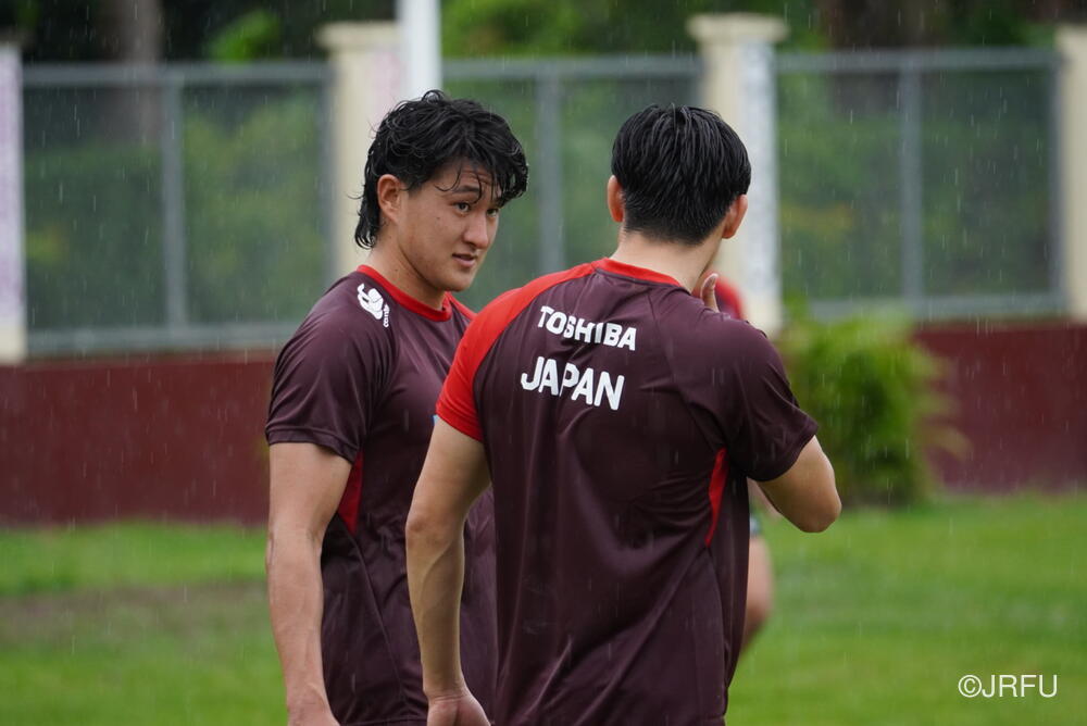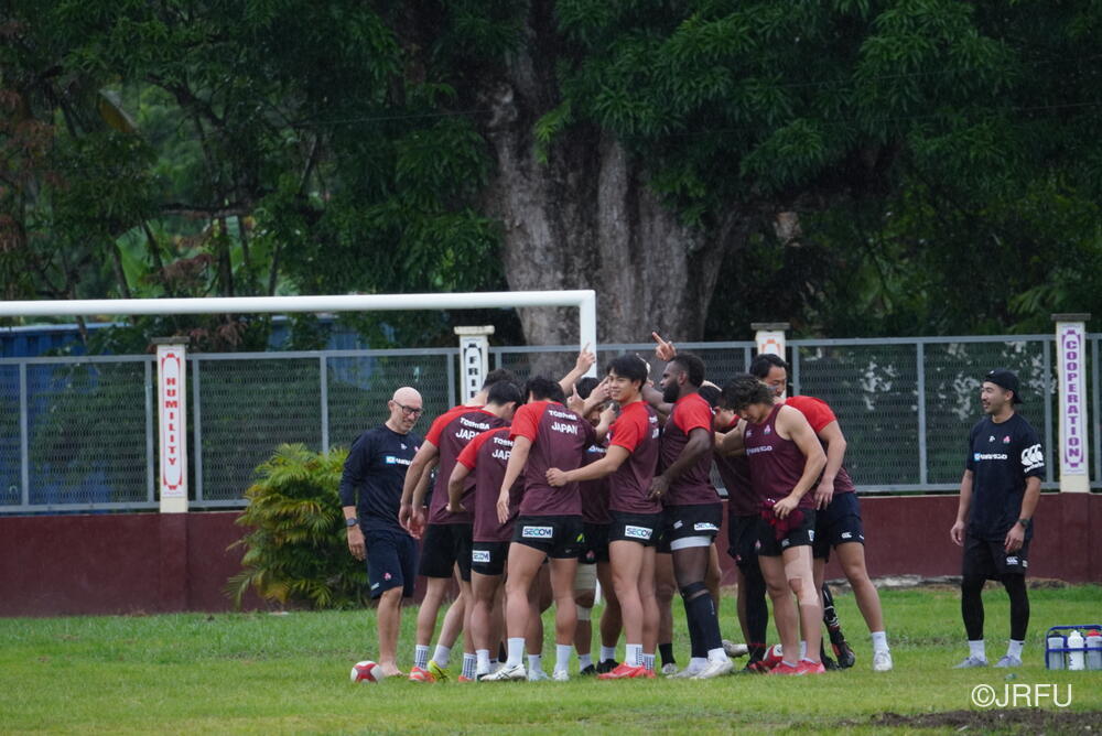 午後はフィールドへ移動し、身体をほぐすための軽めの練習を実施しました。あいにくの雨模様となりましたが、選手たちは現地の気候を確認しながら丁寧にセッションを消化。最後は歩きながらサインプレーやセットプレーの確認を行いました。