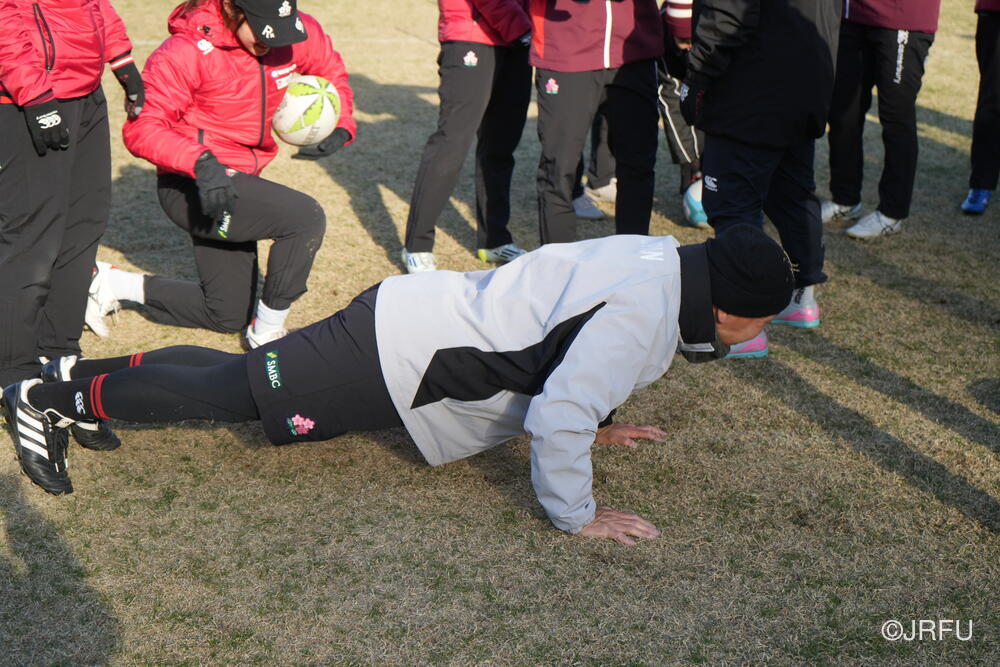 坂田S&Cコーチはルールを間違え、自ら反省のプッシュアップ・・・。