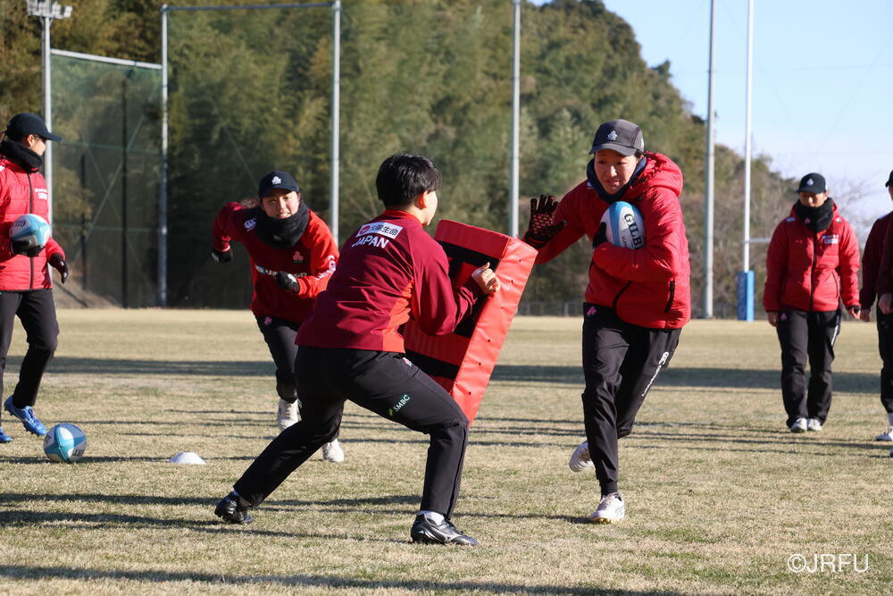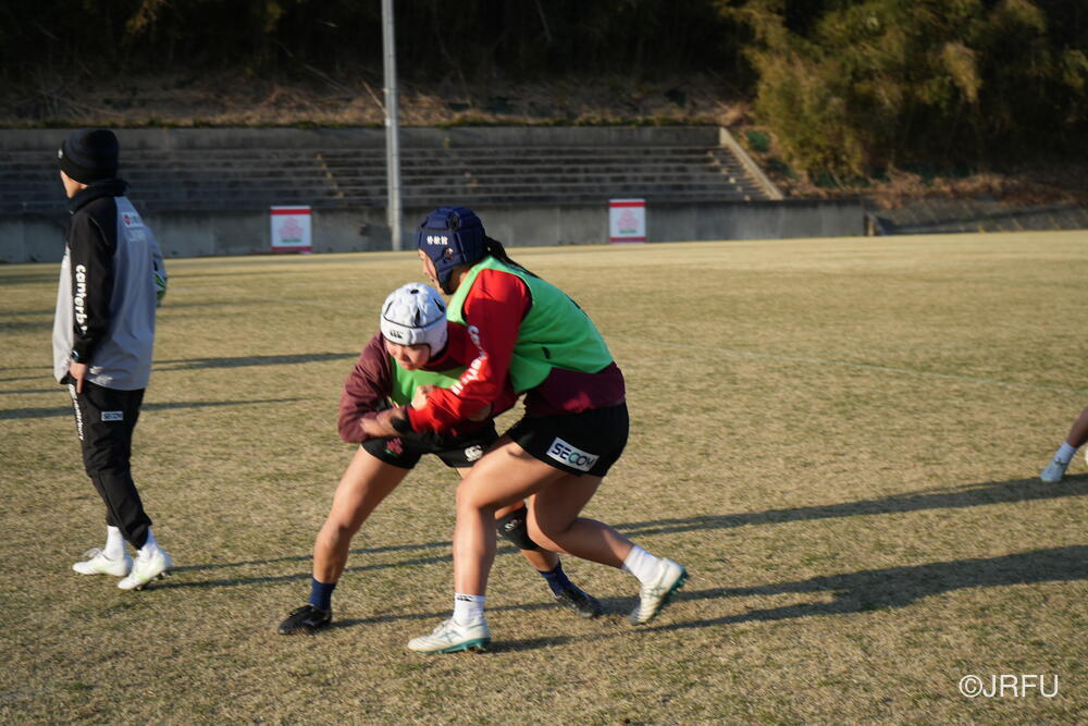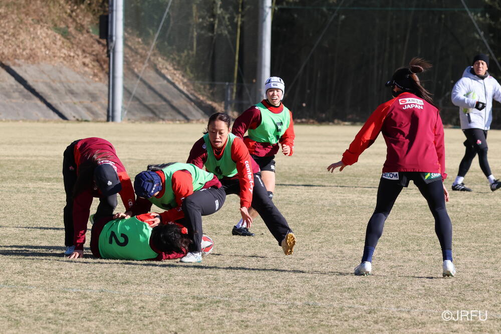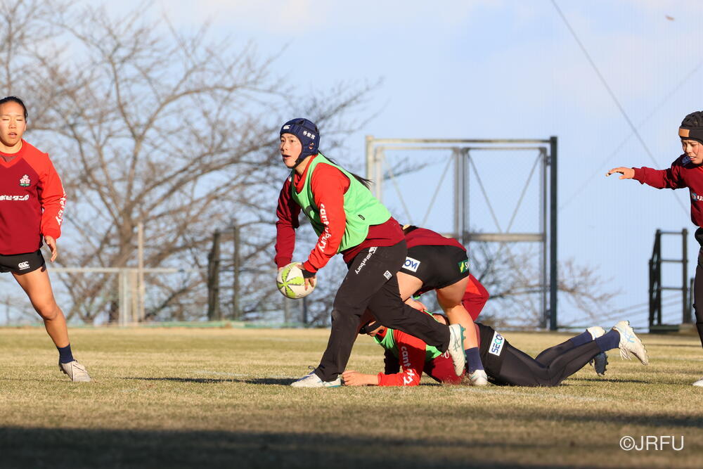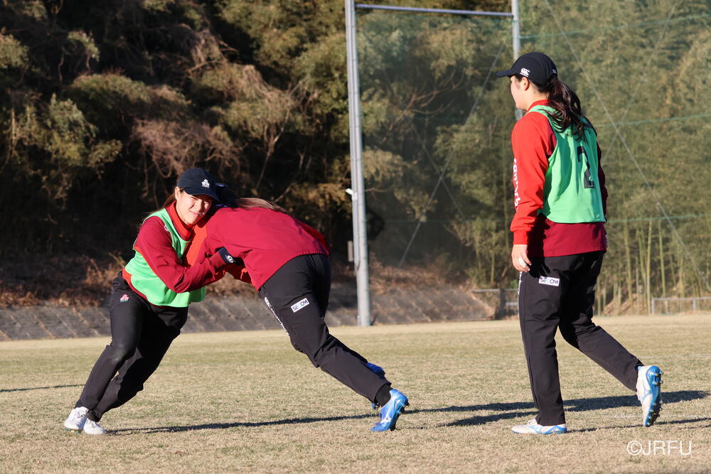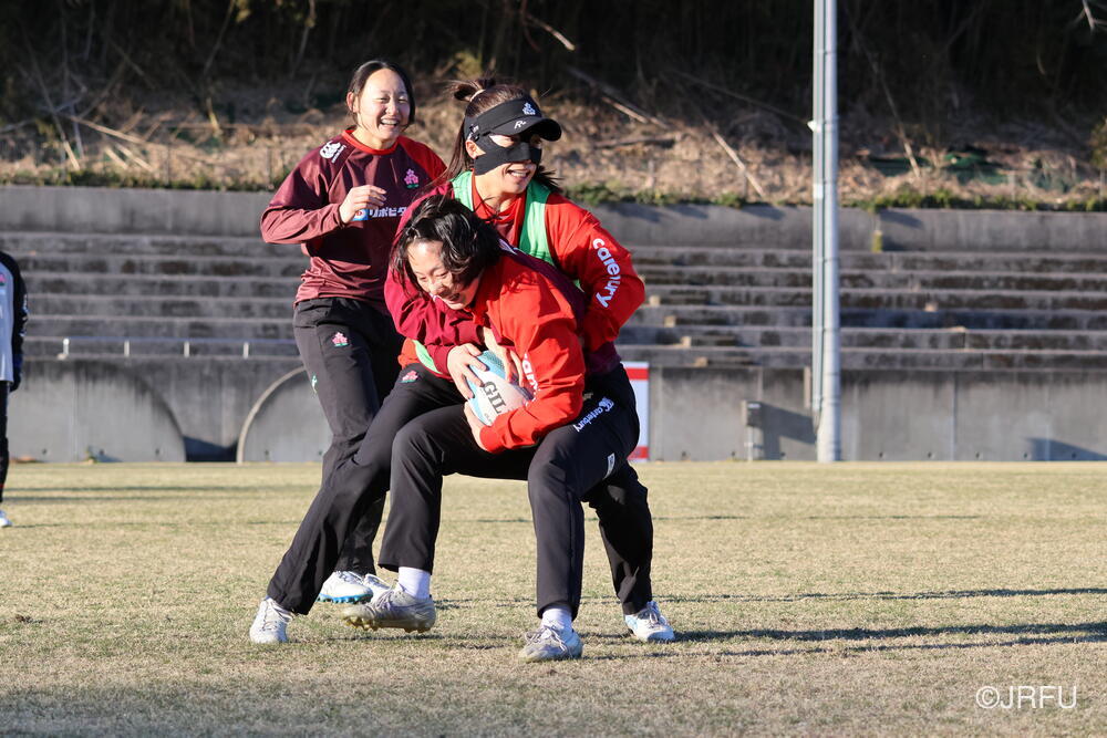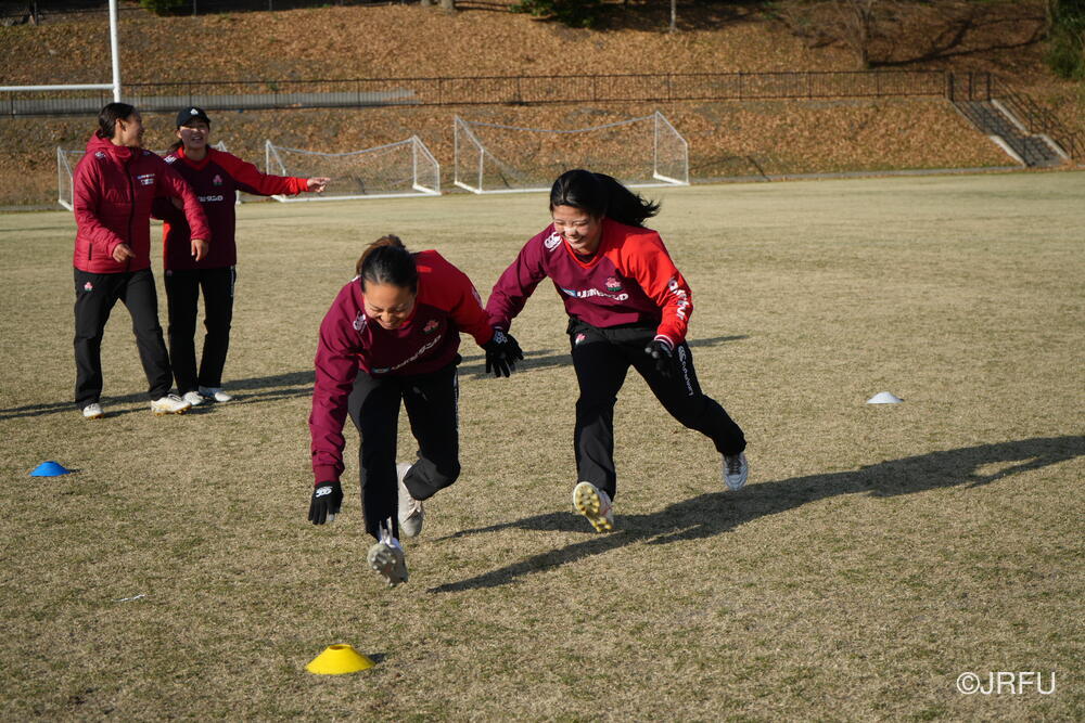 午後は、コンタクトの練習です。サクラセブンズはいくら走り勝とうとしても、接点で負けたら試合には勝つことができません。自分たちの身体を活かして賢く倒し、どうやって賢くボールを奪うかを考えながら行いました。また、アタック側も世界トップ2のチームの選手になった気持ちで激しく挑みました。