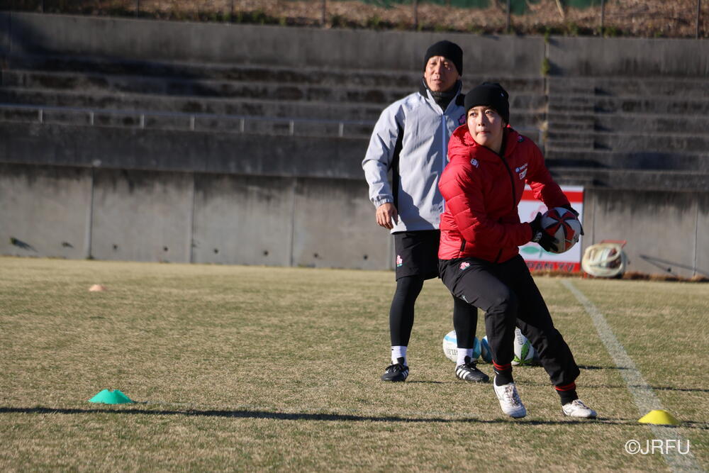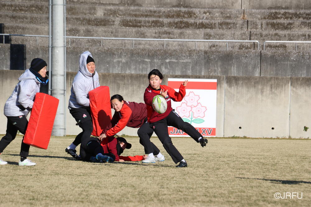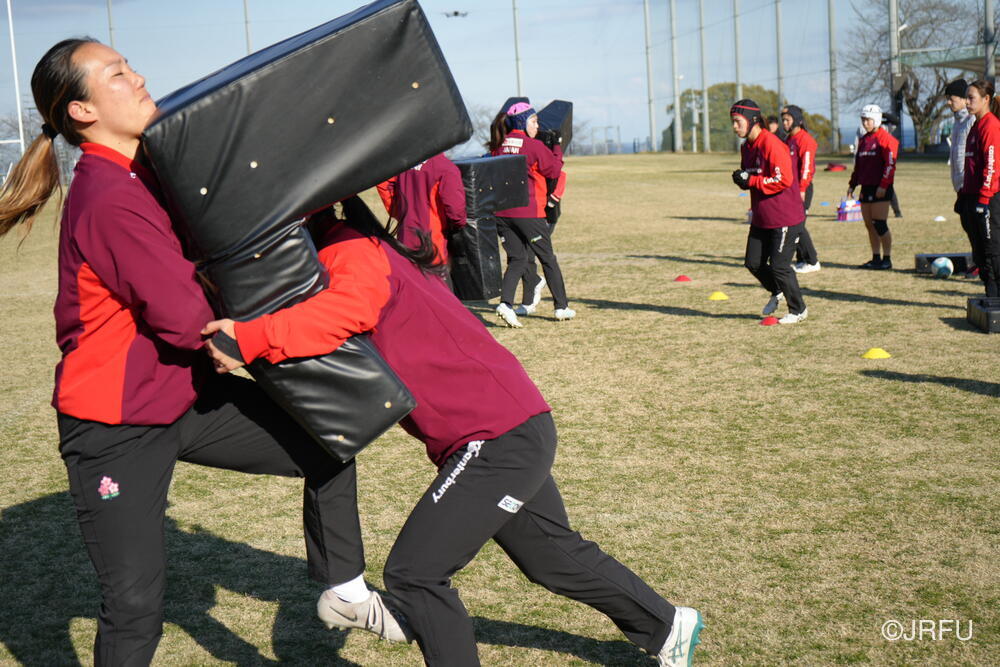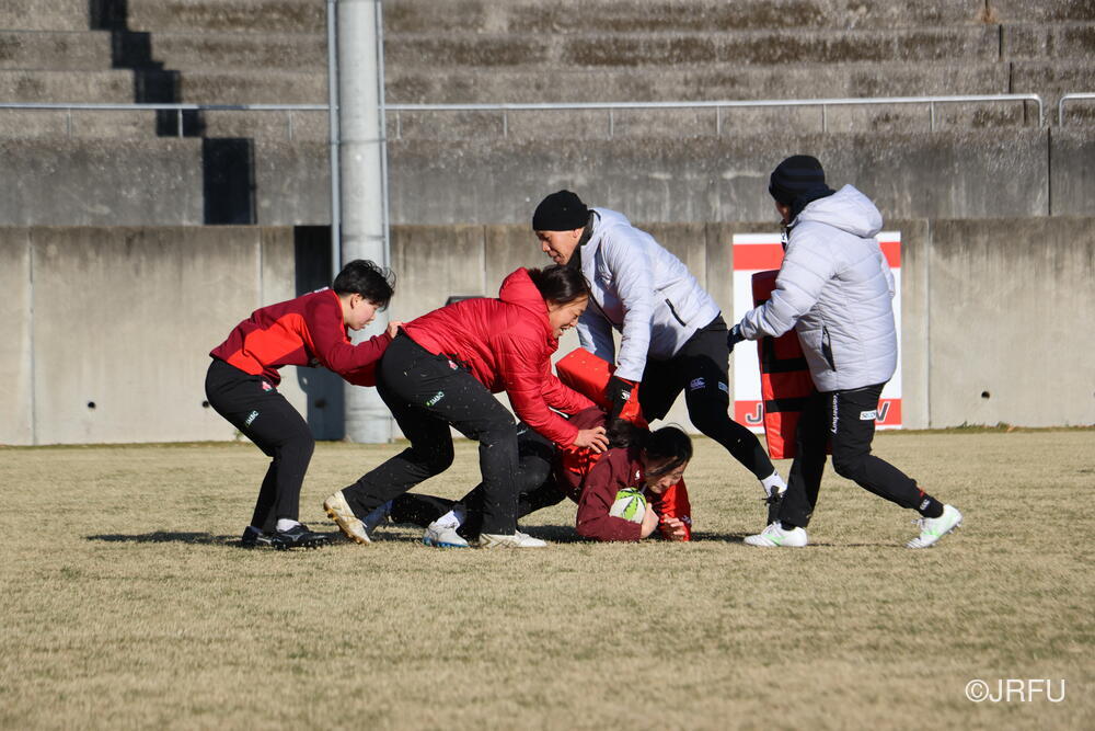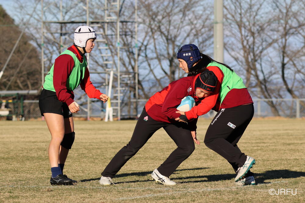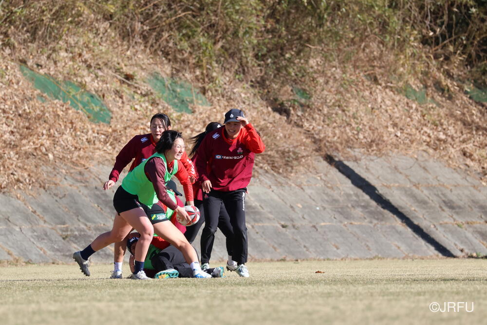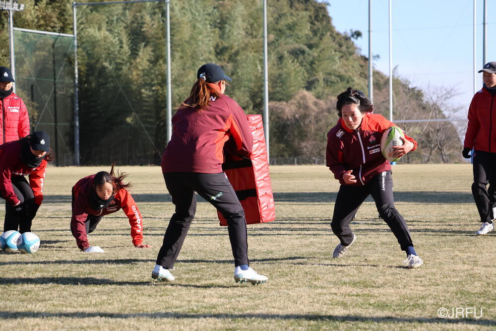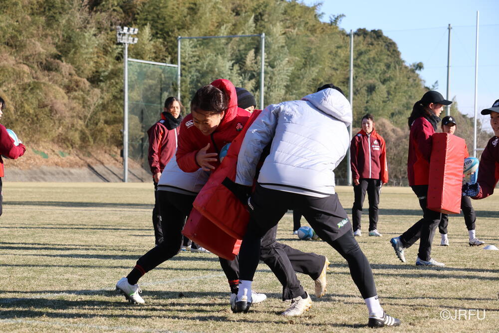 午後は、コンタクトの練習です。サクラセブンズはいくら走り勝とうとしても、接点で負けたら試合には勝つことができません。自分たちの身体を活かして賢く倒し、どうやって賢くボールを奪うかを考えながら行いました。また、アタック側も世界トップ2のチームの選手になった気持ちで激しく挑みました。