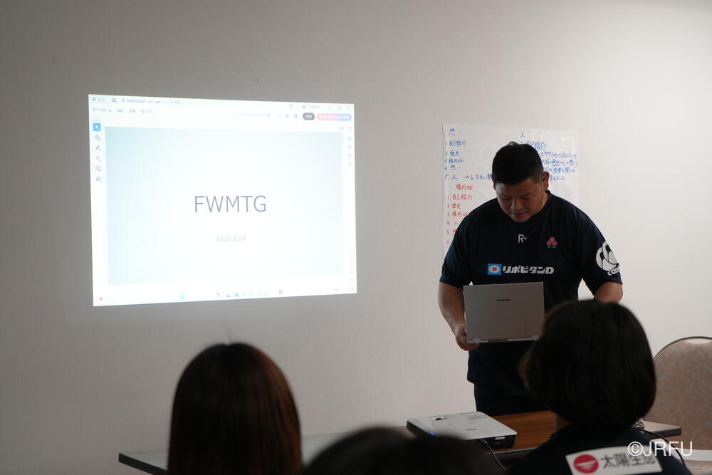 夕食前にはチームミーティングを行い、今シーズンの残りの期間で取り組む「繋」プロジェクトについて、選手主体で話し合いました。ラグビー以外の活動を通して、サクラセブンズを4つの視点から探究します。吉野プロジェクトリーダー、各グループリーダー中心に真剣かつ楽しそうに話し合っていました。