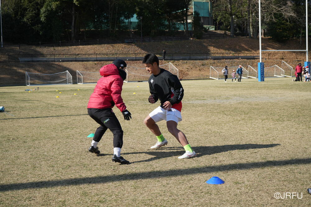 合宿最終日、シンガポール大会前最後の国内練習です。前日に引き続きキックオフから始まり、スクラムやラインアウトから、他国チームとの対戦を想定したアタックディフェンスを行いました。間には坂田S&Cコーチのムーブメントスキルやコンタクトレディを挟み、自分たちの身体を賢く使いながらラグビーの動きに繋げていきます。