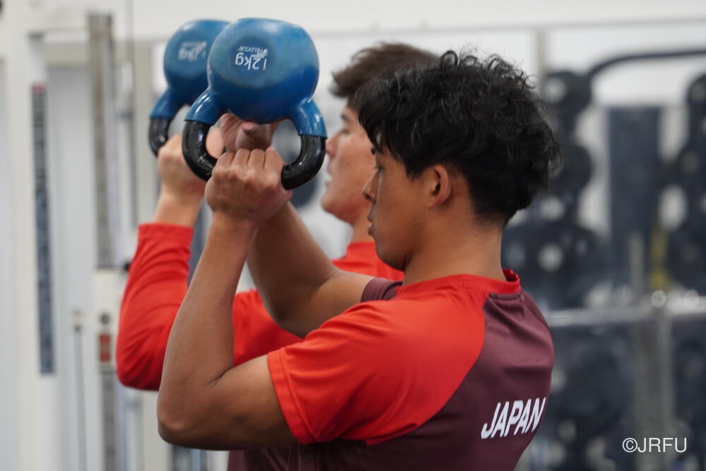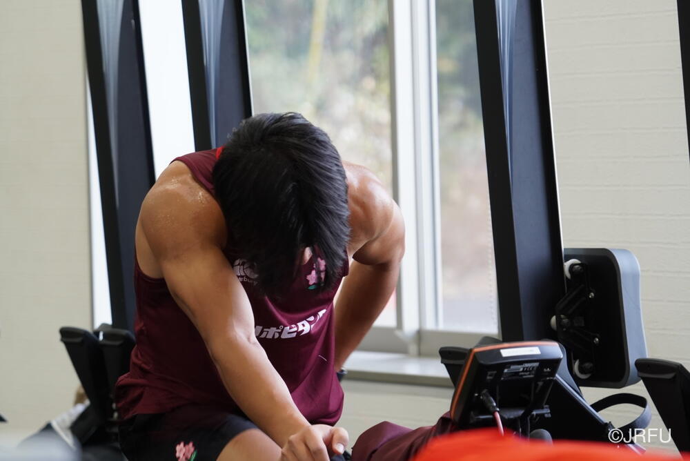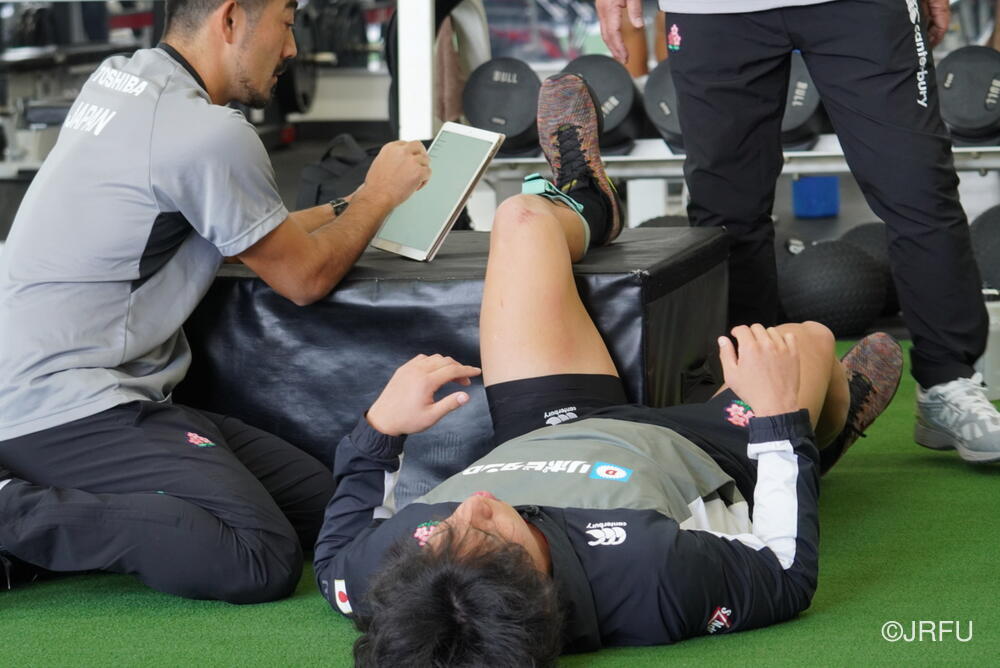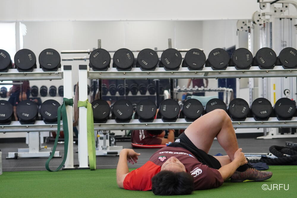 初日のセッションはジムトレーニングからスタート。これまでの柔軟性のスクリーニングテストや測定の結果、そして各自過去のコンディション記録に基づき、一人ひとりの課題や怪我の状態に合わせた補強プログラムに取り組みました。