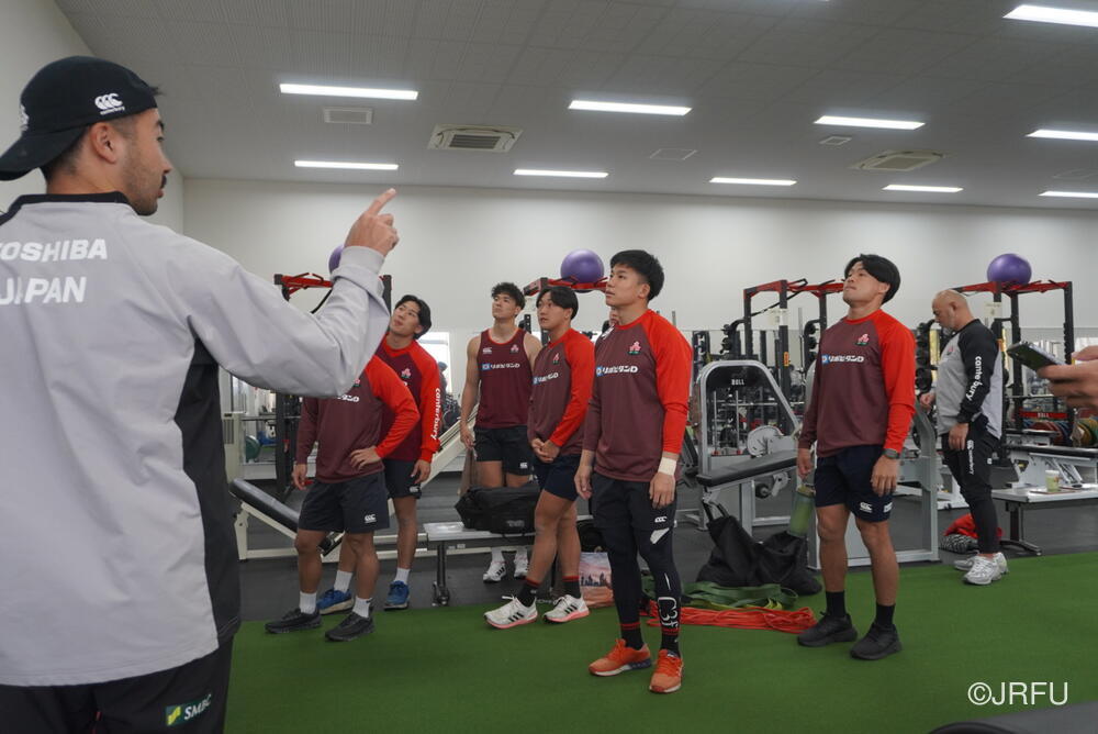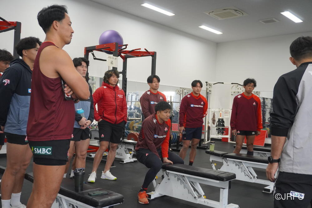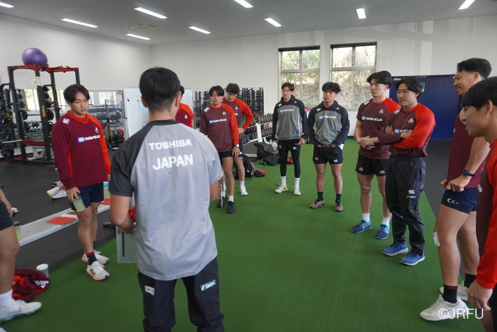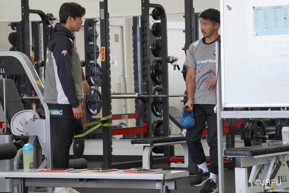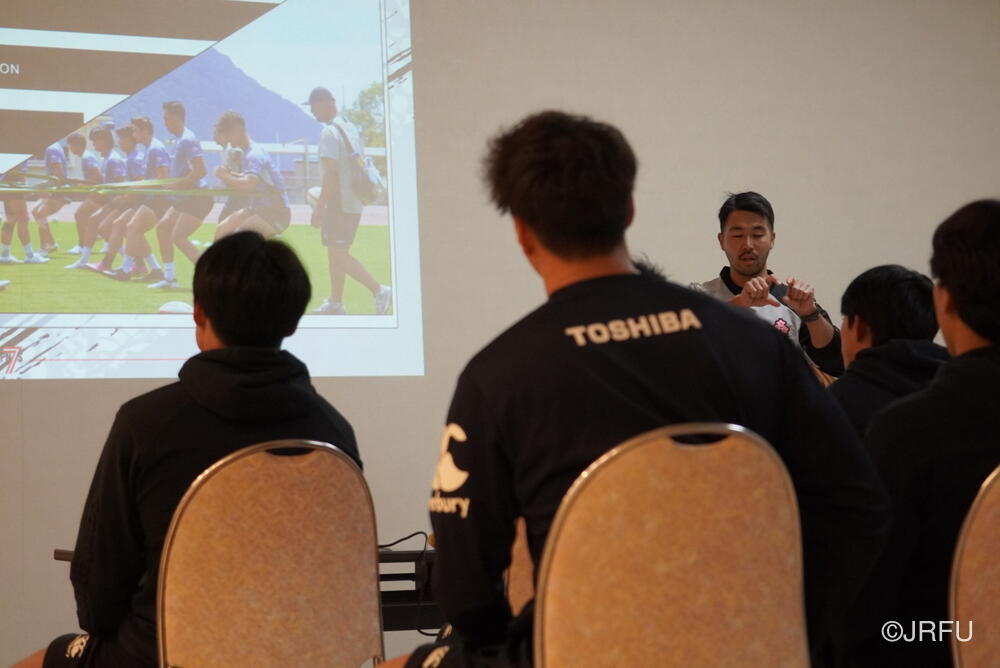 夜にはチームミーティングが行われました。西田 拓史 S&Cコーチより、合宿期間中のターゲットや合宿間の所属チームでの練習量の考え方、自身の状態あったセルフケアなど改めて意識すべきところについての話が選手に行われました。