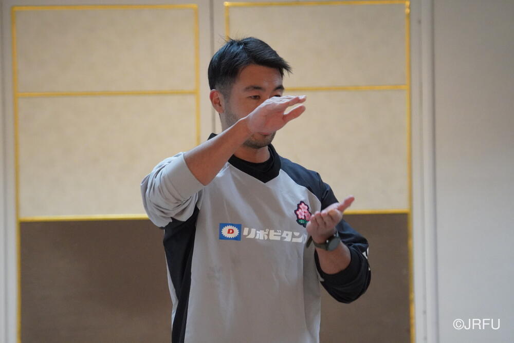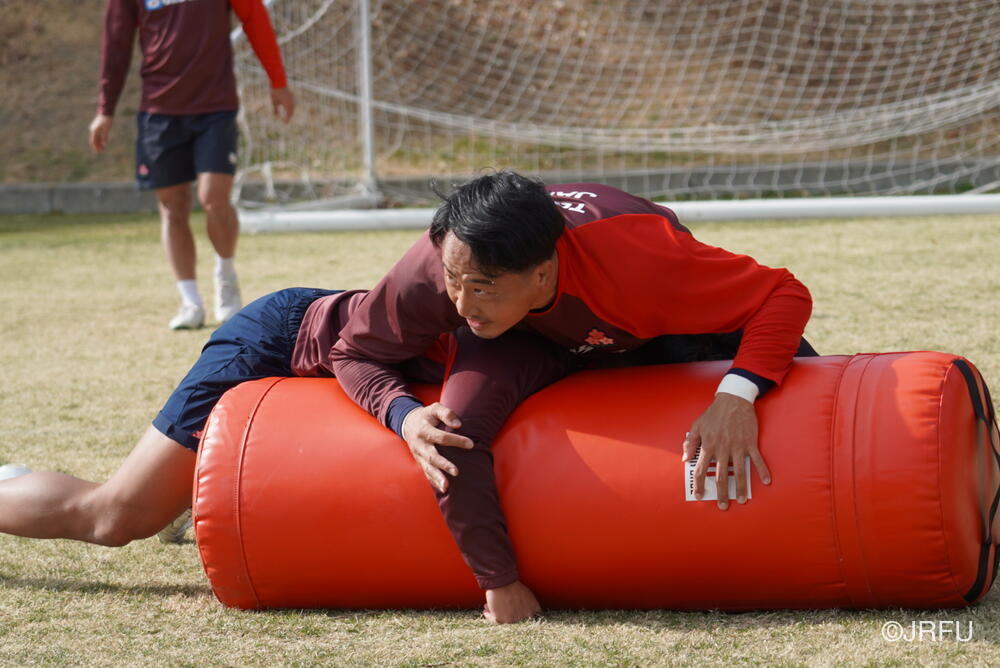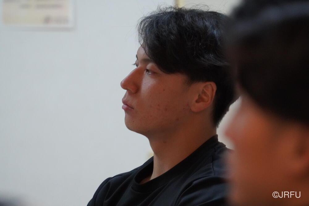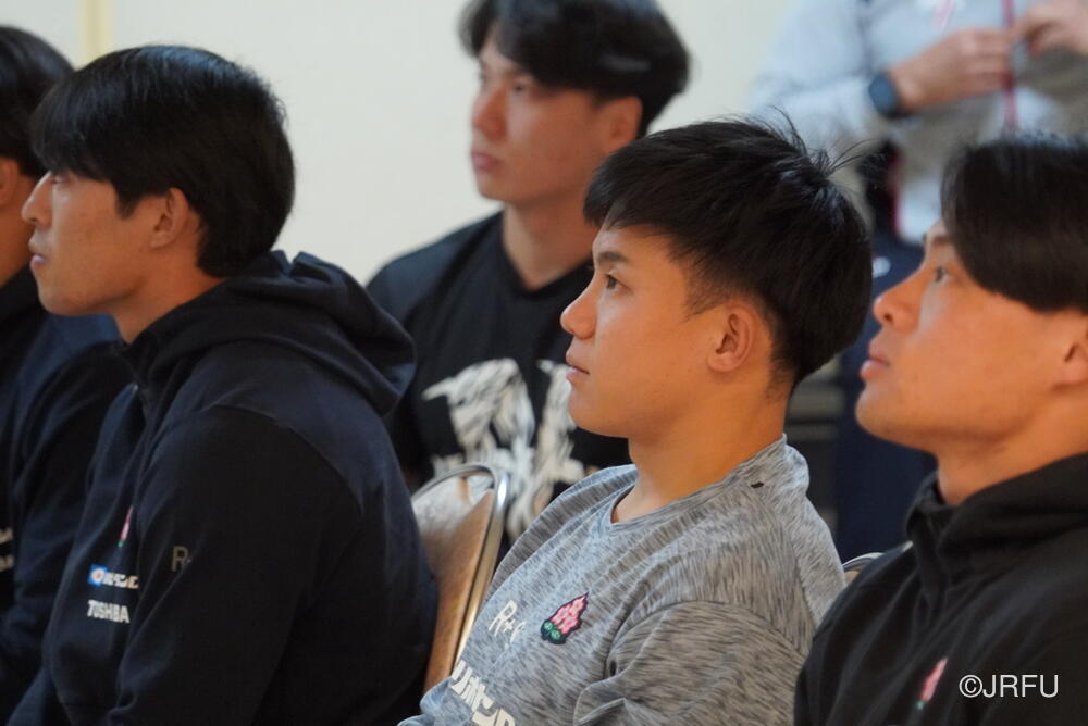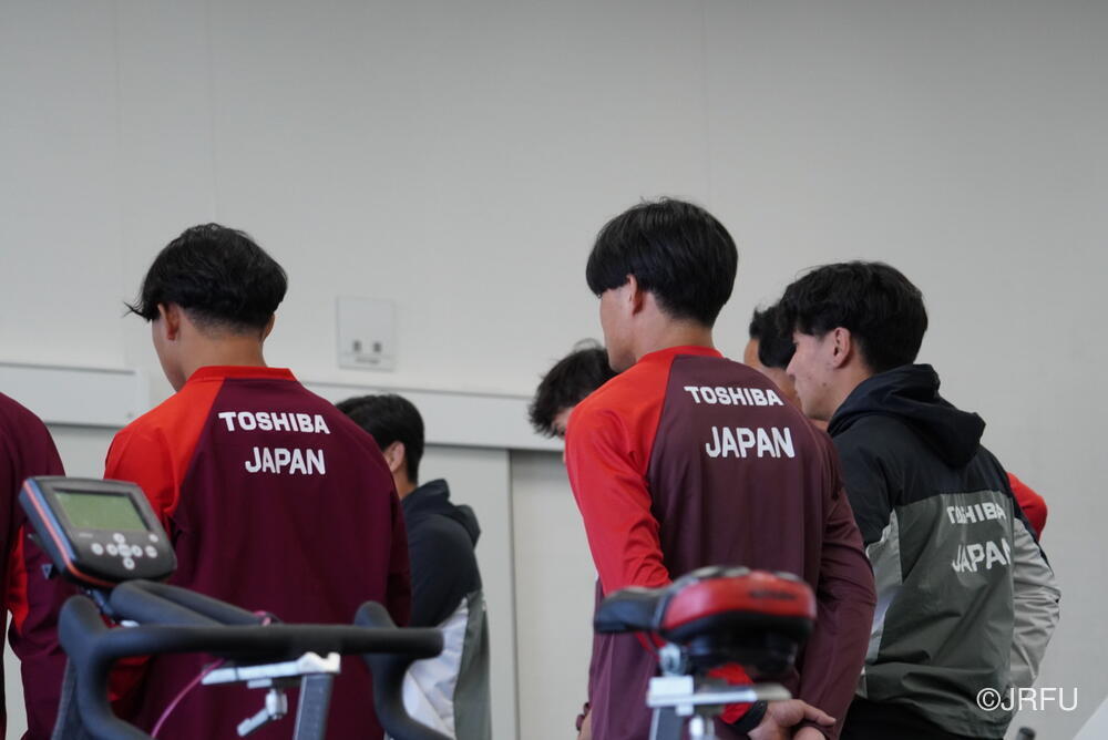 夜にはチームミーティングが行われました。西田 拓史 S&Cコーチより、合宿期間中のターゲットや合宿間の所属チームでの練習量の考え方、自身の状態あったセルフケアなど改めて意識すべきところについての話が選手に行われました。