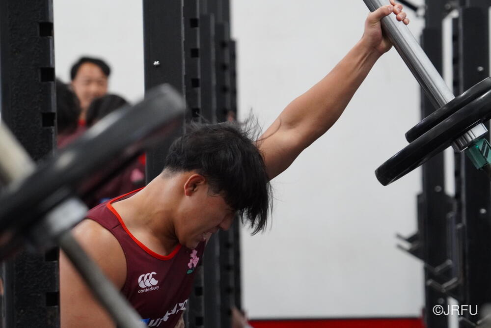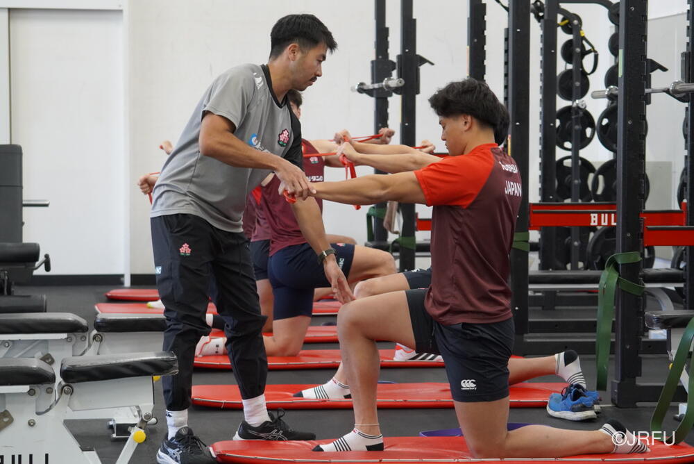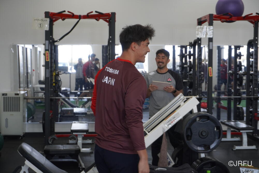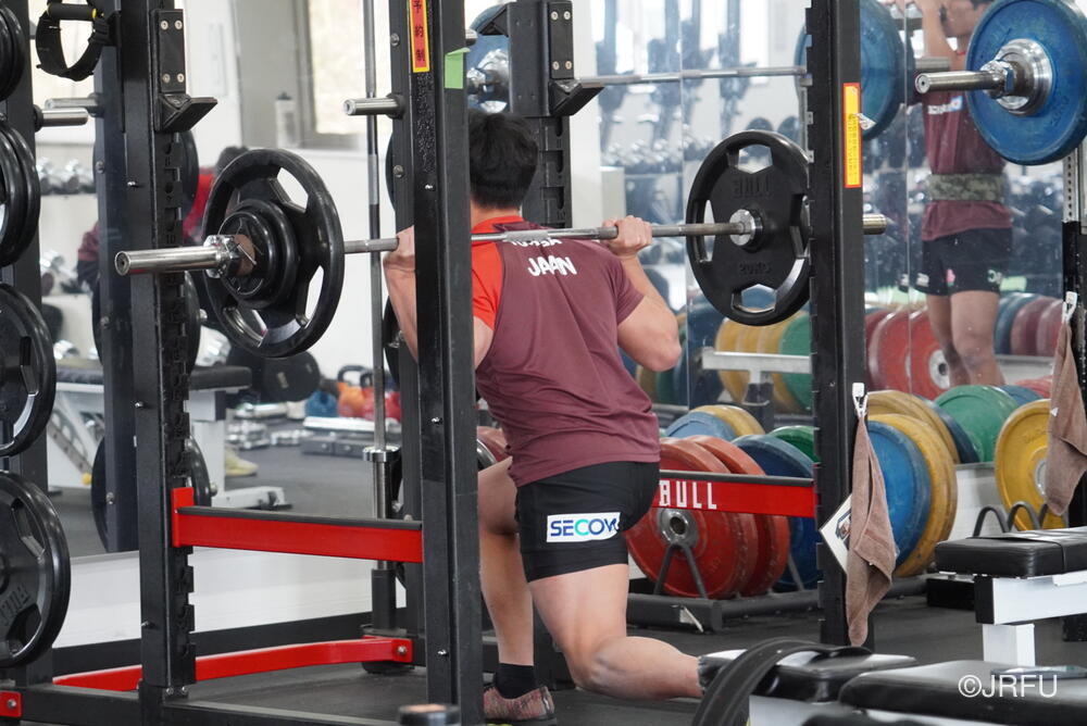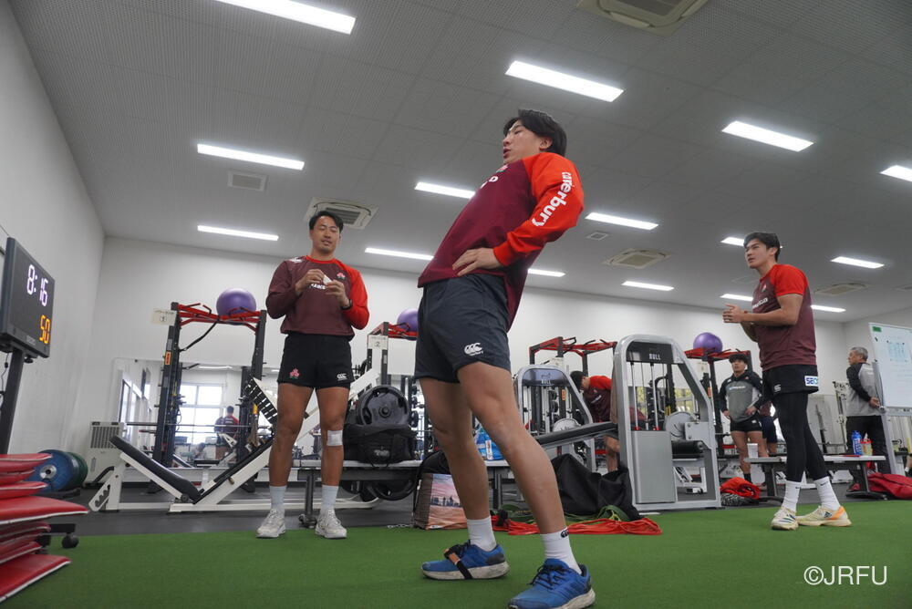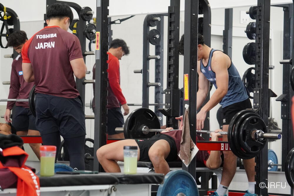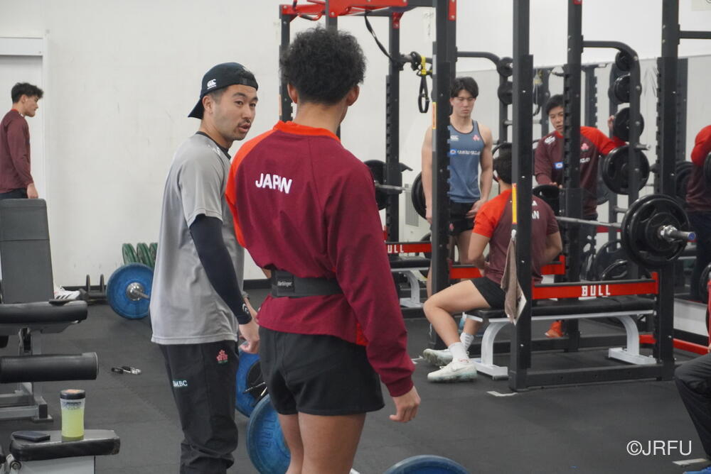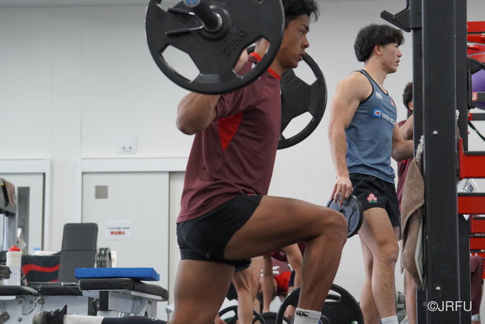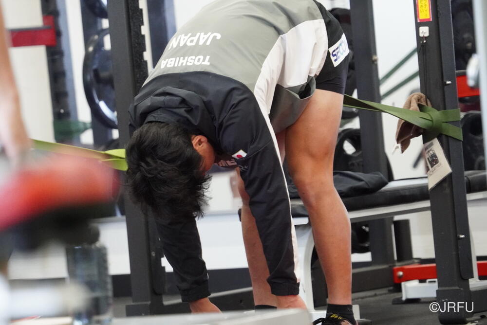 別府合宿6日目となった本日は、午前中に全身の瞬発力強化を目的としたジムセッションを実施しました。恒例の垂直跳び測定では、荻田 直弥選手(NECグリーンロケッツ東葛)が59.3cmを記録して本日のトップに!また、時任 澟空選手(福岡工業大学)は自己ベストを出し、選手たちは、日々成長しています。新しく参加した選手に対しては、西田 拓史 S&Cコーチがトレーニングの細かな手法を直接指導する場面もあり、世界で戦うためのフィジカル基盤をチーム全体で底上げしています。