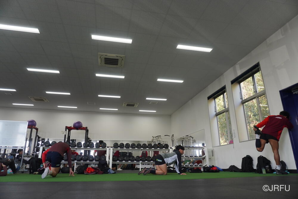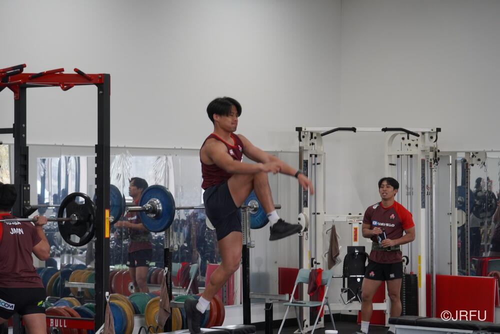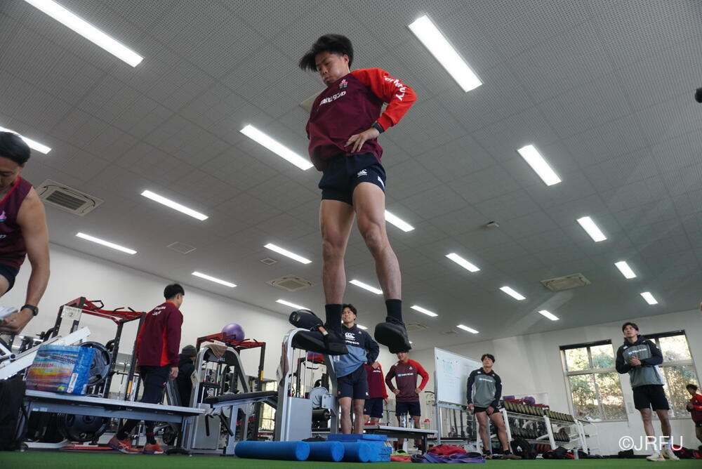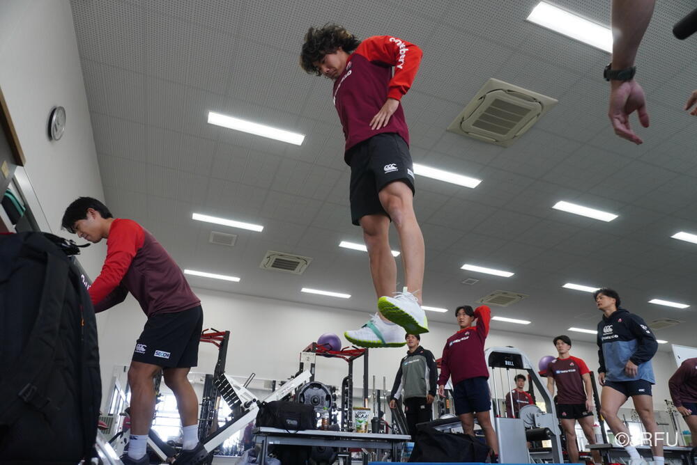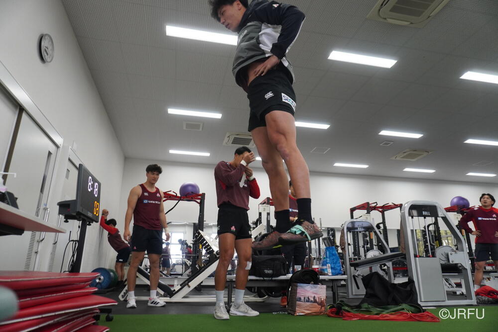 本日は、午前中にジムでのアクティブリカバリーとフィールドでのスキルセッションを実施しました。ジムセッションは、チーム恒例となっている垂直跳びの測定からスタート。連日のハードな練習による疲労が蓄積している時期ですが、本日のトップは66.1cmを記録した荻田直弥選手でした。自己ベストに近い驚異的な跳躍を見せました。