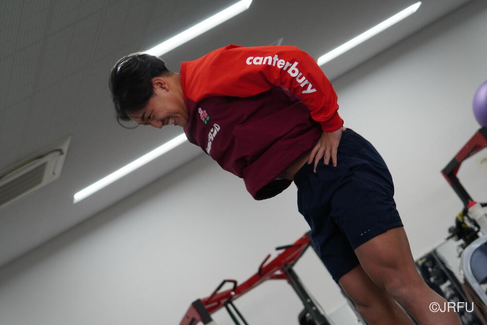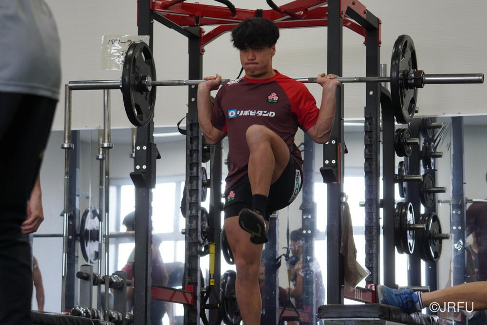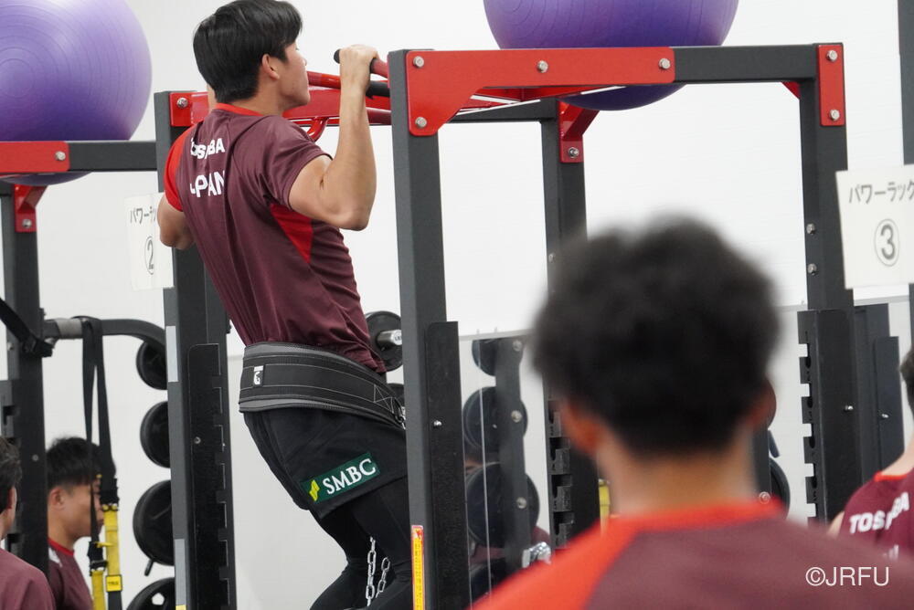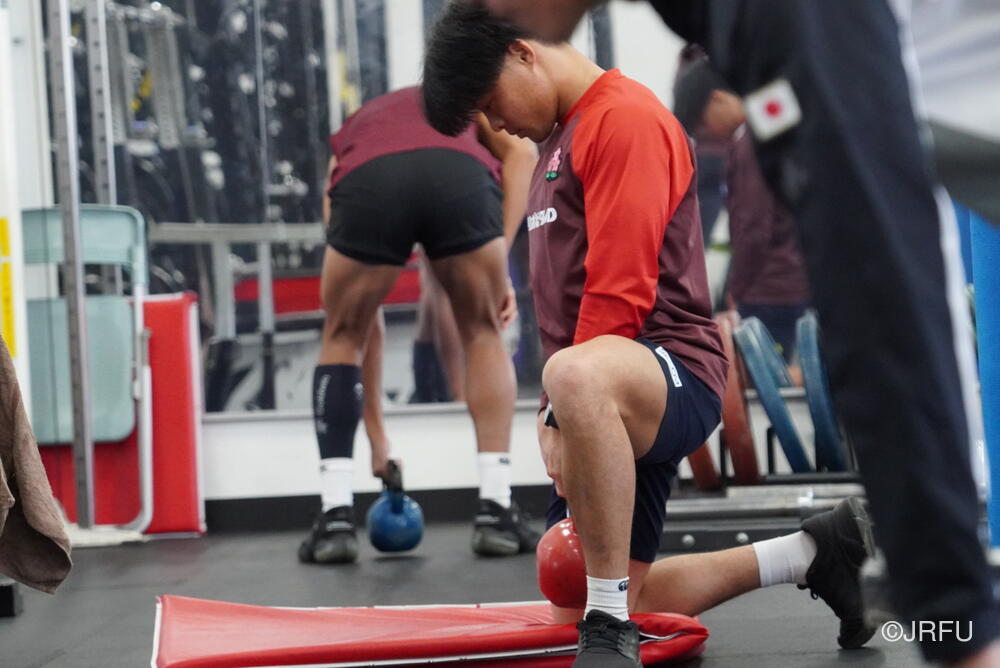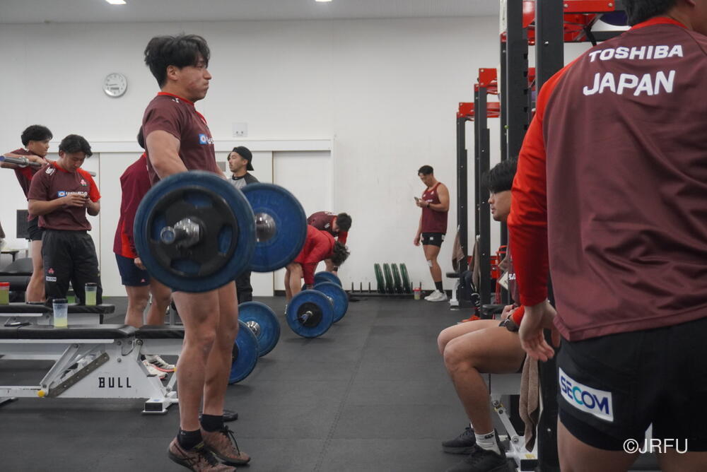 本日は、午前中にジムでのアクティブリカバリーとフィールドでのスキルセッションを実施しました。ジムセッションは、チーム恒例となっている垂直跳びの測定からスタート。連日のハードな練習による疲労が蓄積している時期ですが、本日のトップは66.1cmを記録した荻田直弥選手でした。自己ベストに近い驚異的な跳躍を見せました。