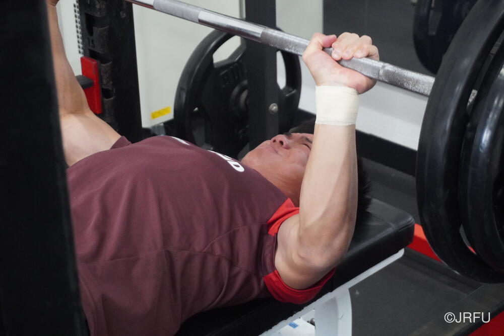 午前中のジムセッションでは、上半身を中心としたトレーニングを行いました。単に重いものを持ち上げるだけでなく、スピードを確認しながら「スピード×筋力」を強く意識し、実戦で通用するパワー出力を追求しました。