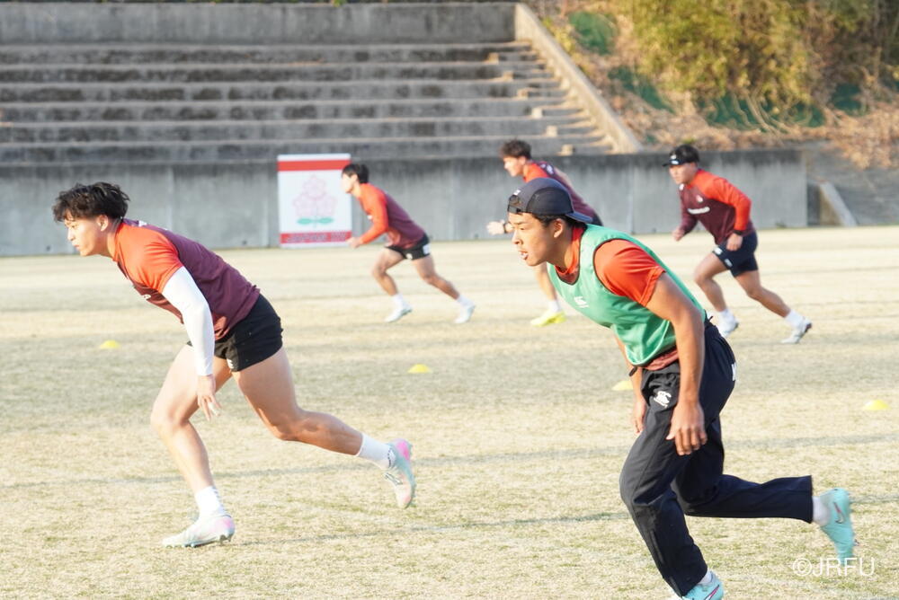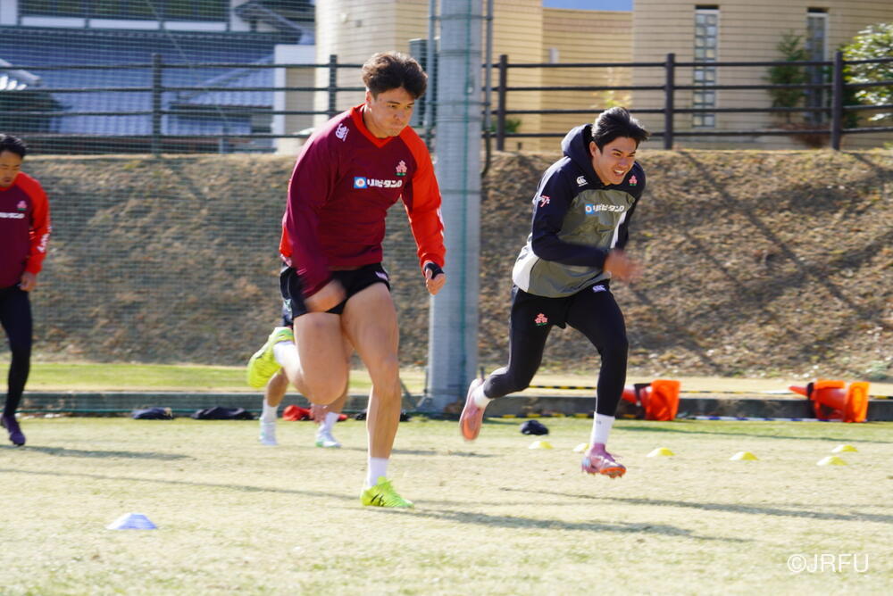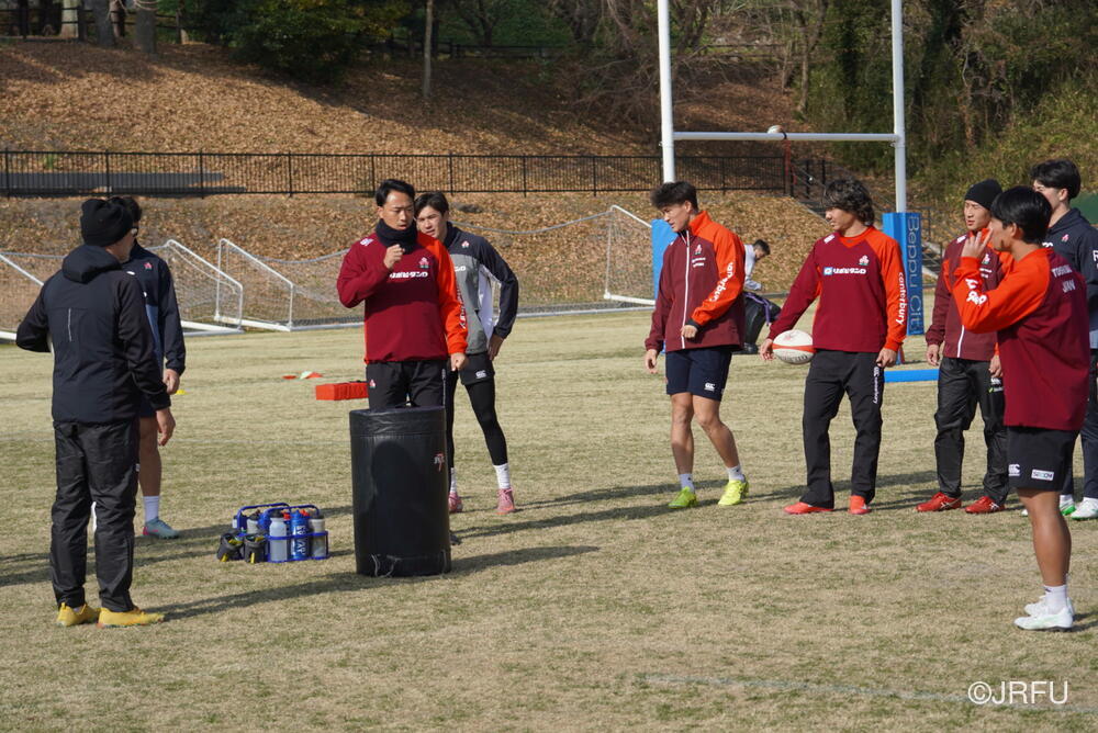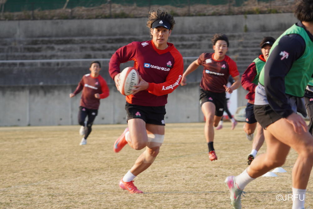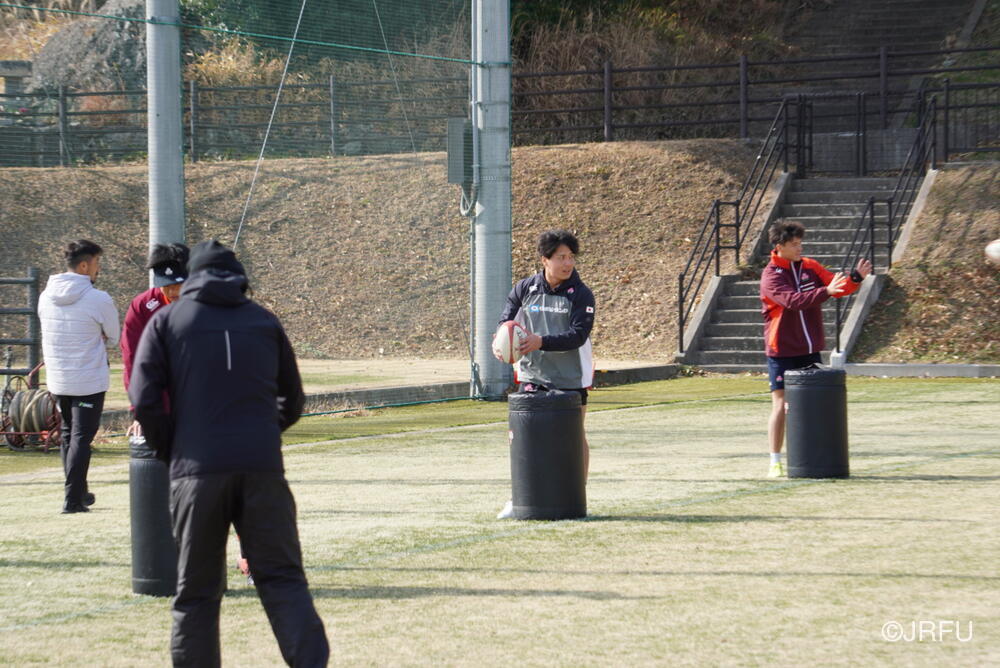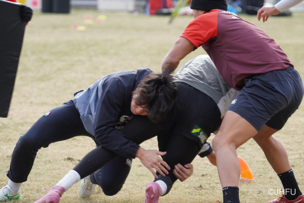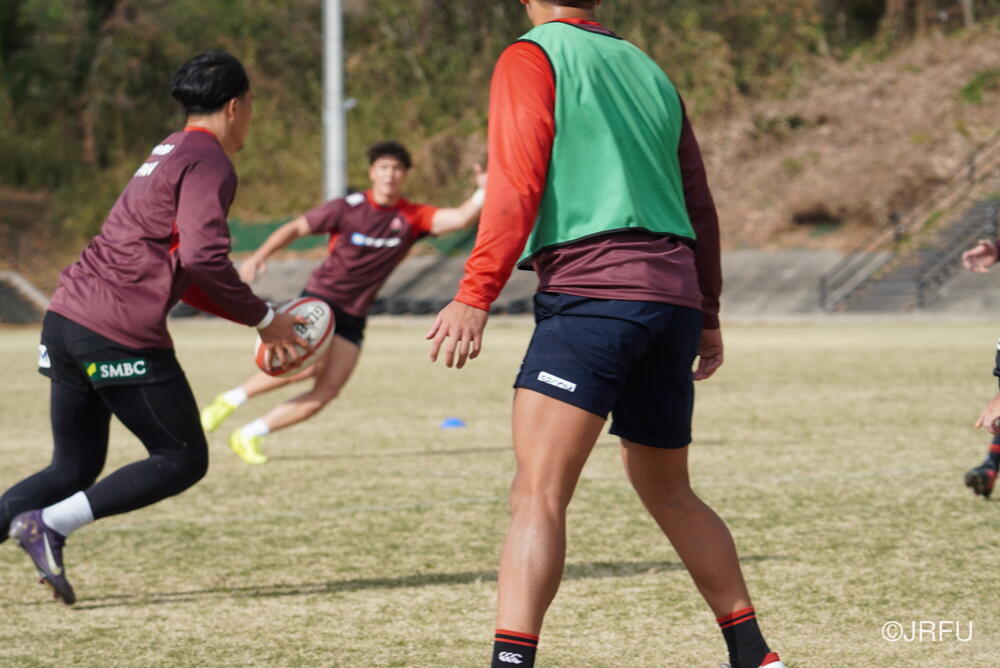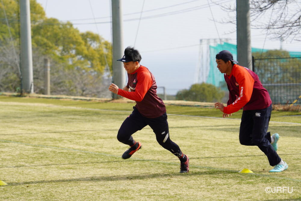 その後の午前中のグラウンド練習は、厳しい寒さの中、スピードトレーニングからスタートしました。「自身の最大スピードの90%以上を出す」ことを目標に掲げ、高い出力を意識させるようトレーニングを行いました。その後、スピードに乗った状態でのアタック練習へと移行しました。ラグビーの動きの中でいかにスピードを発揮するか、早いスピードの中での判断を追求したセッションとなりました。