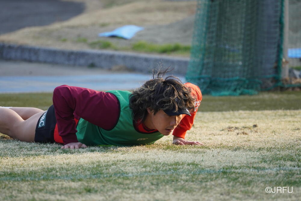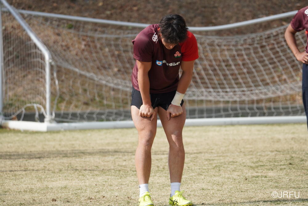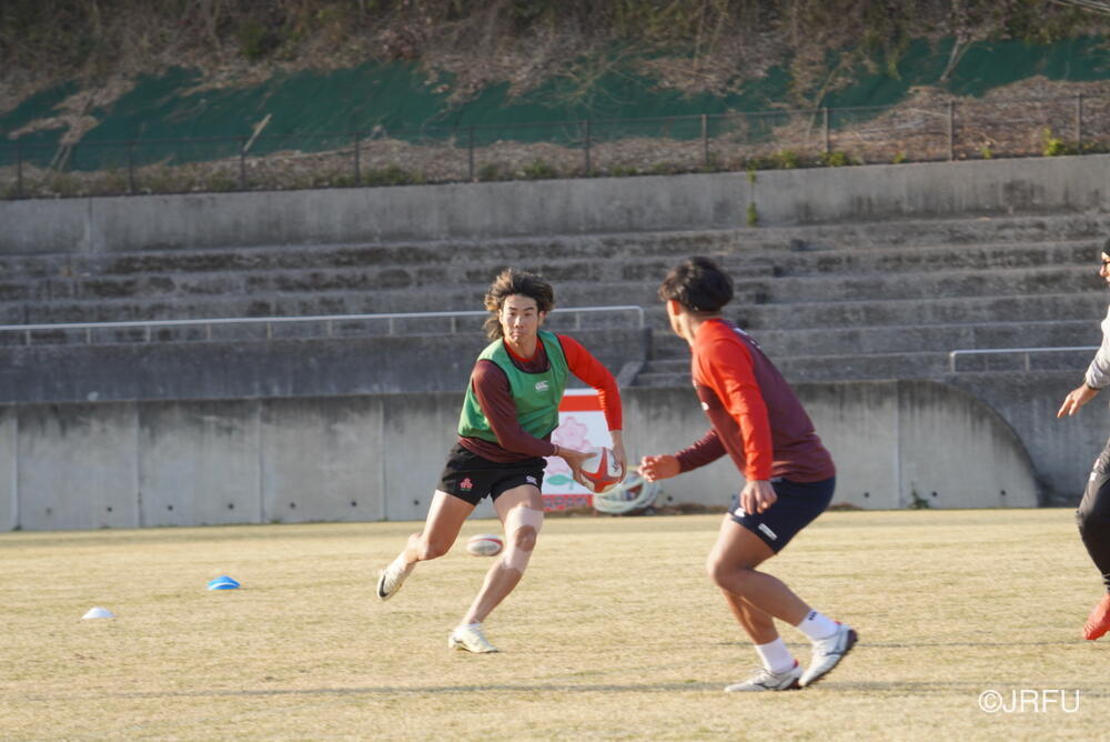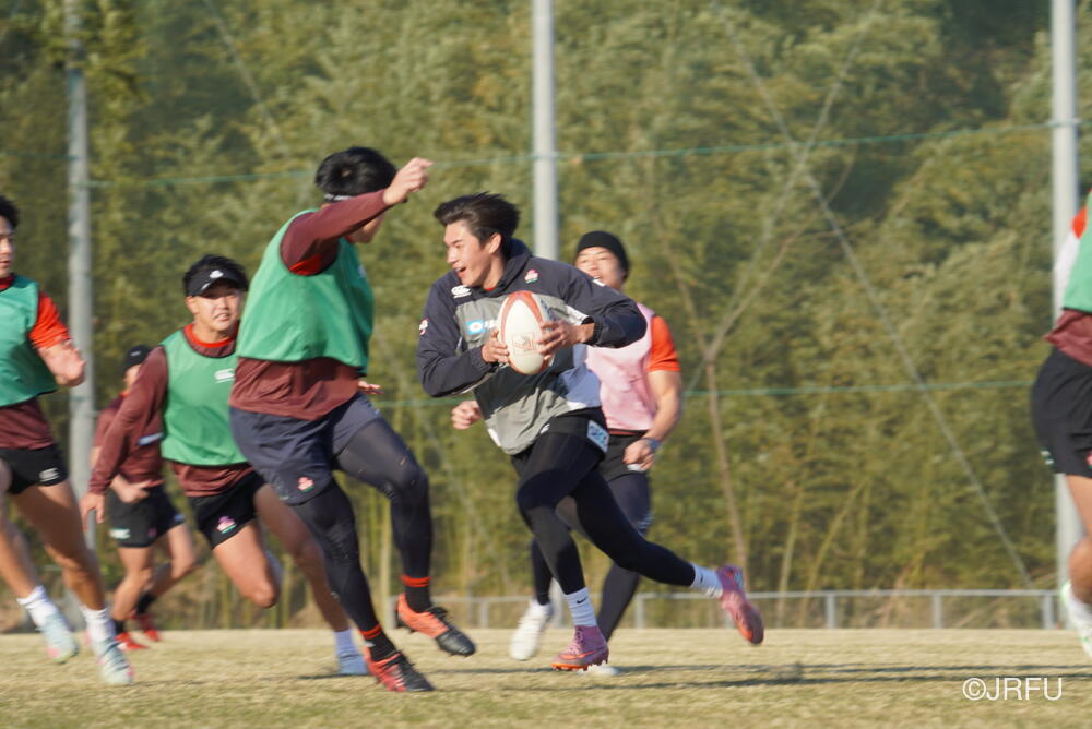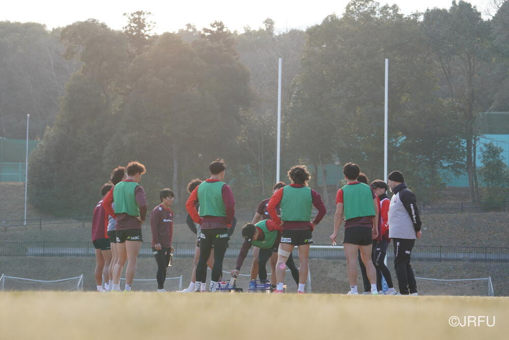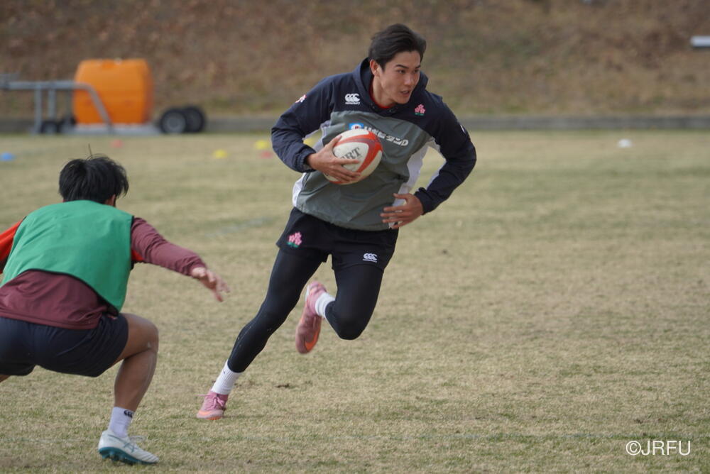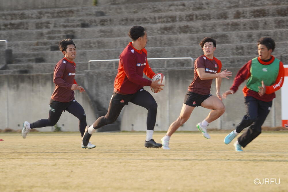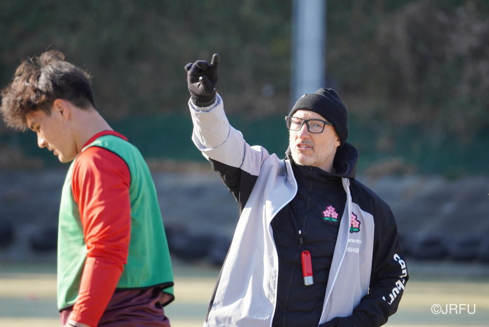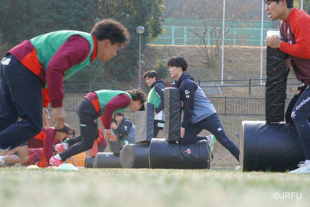 その後の午前中のグラウンド練習は、厳しい寒さの中、スピードトレーニングからスタートしました。「自身の最大スピードの90%以上を出す」ことを目標に掲げ、高い出力を意識させるようトレーニングを行いました。その後、スピードに乗った状態でのアタック練習へと移行しました。ラグビーの動きの中でいかにスピードを発揮するか、早いスピードの中での判断を追求したセッションとなりました。