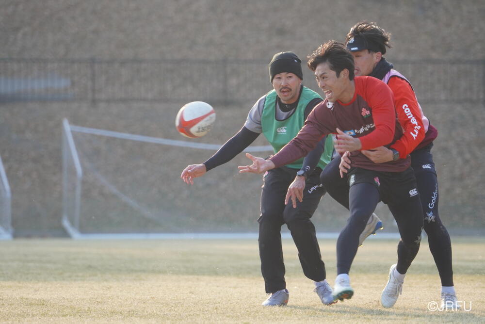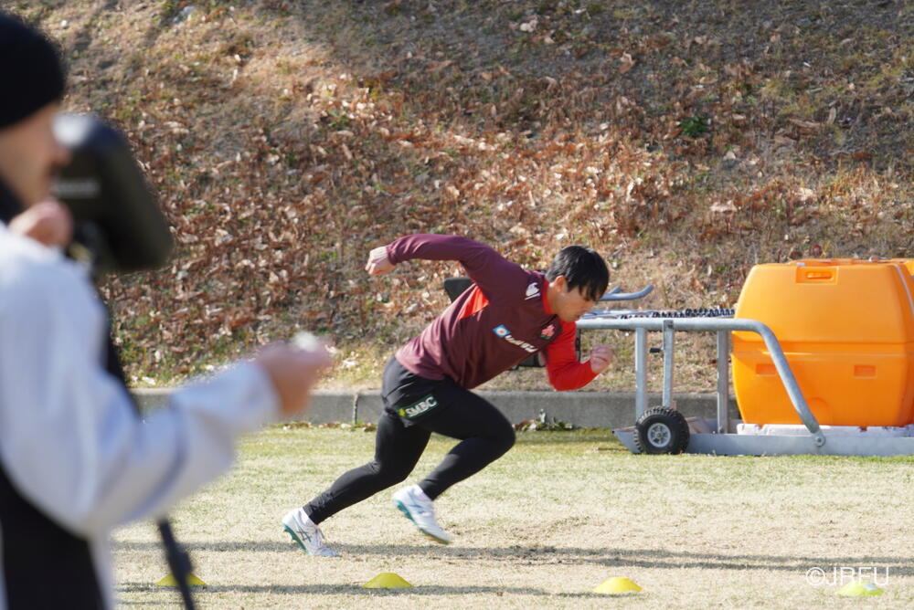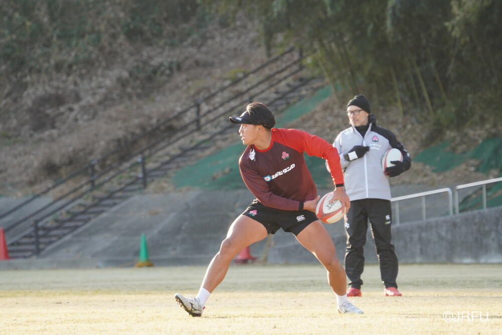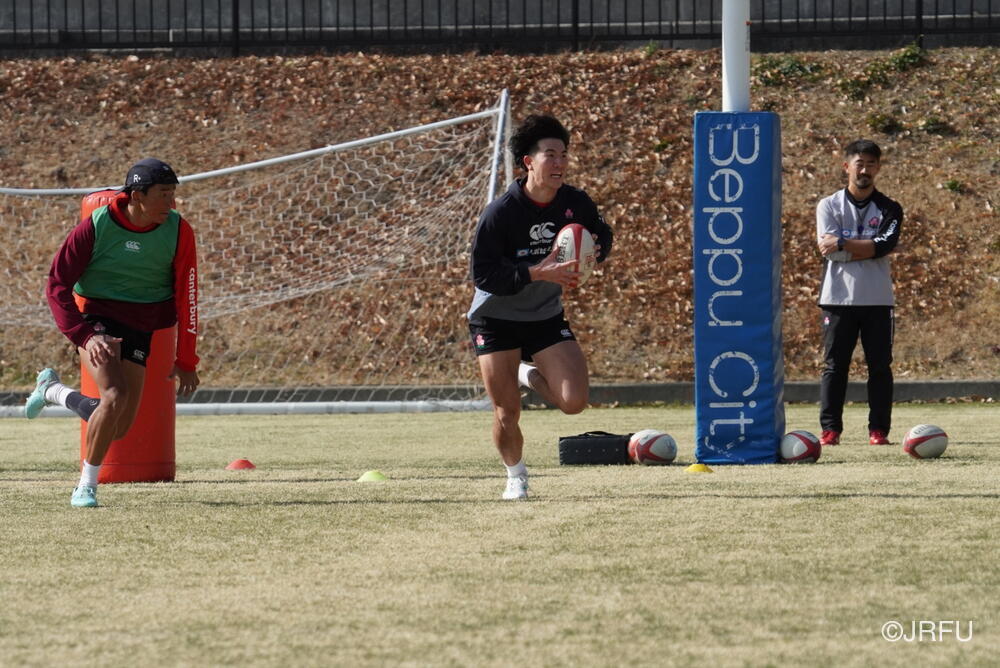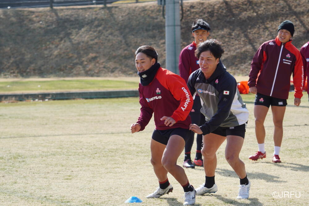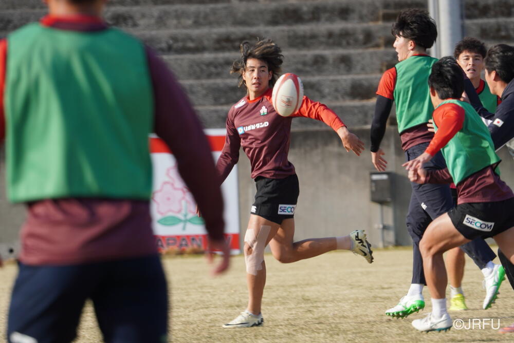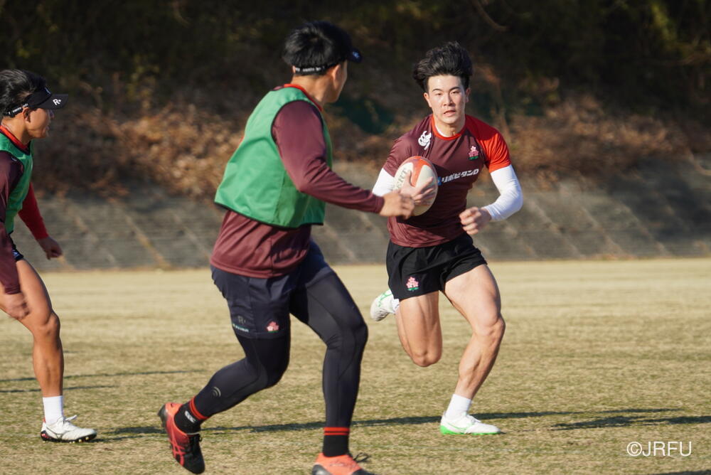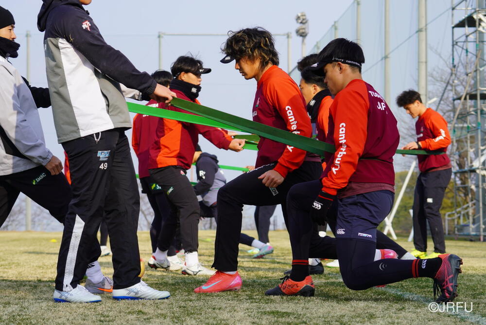その後の午前中のグラウンド練習は、厳しい寒さの中、スピードトレーニングからスタートしました。「自身の最大スピードの90%以上を出す」ことを目標に掲げ、高い出力を意識させるようトレーニングを行いました。その後、スピードに乗った状態でのアタック練習へと移行しました。ラグビーの動きの中でいかにスピードを発揮するか、早いスピードの中での判断を追求したセッションとなりました。