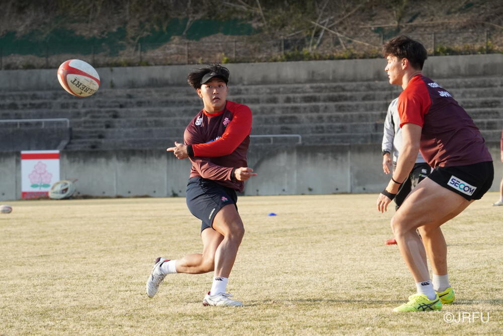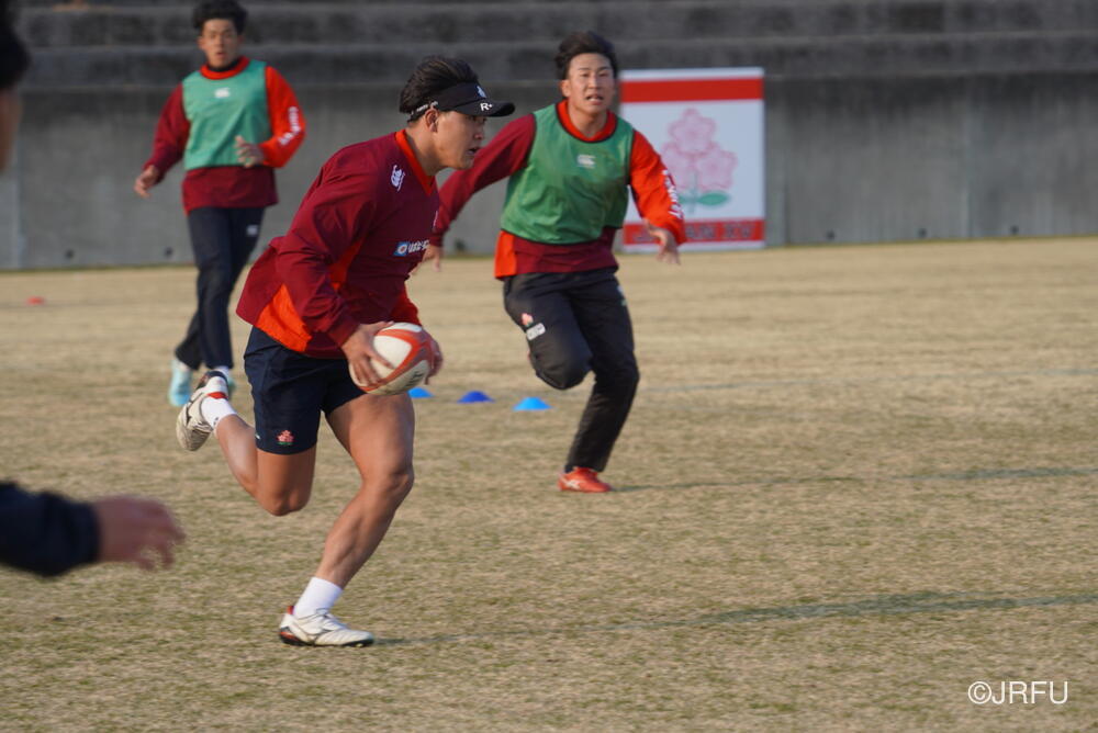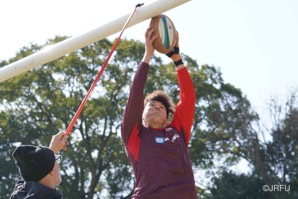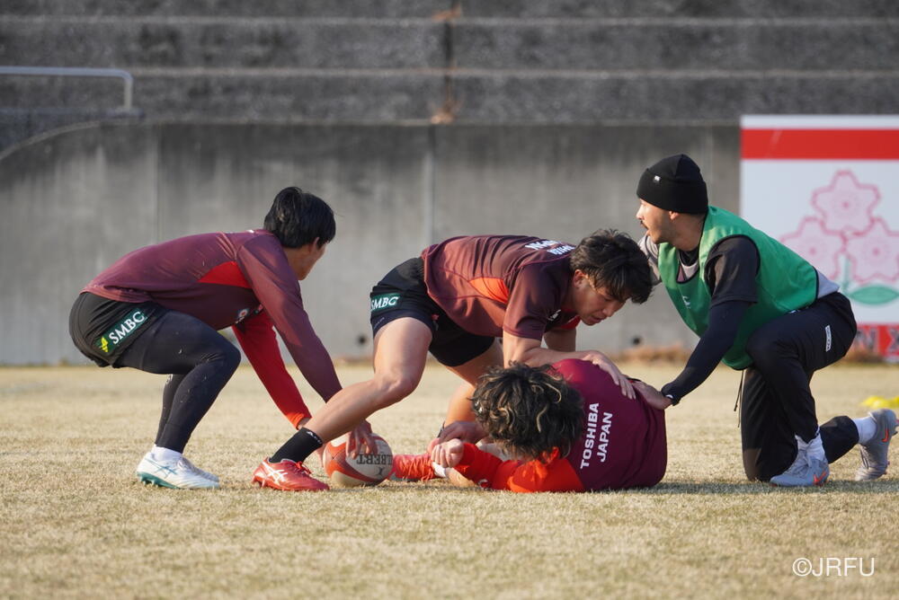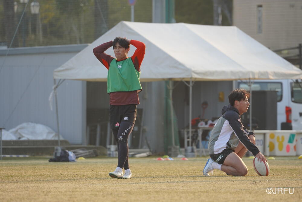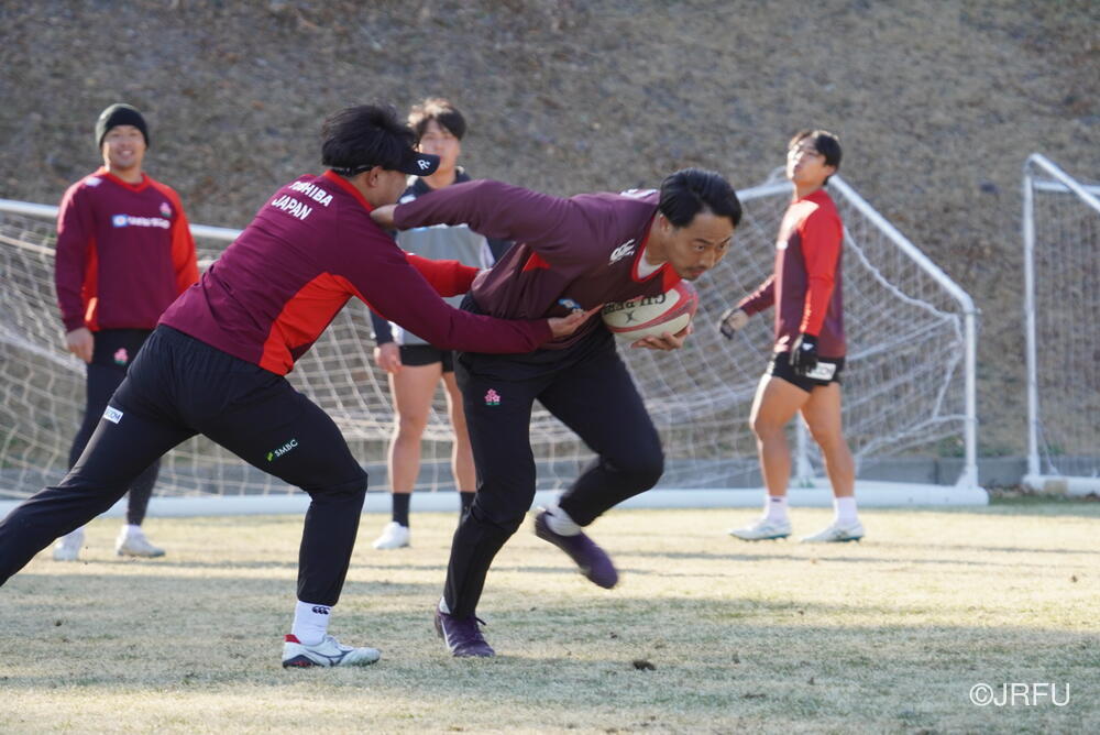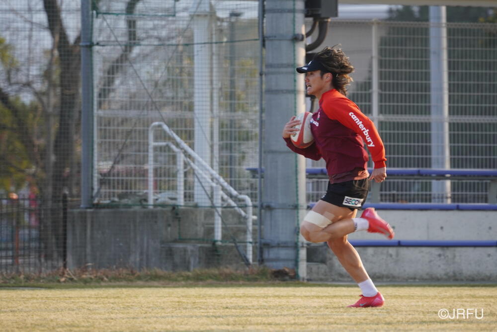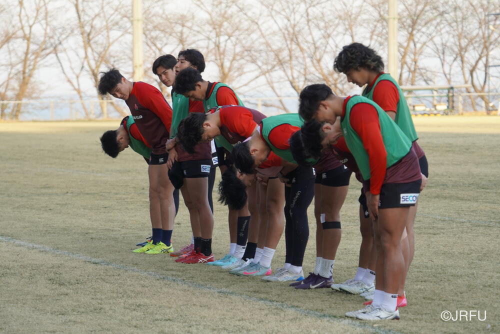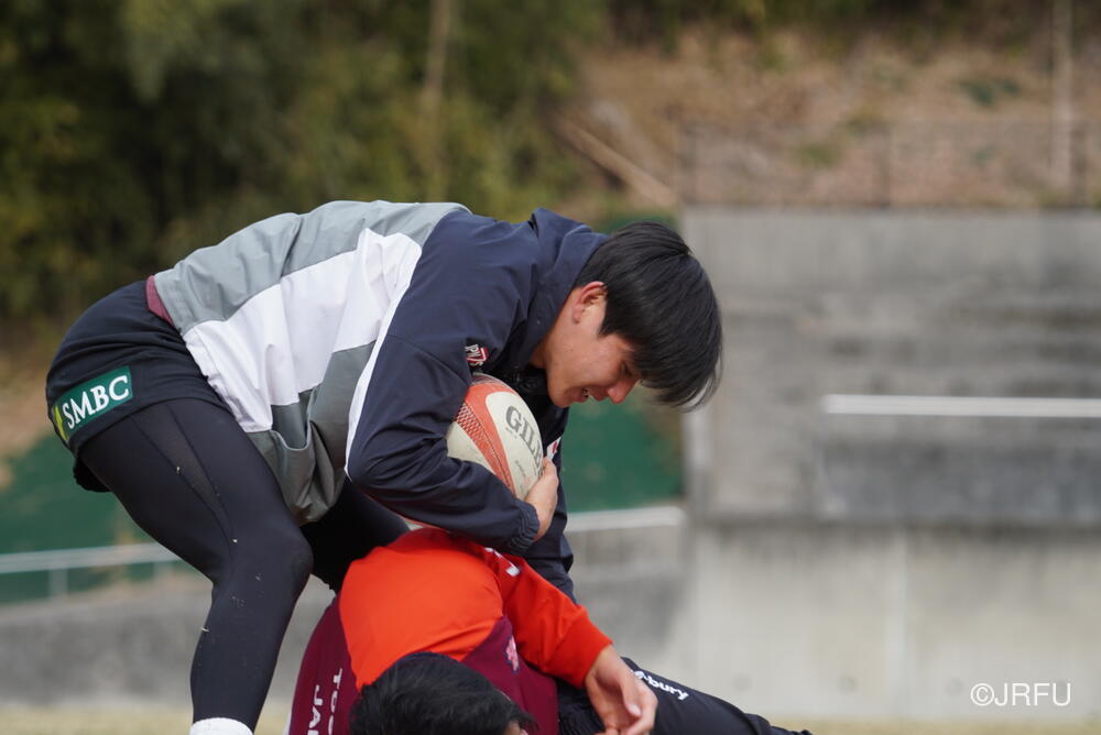 その後の午前中のグラウンド練習は、厳しい寒さの中、スピードトレーニングからスタートしました。「自身の最大スピードの90%以上を出す」ことを目標に掲げ、高い出力を意識させるようトレーニングを行いました。その後、スピードに乗った状態でのアタック練習へと移行しました。ラグビーの動きの中でいかにスピードを発揮するか、早いスピードの中での判断を追求したセッションとなりました。
