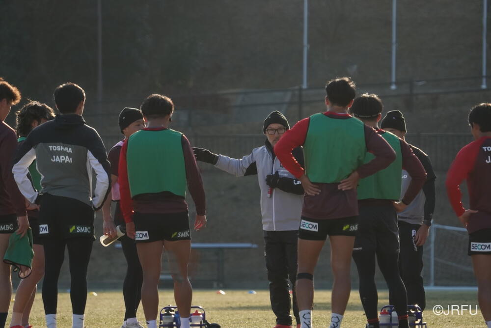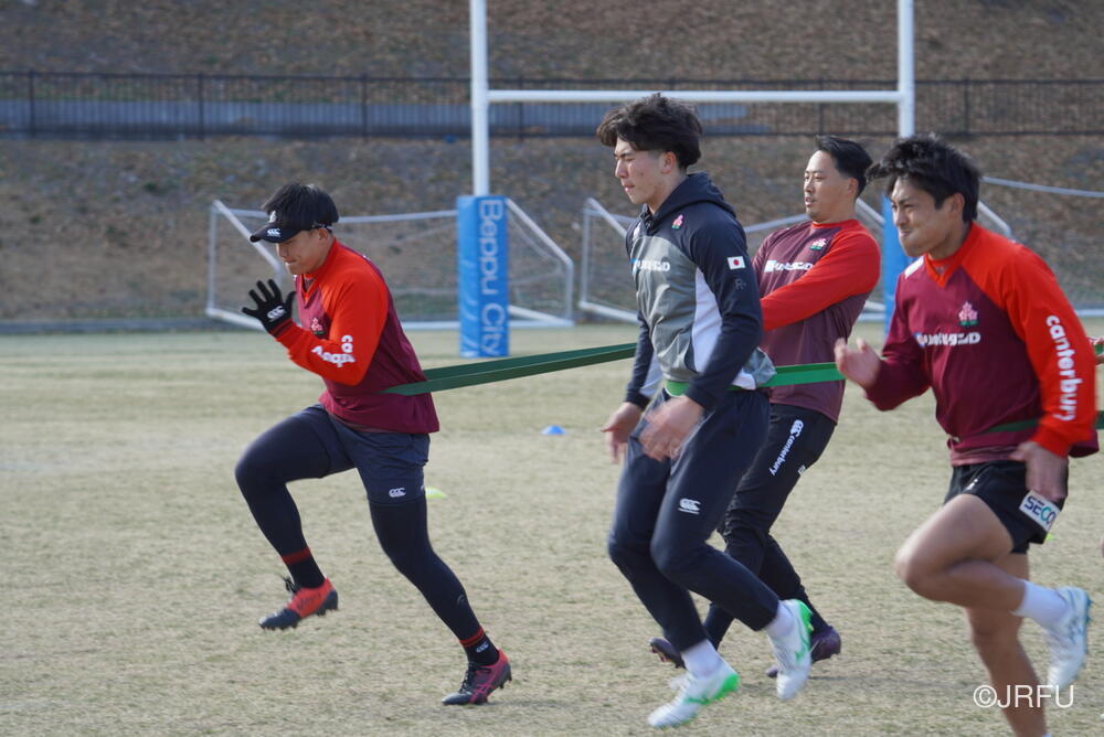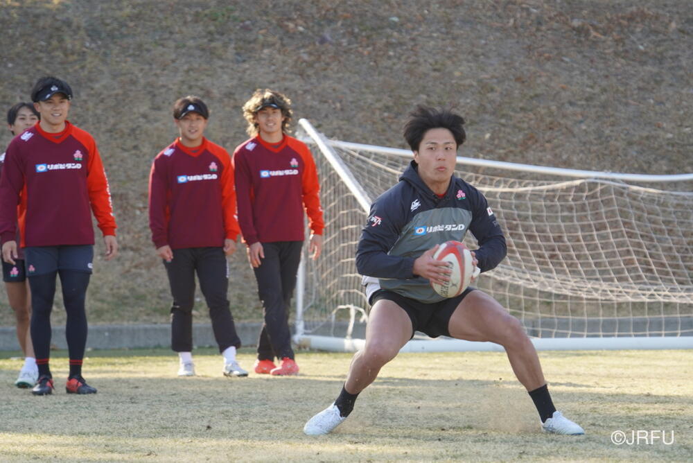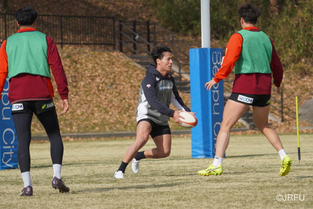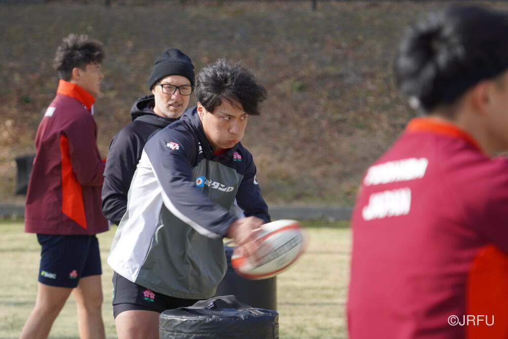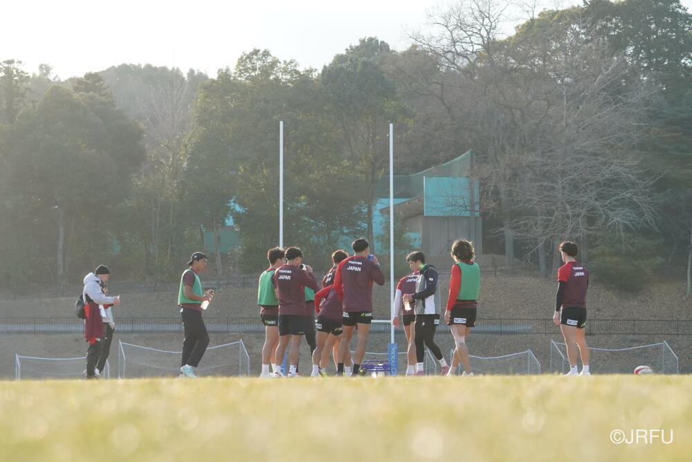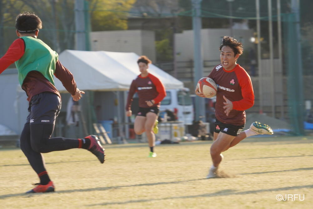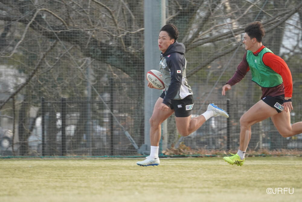 その後の午前中のグラウンド練習は、厳しい寒さの中、スピードトレーニングからスタートしました。「自身の最大スピードの90%以上を出す」ことを目標に掲げ、高い出力を意識させるようトレーニングを行いました。その後、スピードに乗った状態でのアタック練習へと移行しました。ラグビーの動きの中でいかにスピードを発揮するか、早いスピードの中での判断を追求したセッションとなりました。