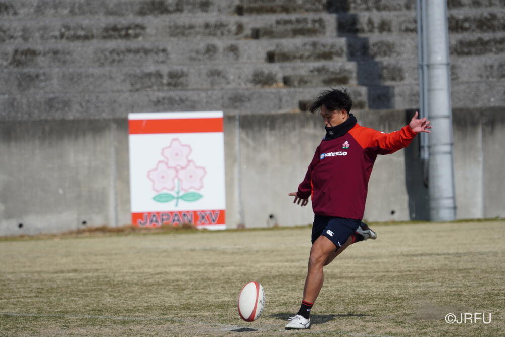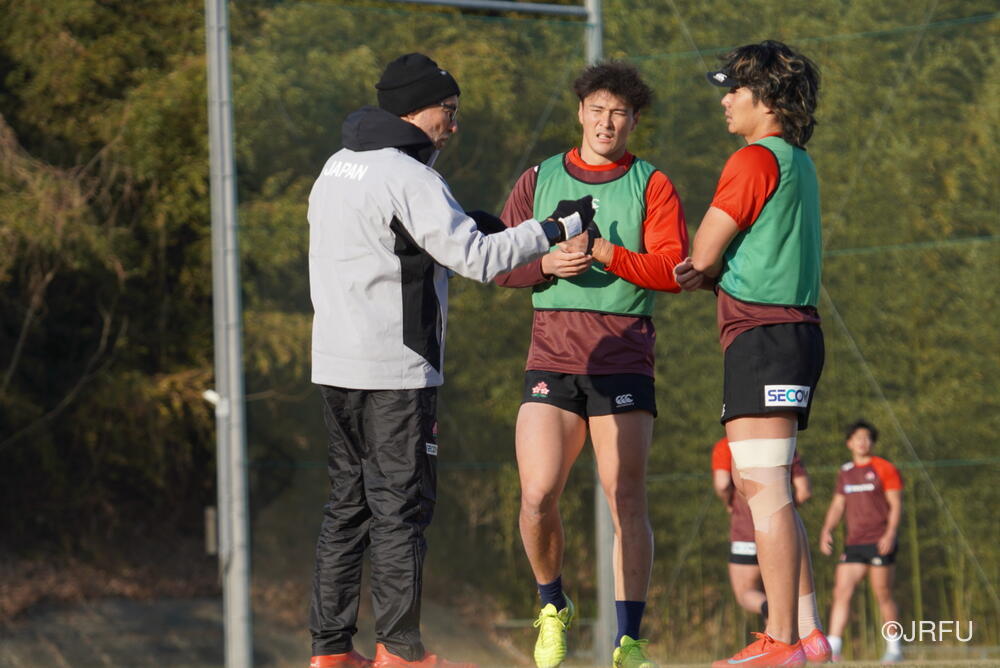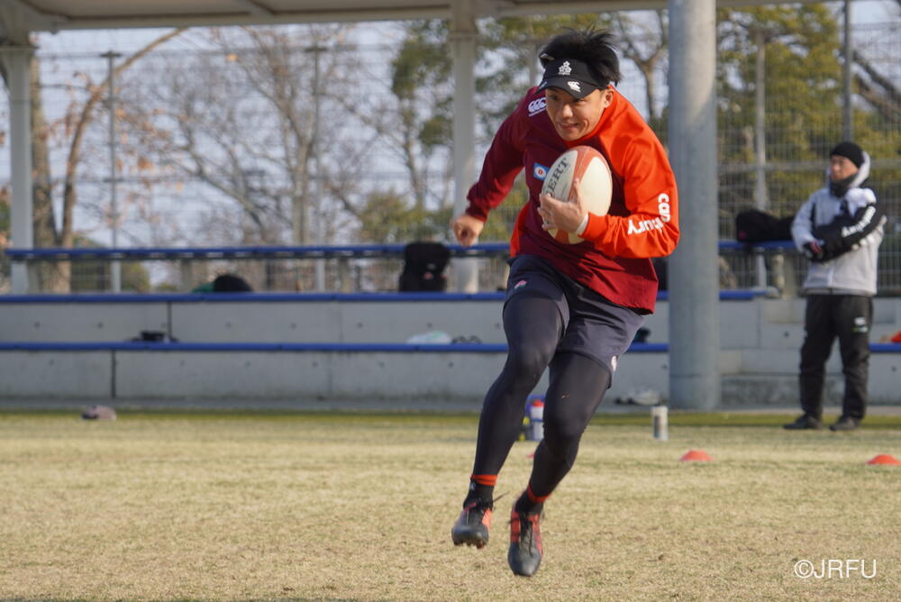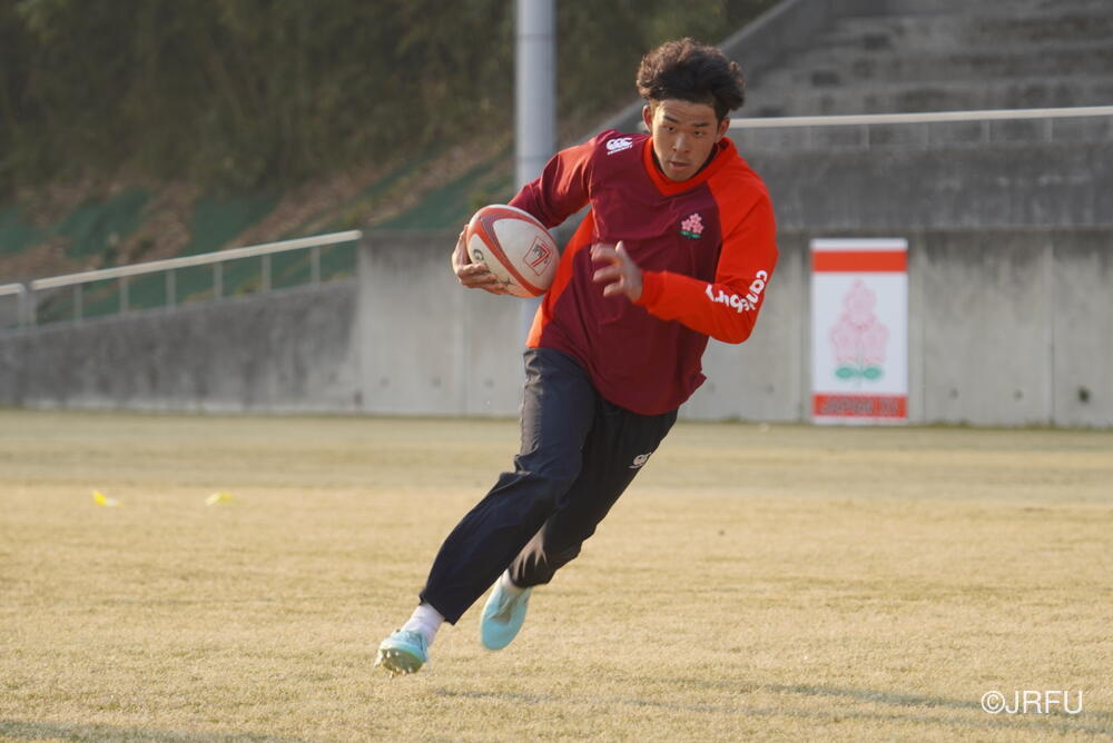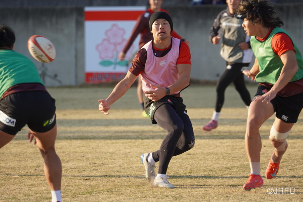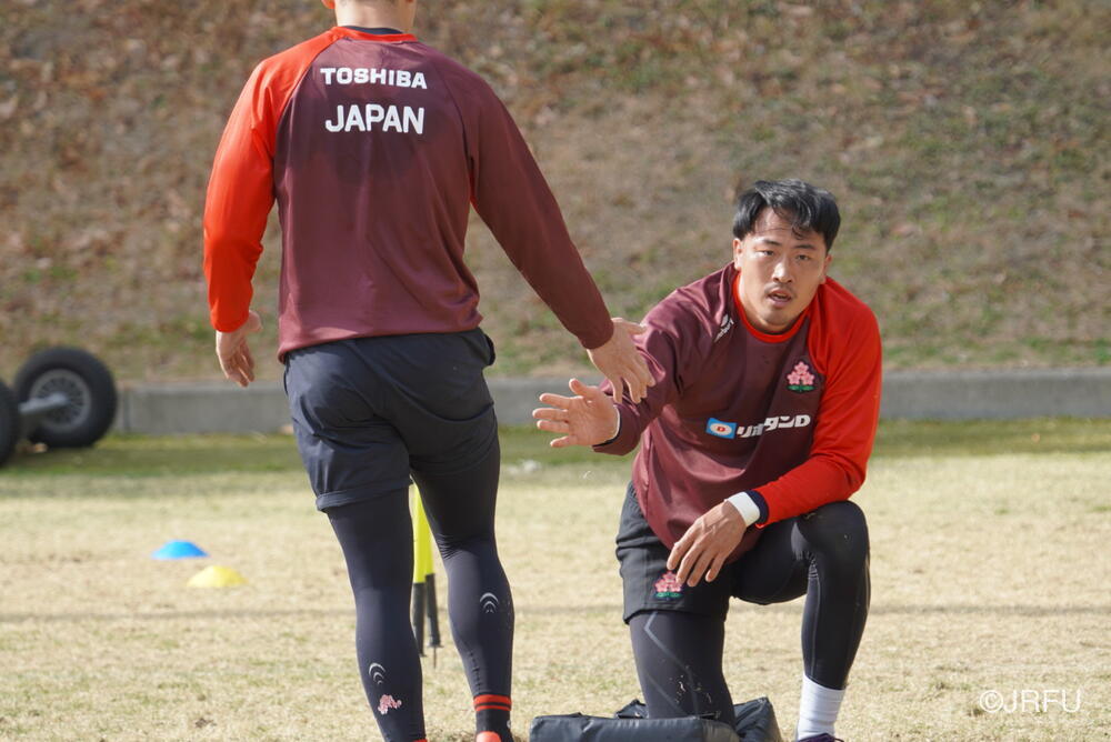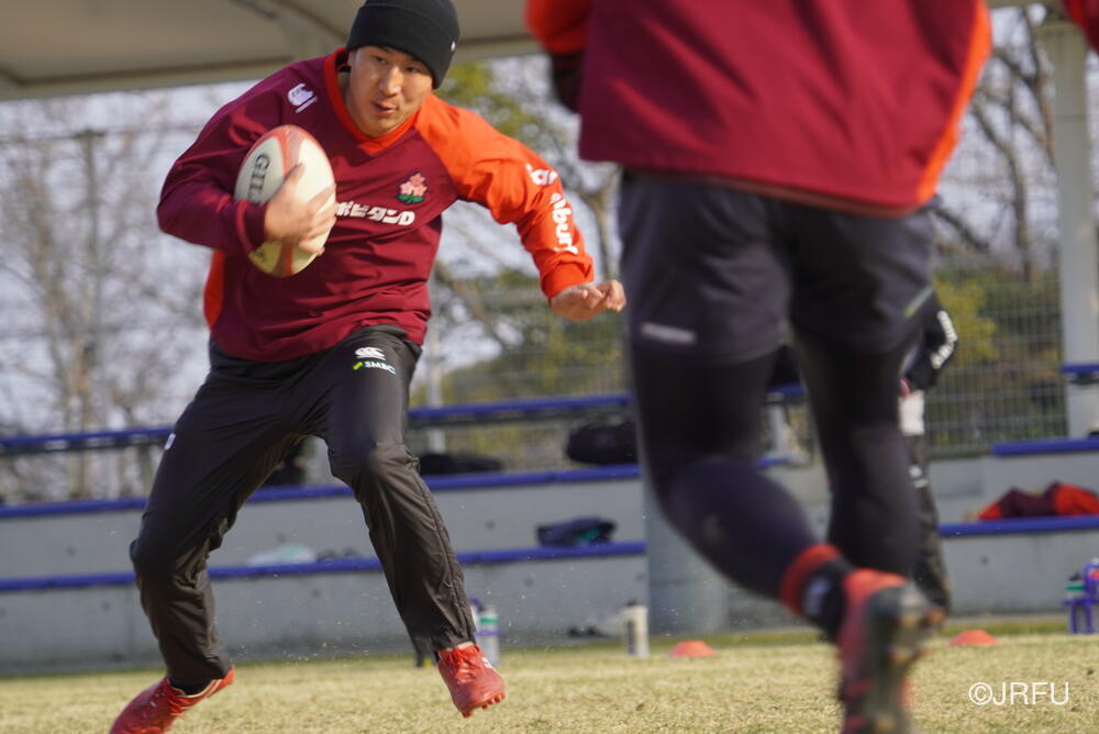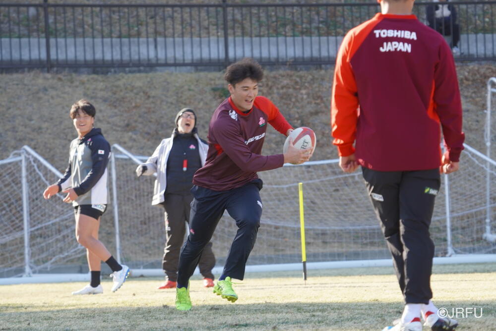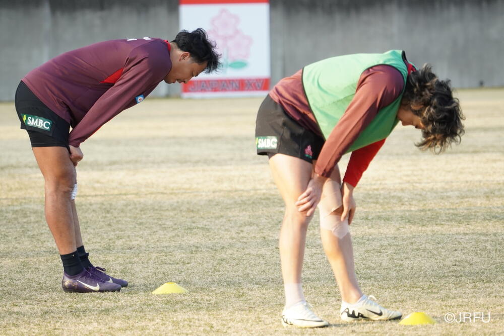 その後の午前中のグラウンド練習は、厳しい寒さの中、スピードトレーニングからスタートしました。「自身の最大スピードの90%以上を出す」ことを目標に掲げ、高い出力を意識させるようトレーニングを行いました。その後、スピードに乗った状態でのアタック練習へと移行しました。ラグビーの動きの中でいかにスピードを発揮するか、早いスピードの中での判断を追求したセッションとなりました。