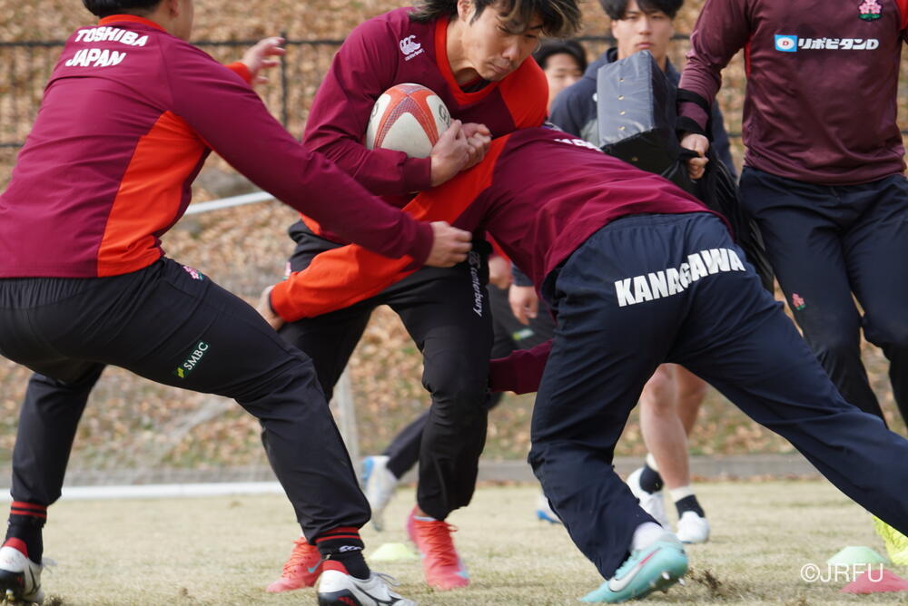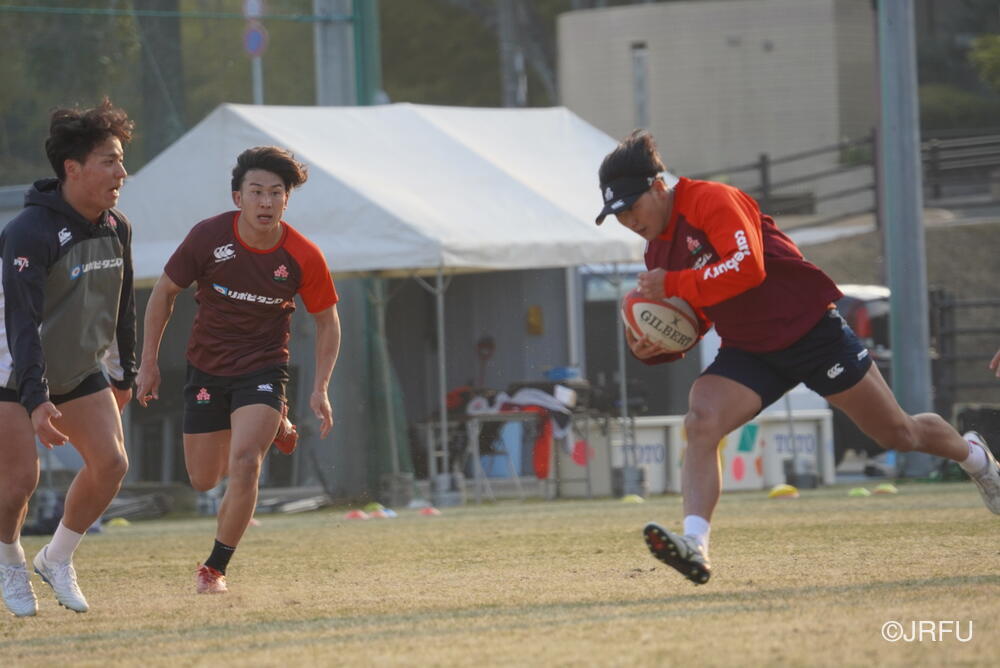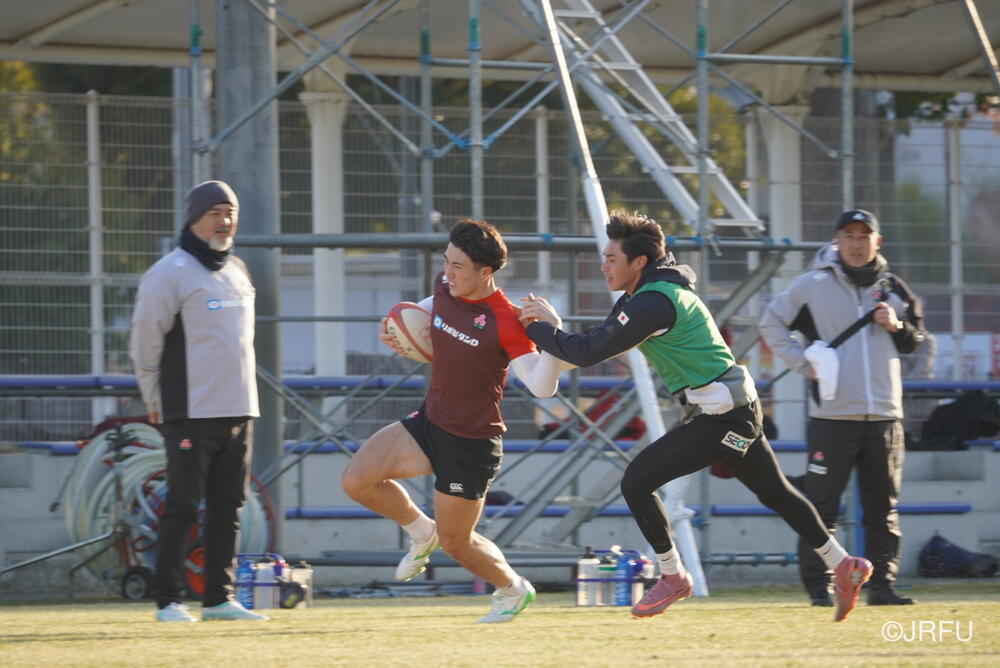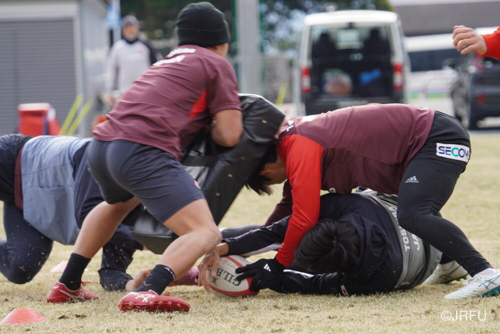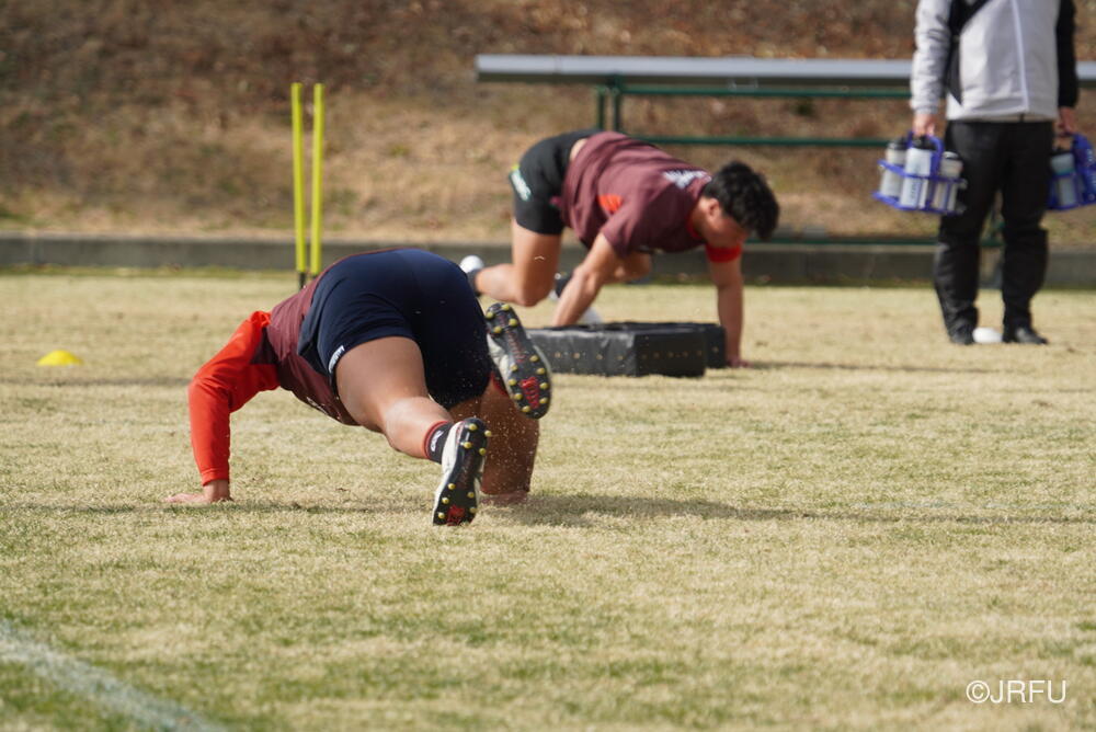 その後はフィールド練習へと移り、ブレイクダウンやコンバット(対人)の要素を盛り込んだトレーニングを実施。また、アタック練習を行い、息の上がった状態の中でのスキル発揮に重点を置きました。