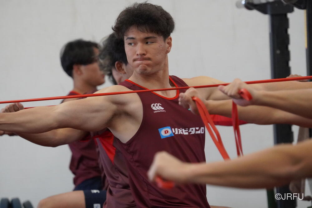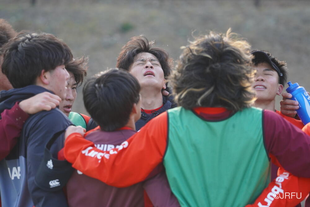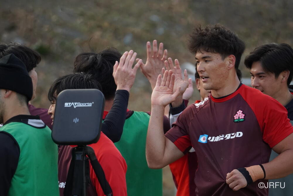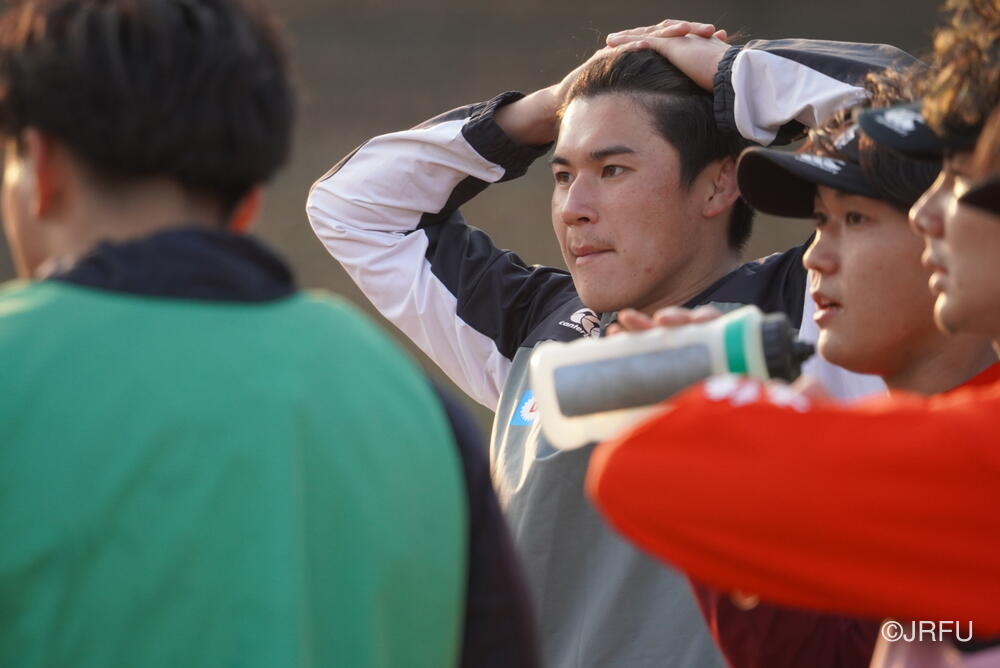 午後のフィールド練習では、コンバット練習を交え、より実戦に近い負荷をかけながらのアタック練習を行いました。激しい動きで息が上がった状況下でも、アタックの実行精度を落とさないことにフォーカス。自分たちが有利なシチュエーションを確実にスコアへ結びつける、トライを取り切る部分に徹底してこだわったトレーニングとなりました。