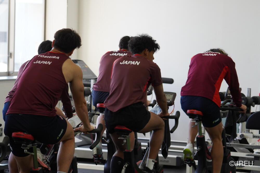 本日はリカバリー日となりました。まずは恒例の垂直跳び測定を行い、連日のハードワークによる身体のコンディションを確認。本日のトップは57.8cmを記録した古賀 由教選手(リコーブラックラムズ東京)でした。