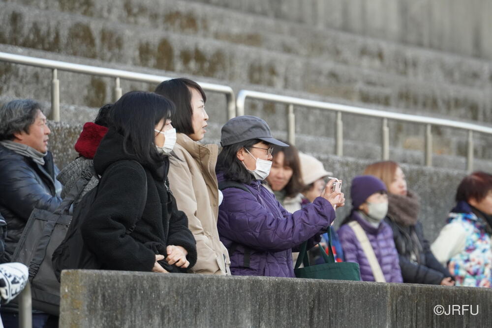 午後は、よく晴れた空の下で公開練習を実施しました。非常に寒い中でしたが、多くのファンの皆様に見守られながらトレーニングを行いました。午後のテーマも引き続きディフェンス。始めは1対1や2対2といった個人のスキルに重点を置き、その後は7対5、7対7とチームとしてのディフェンスの練習となりました。合宿後半で疲労もピークに達し、極限の状態にある選手たちですが、最後の練習までアタック・ディフェンスともにハードワークを貫きました。