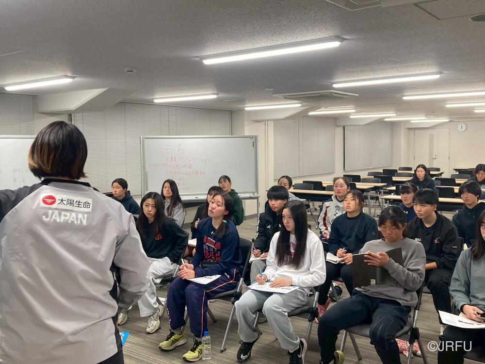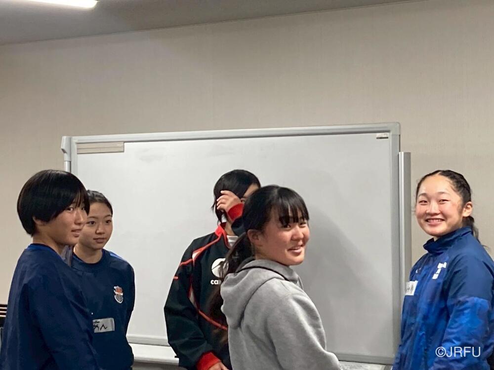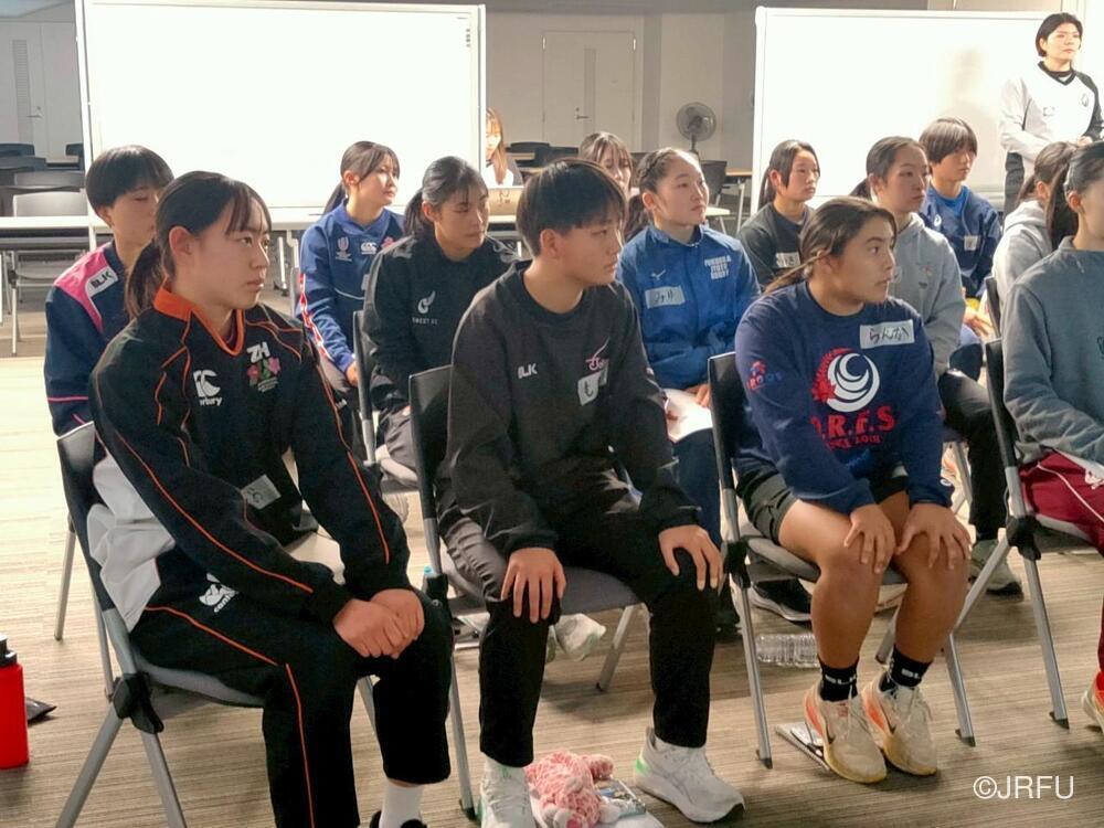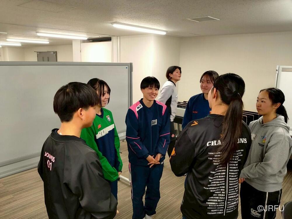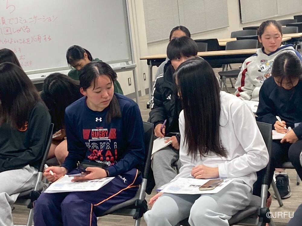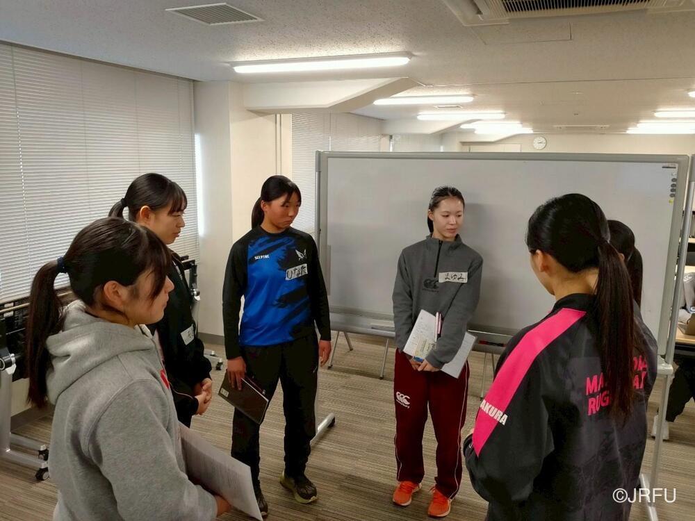 オープニングミーティングでは、浅見アカデミーディレクター兼パスウェイマネージャーから日本女子セブンズラグビーの歩みと日本代表チームのお話、そしてユースアカデミーの目的についてお話がありました。その後、4つのグループに分かれて自己紹介を行い、ユースアカデミーを良くするために何を取り組むか一人ずつアイディアを出してもらいました。どのグループからも、みんなとコミュニケーションを取っていこうという提案が挙がりました。最後に、今回の合宿のテーマである「自己を知る」という目標を全員で確認しました。