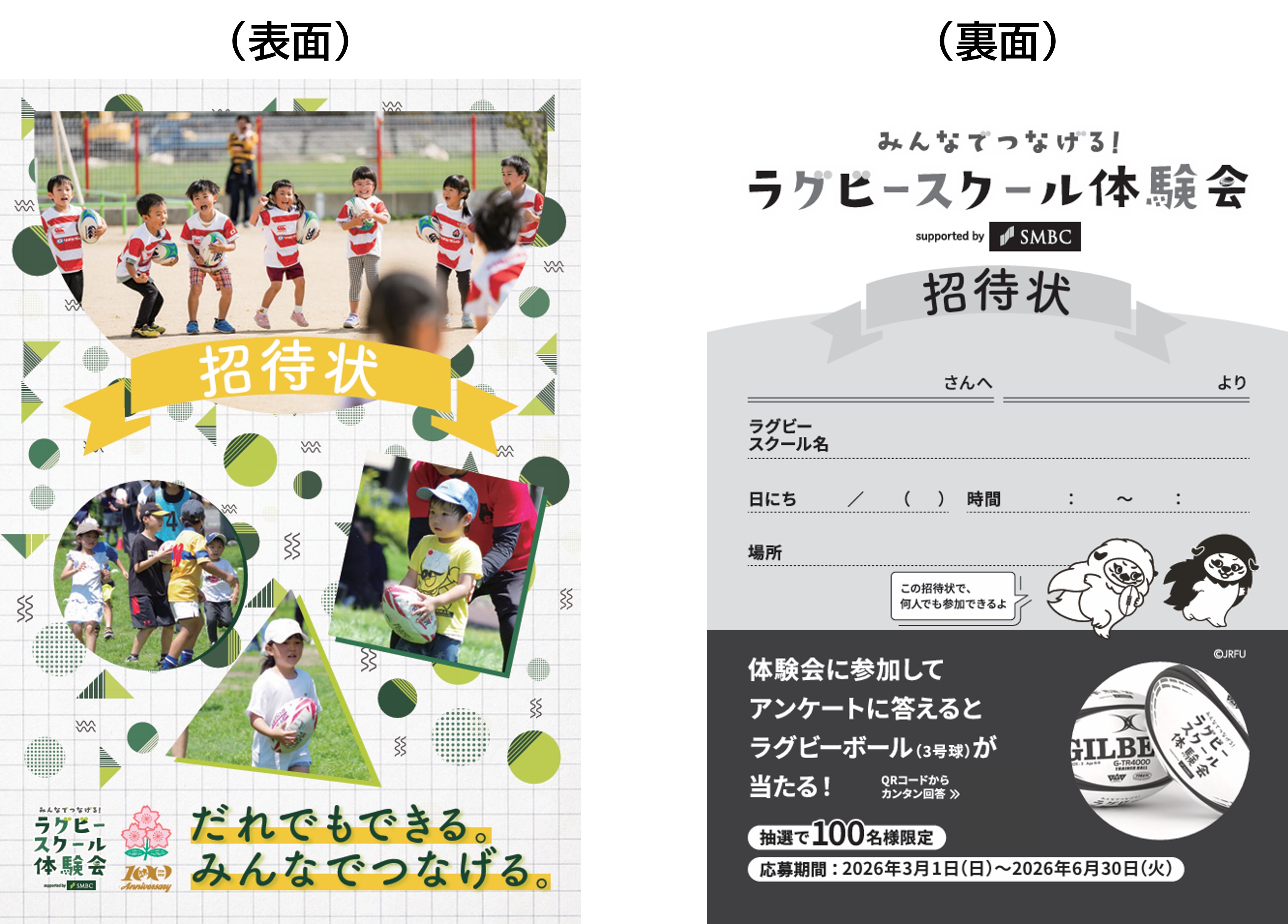今年度につきましても、地域協会およびラグビースクールの皆さまが開催される体験会をより一層サポートしてまいります。具体的な支援策として、JRFU公式サイトやSNSアカウントにて各スクールの体験会情報を掲載することで告知のお手伝いをさせていただくほか、昨年同様、子どもたちが友達を誘うための「招待状」や、実際に楕円球に触れる機会を作るための「ラグビーボール」を作成・提供し、現場での活動を後押ししてまいります。