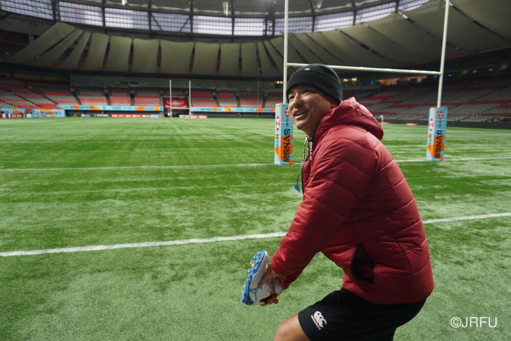 午後は、キッカー数名が試合会場となるBCプレイス・スタジアムへ移動。本番と同じピッチの感触やスタジアムの空間を肌で感じながら、キックの調整を行いました。