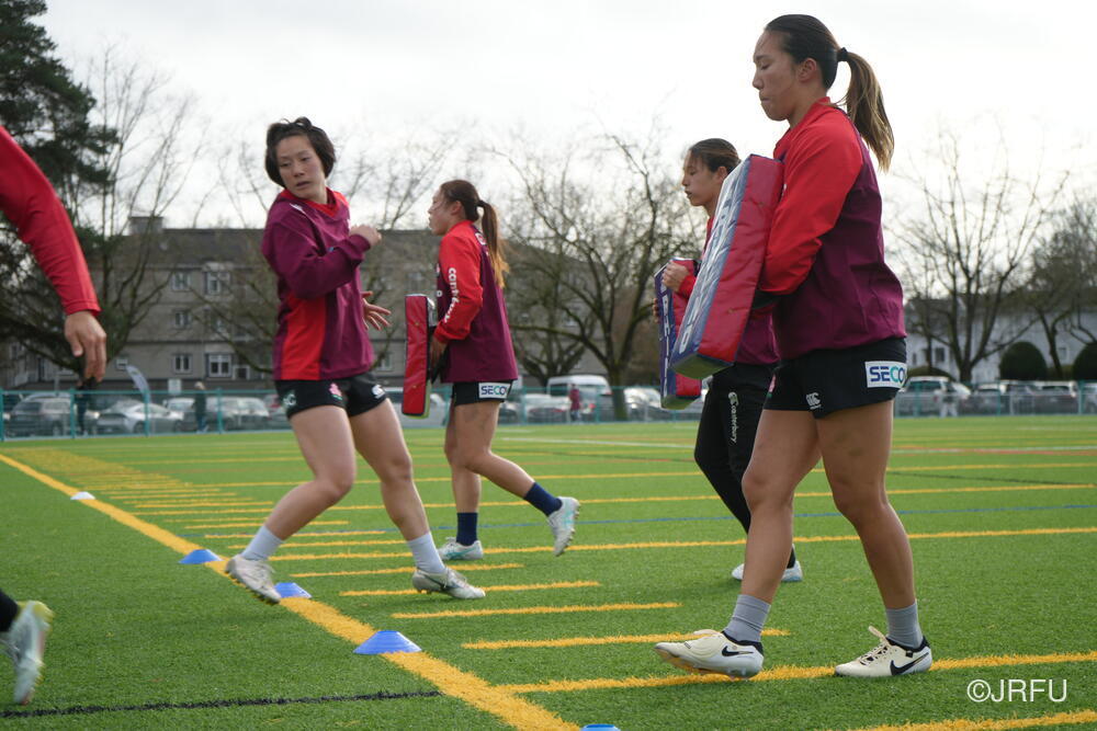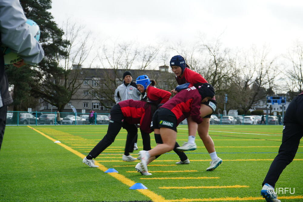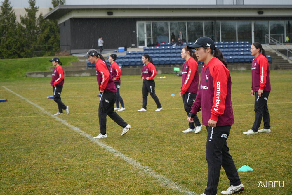 そんな中、バスでフィールドへ移動。雨でぬかるんだコンディションでしたが、早く体を現地の空気に慣らすため、なるべく動き続けることを心がけ、全員で走り込みました。福岡合宿や実戦形式の練習で出た課題を、フィールドで再確認。各選手が普段フィールドで使っている言葉の意味や、状況判断におけるイメージのズレをすり合わせ、チームとしての統一感を高めました。仕上げの7対7では、コンタクト強度は抑えつつも、どんな状況でも自分たちのスタイルを貫けるかを徹底。国内合宿や前回大会でみんなで決めた大切なことを、改めて体現することに集中しました。