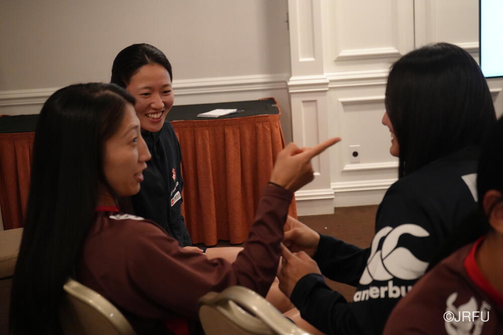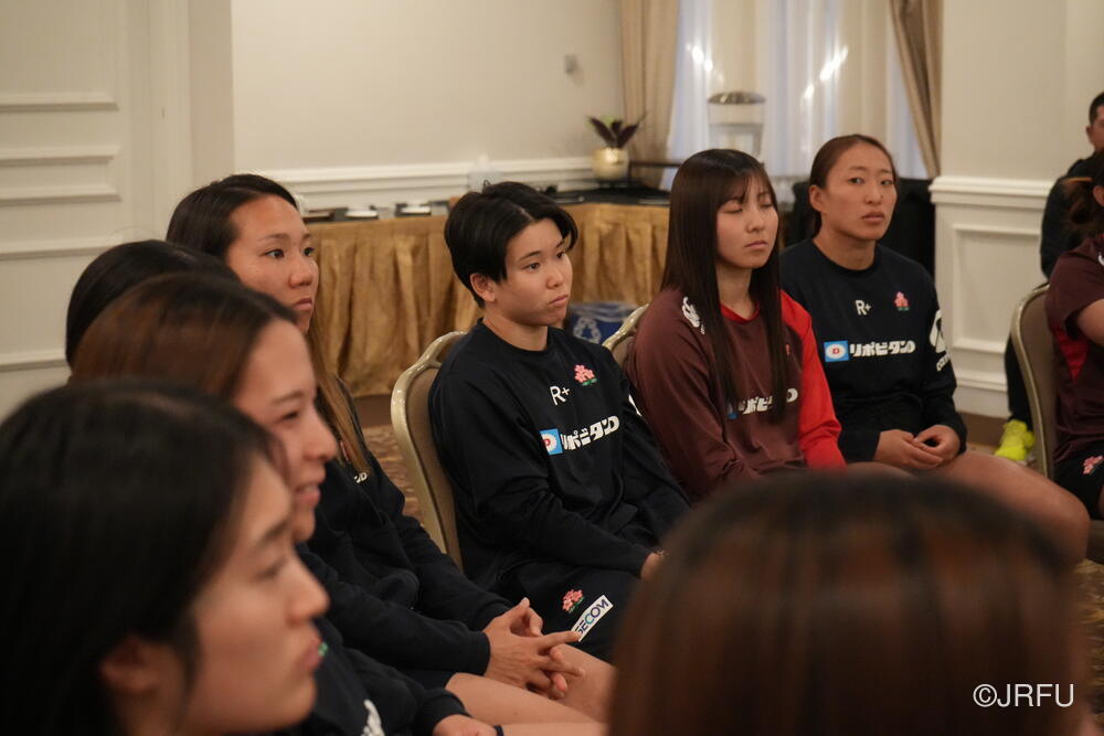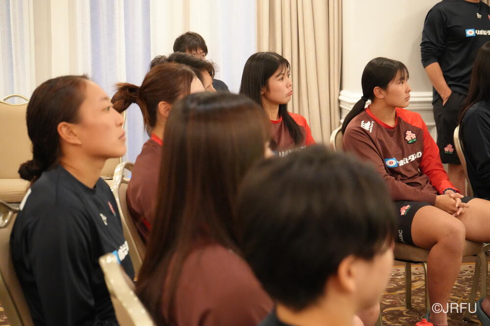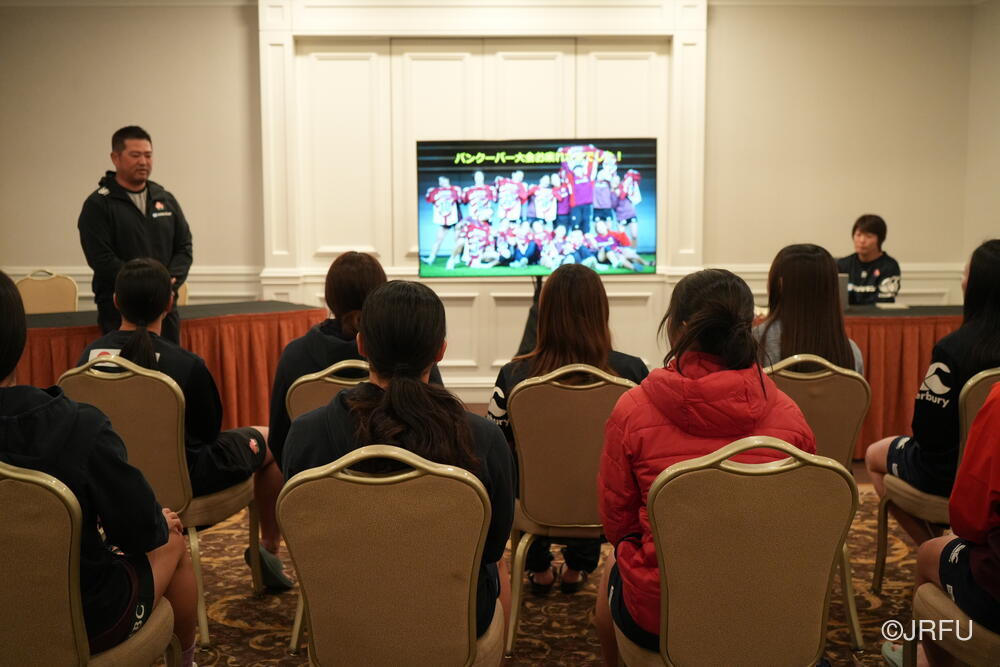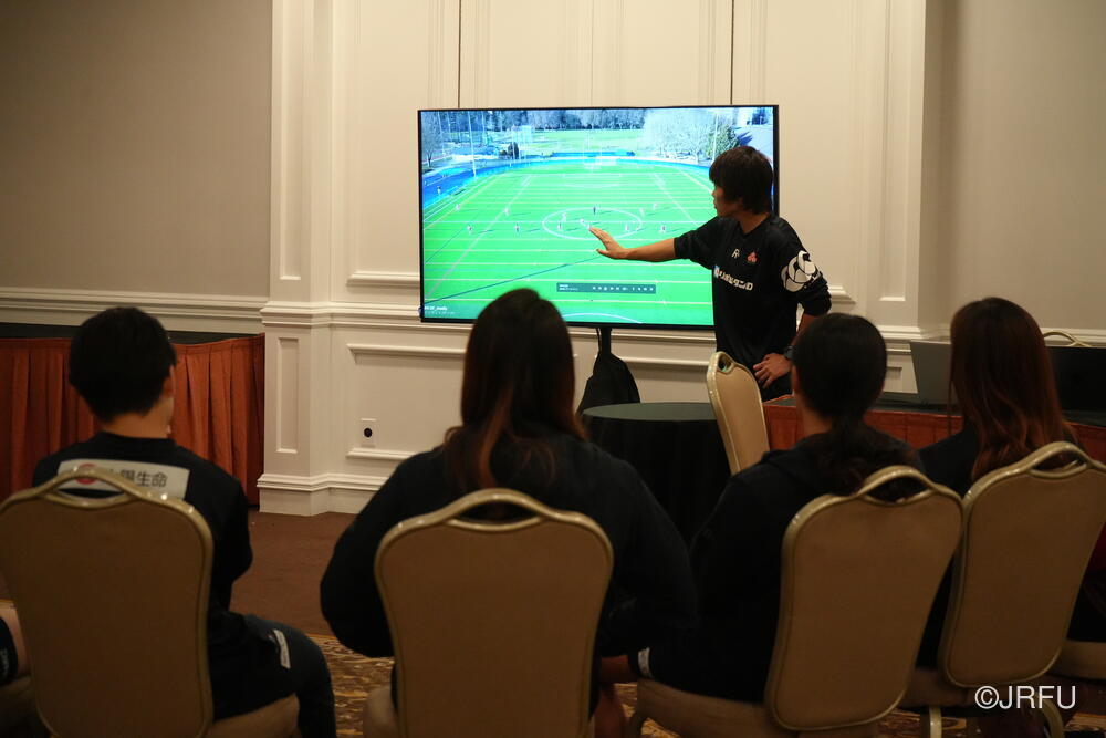 その後、前日のカナダ代表とのトレーニングマッチの映像を見ながら前夜の選手ミーティングを振り返り、翌日の練習に向けた課題を整理しました。