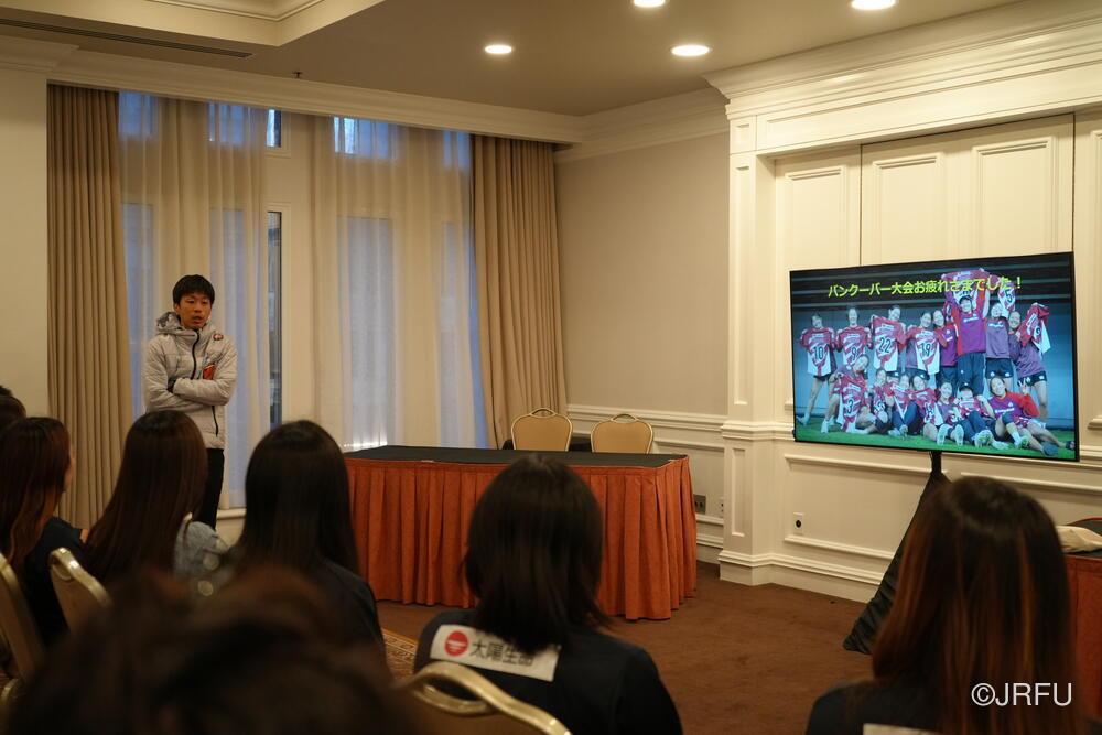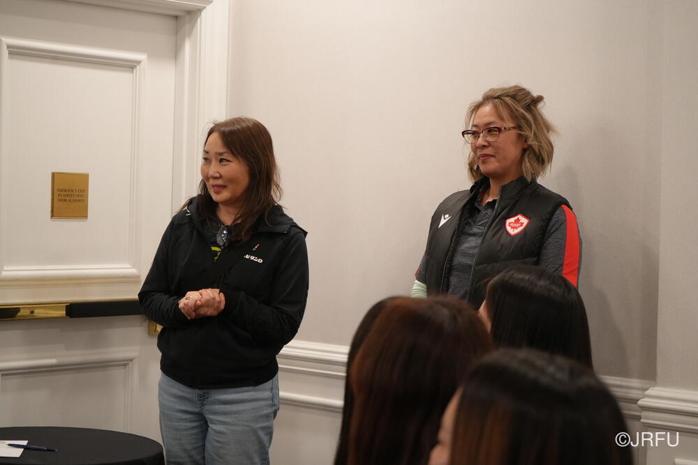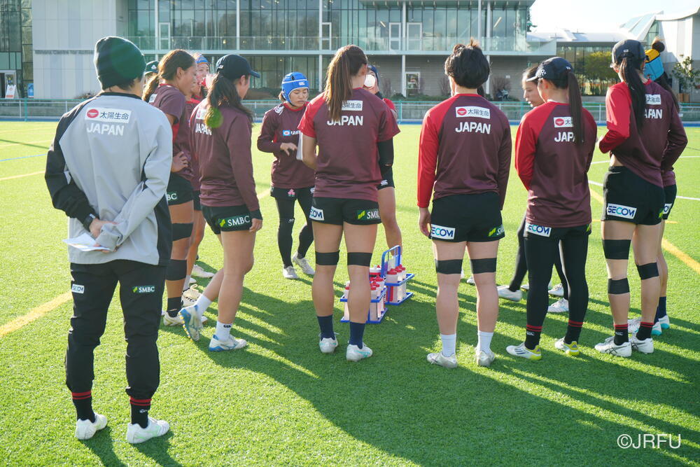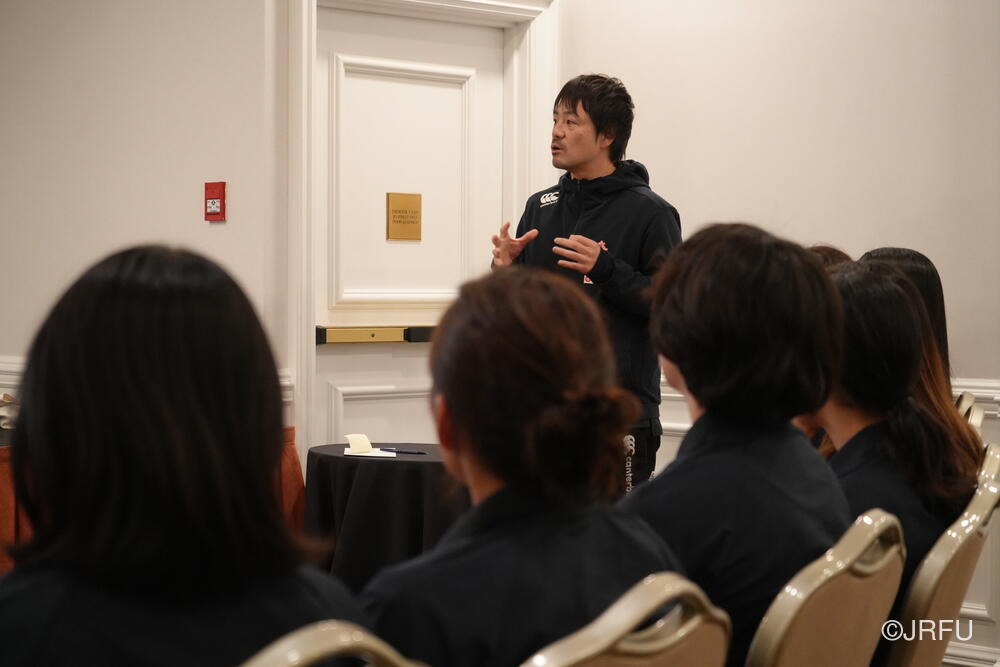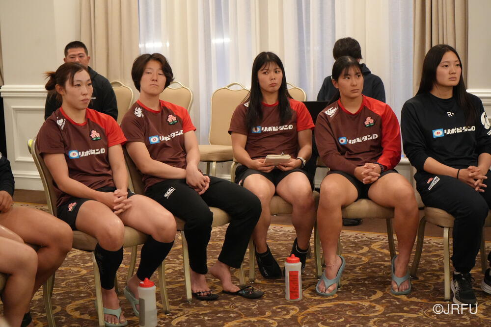 その後、前日のカナダ代表とのトレーニングマッチの映像を見ながら前夜の選手ミーティングを振り返り、翌日の練習に向けた課題を整理しました。