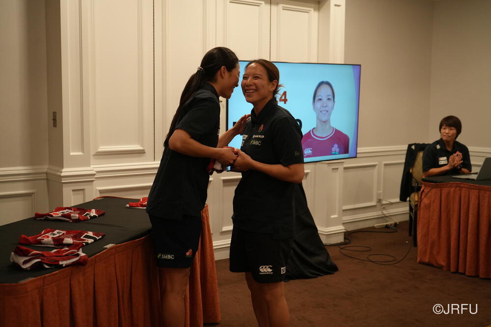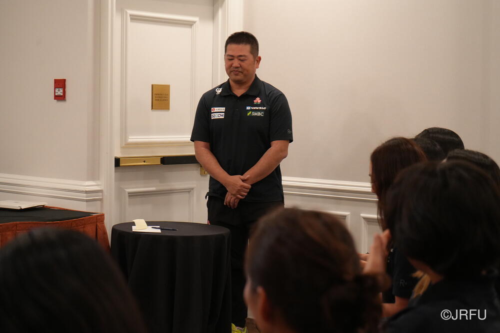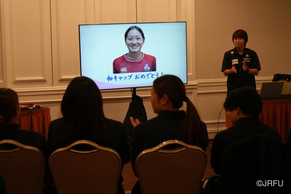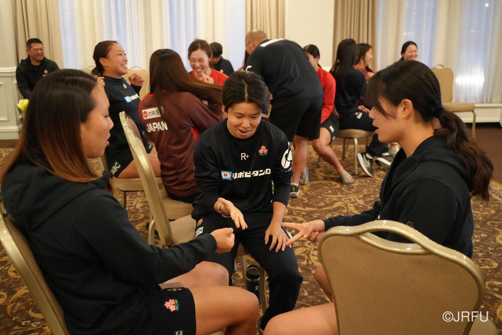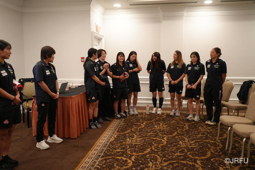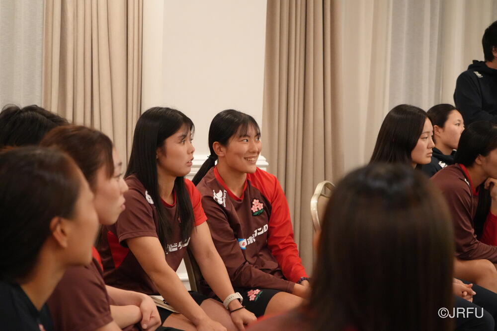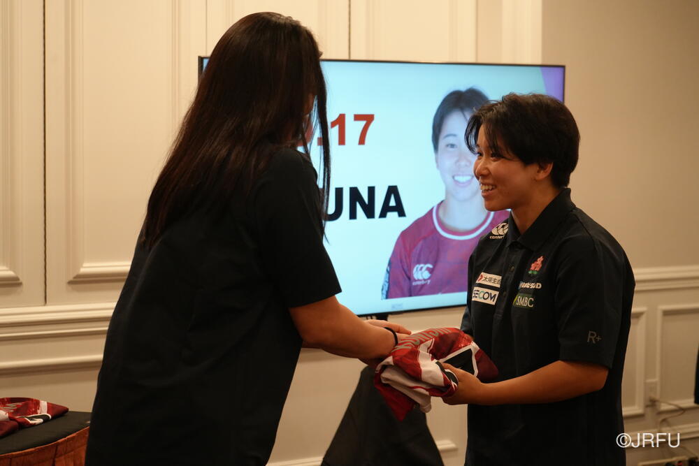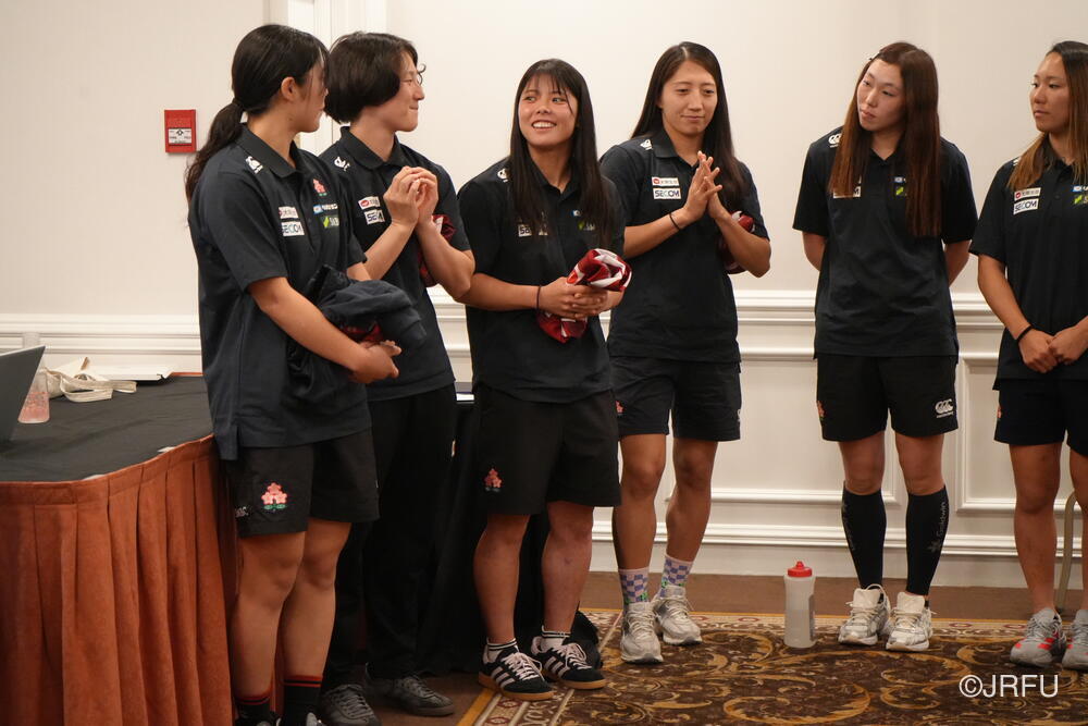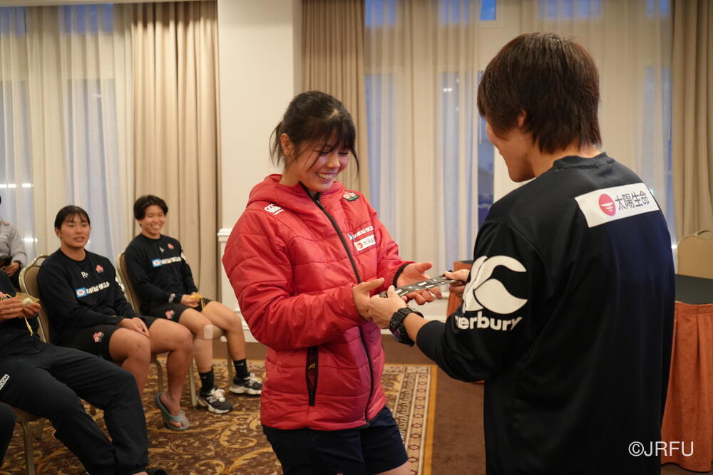 夕方には梅田ナショナルチームディレクターが合流し、チームミーティングとジャージプレゼンテーションを行いました。はじめに、今大会で初キャップとなる尾久土選手を全員でお祝いしました。昨年ユースアカデミーを修了したばかりの大学1年生である尾久土選手は、憧れのジャージに袖を通す喜びに感極まりながら、一生懸命今の想いを語ってくれました。