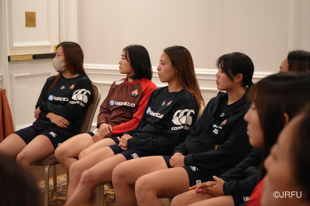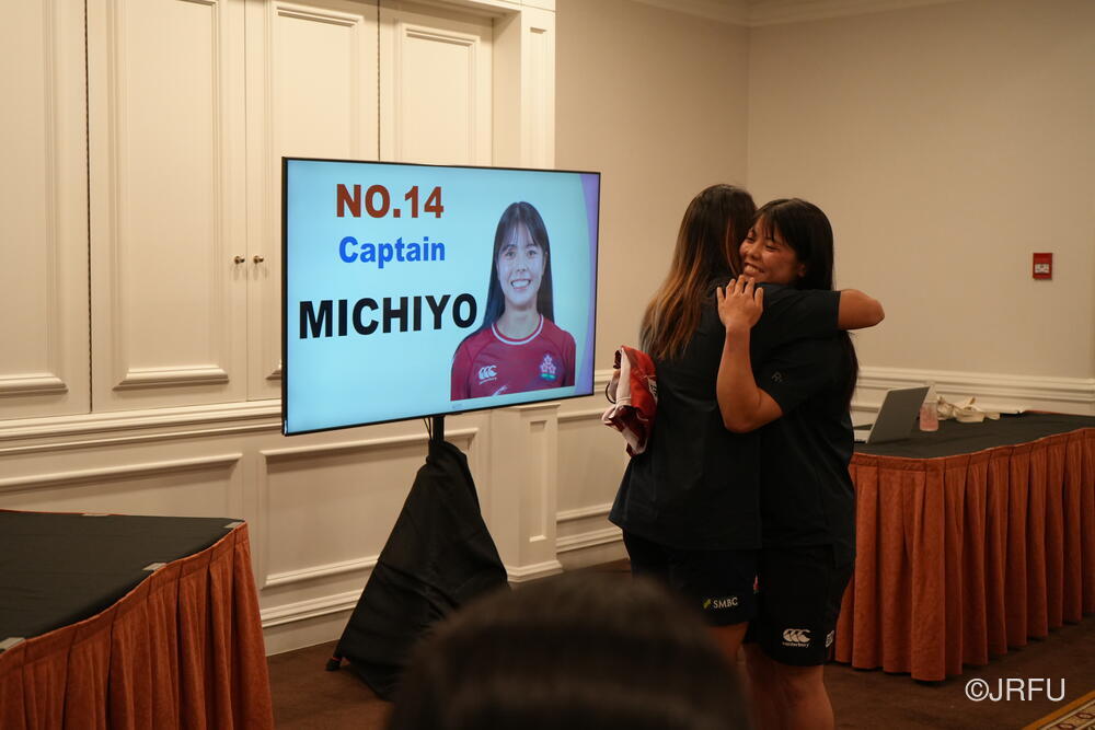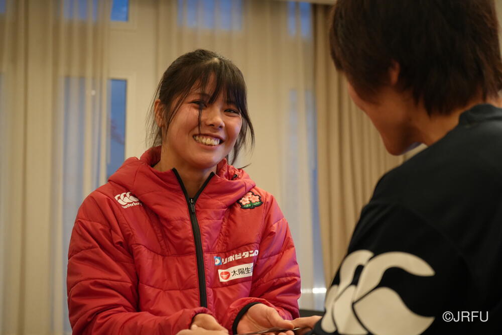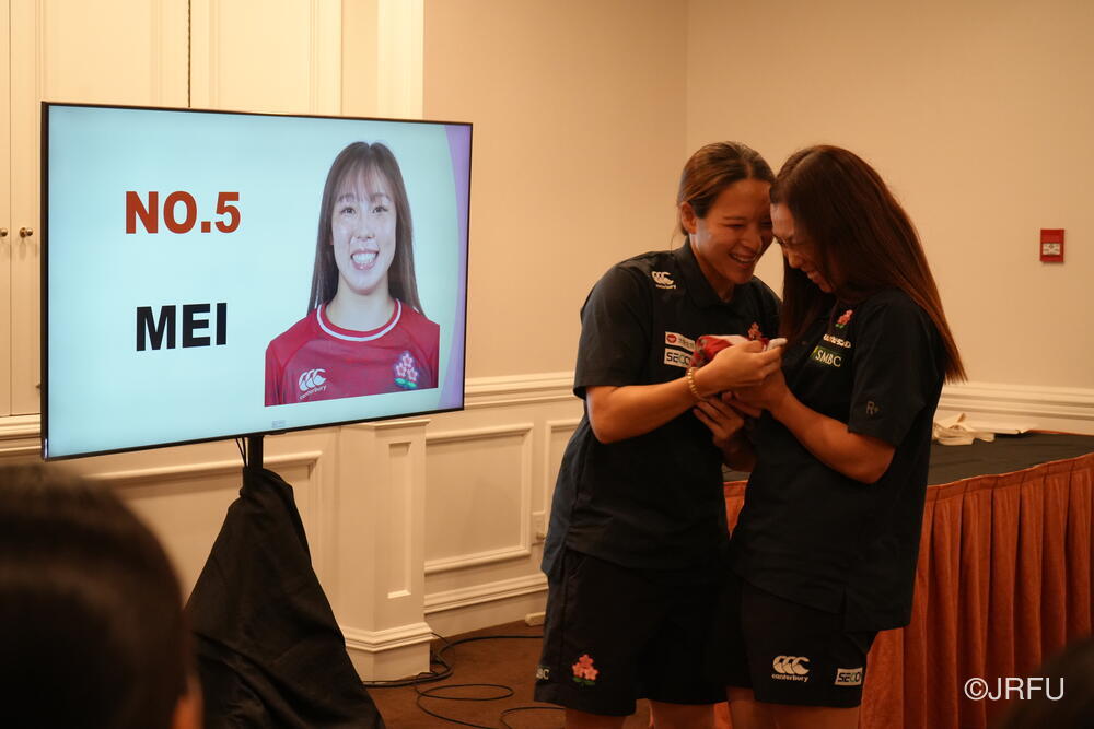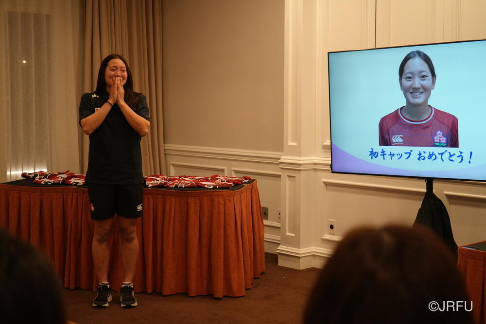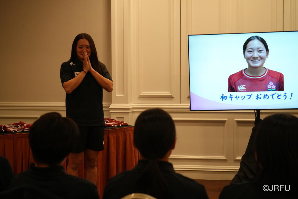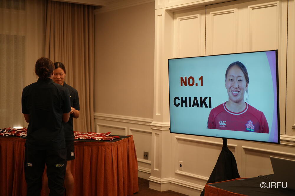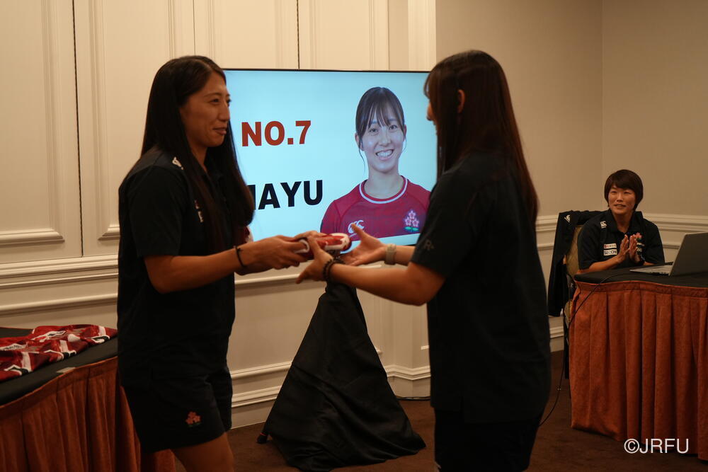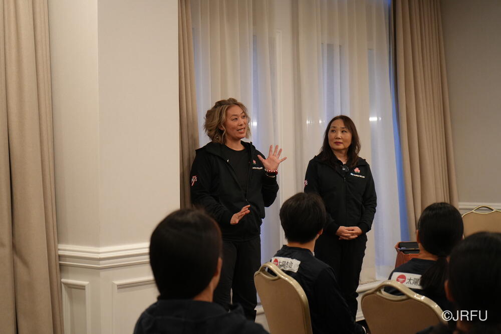夕方には梅田ナショナルチームディレクターが合流し、チームミーティングとジャージプレゼンテーションを行いました。はじめに、今大会で初キャップとなる尾久土選手を全員でお祝いしました。昨年ユースアカデミーを修了したばかりの大学1年生である尾久土選手は、憧れのジャージに袖を通す喜びに感極まりながら、一生懸命今の想いを語ってくれました。