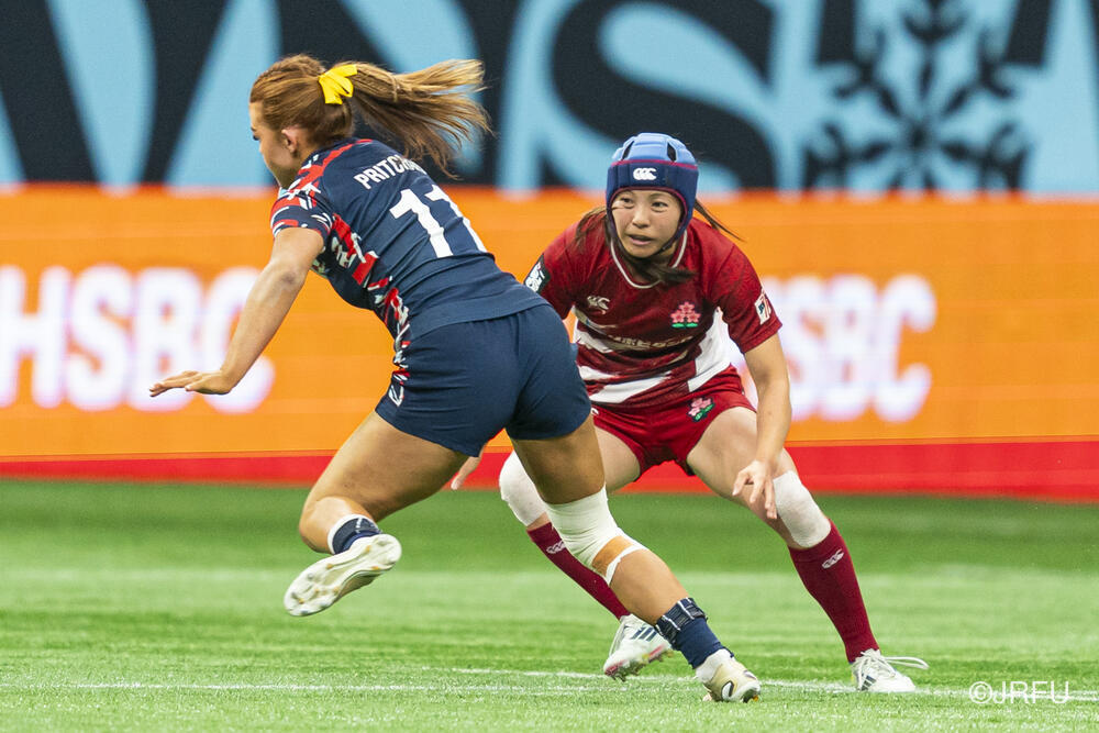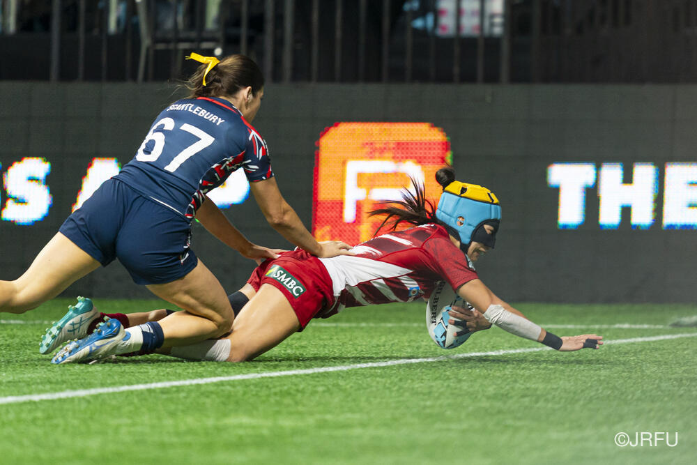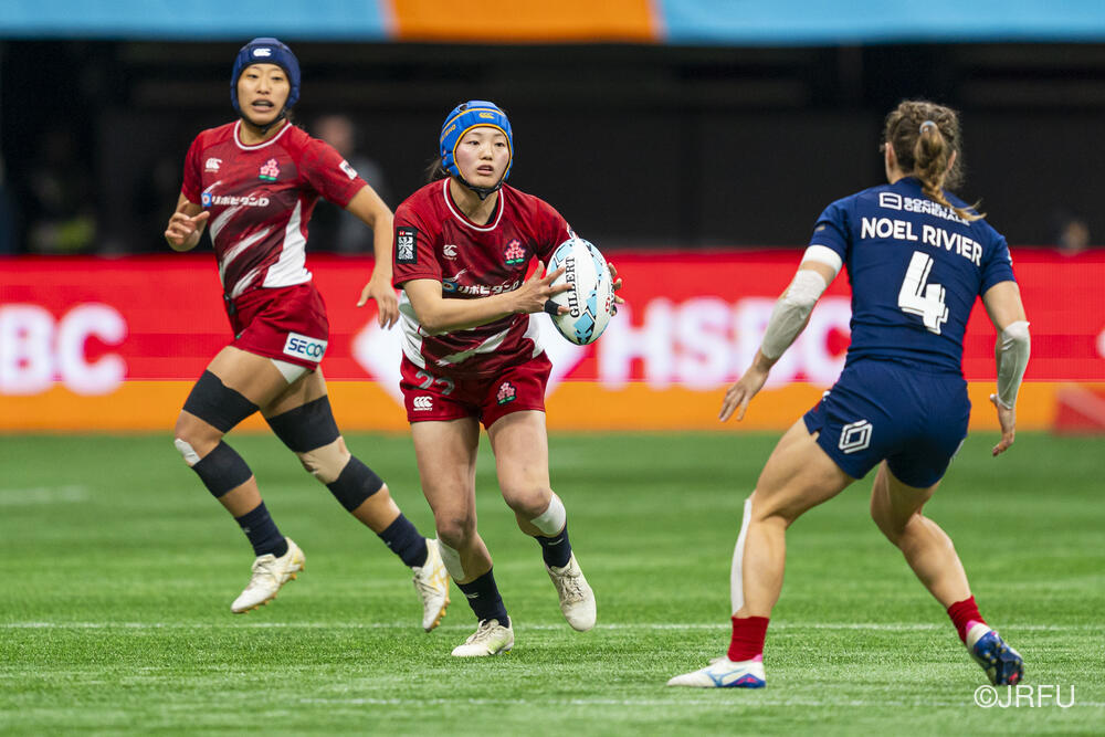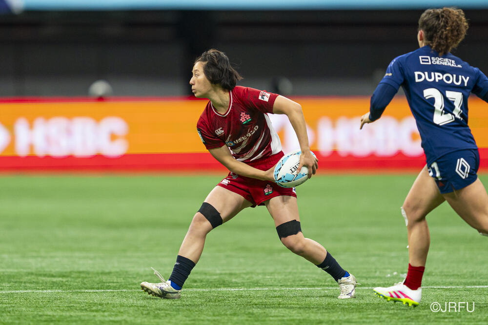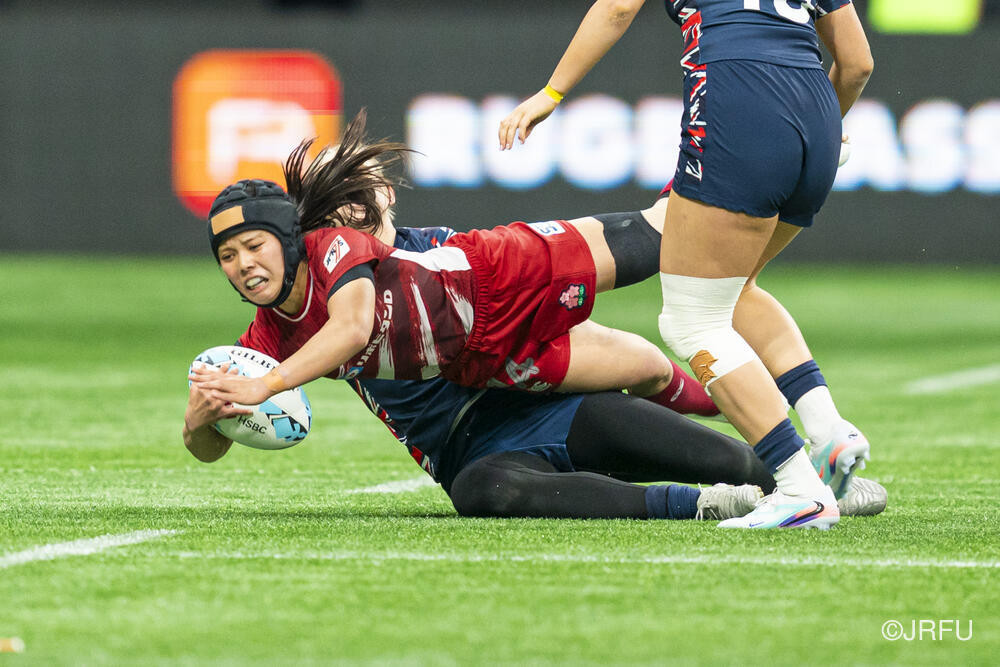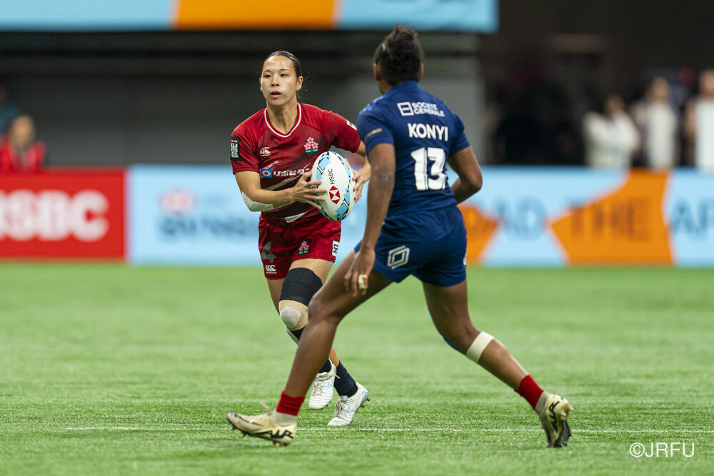 国内合宿で重点的に取り組んできたキックオフやディフェンスで成果が見られた一方、はじめの2試合はアタックを継続できず、ディフェンスの時間が長くなり、サクラセブンズの流れを掴むことができませんでした。しかし、第3試合では選手たち自ら気持ちを切り替え、開始直後から本来のサクラセブンズのラグビーを展開し、勝利を収めることができました。