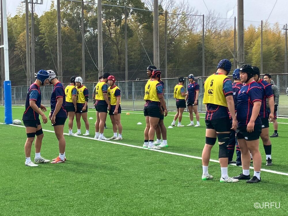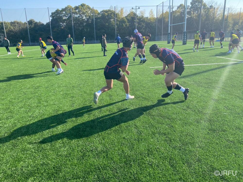 午前中のセッションは、試合で浮き彫りになった課題の修正から始まり、ウォークスルーで戦術の微調整を行った後、グラウンドではFW・BKに分かれたユニット練習を実施。大学生のパワーに押し込まれた局面や、連携が乱れたシーンを徹底的に洗い出し、40分間の濃密な時間の中で一つひとつのプレーを再構築しました。続く50分間の全体練習(Team)では、修正した動きを組織として統合し、より実戦的なスピード感で精度を磨き上げました。
