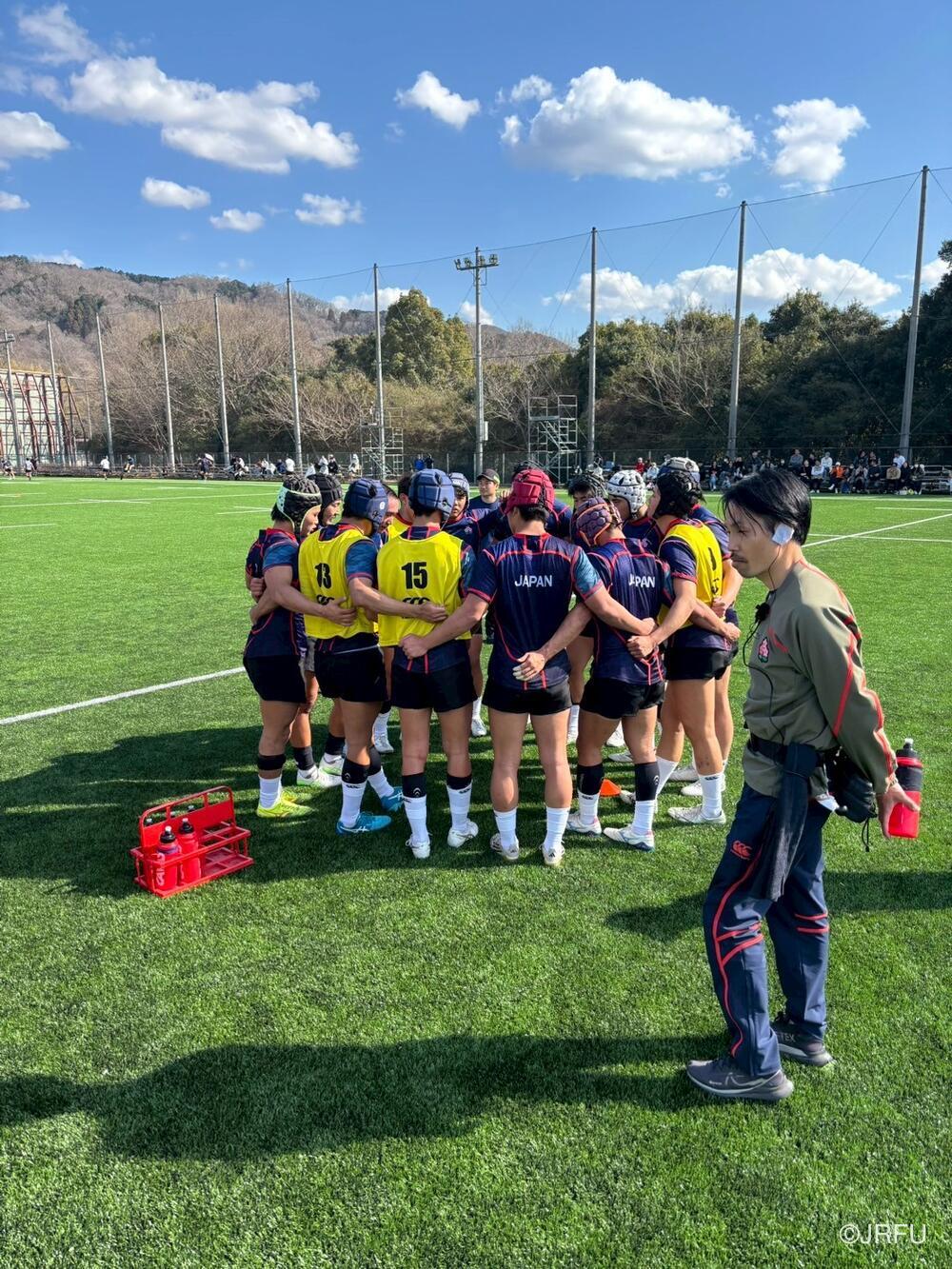 午後12時15分、天理大学との練習試合(20分×4本)に向けて試合前ミーティングを実施しました。天理大学白川グラウンドへ移動、アップを行い、14時30分に天理大学戦キックオフ。大学生の力強いコンタクトとスピードに対し、高校日本代表はこれまで積み上げてきた組織的なディフェンスと、セットプレーからのアタックで対抗。20分×4本というタフな設定の中、選手たちは疲労が蓄積する局面でも、個々のターゲットとチームのターゲットを明確にしました。16時30分のノーサイド後、選手たちはすぐにリカバリーを行い、激戦で酷使した身体のケアに努めました。多くの選手たちの表情には、大学生との激闘を戦い抜いた疲労とともに、確かな手応えとさらなる成長への意欲が滲んでいました。