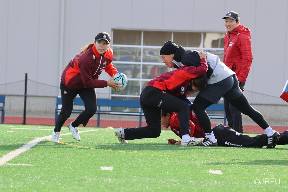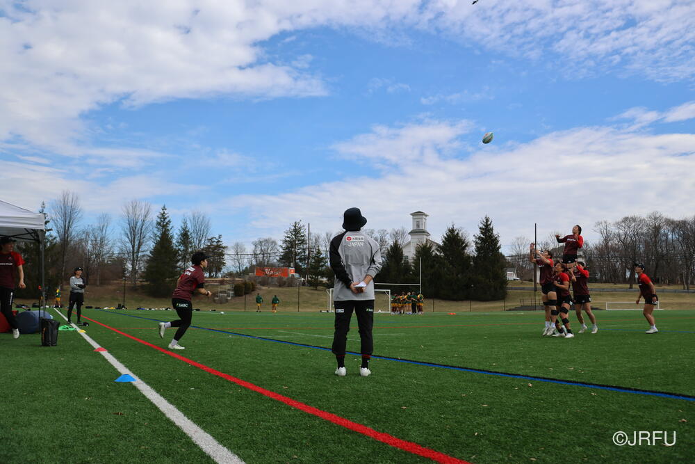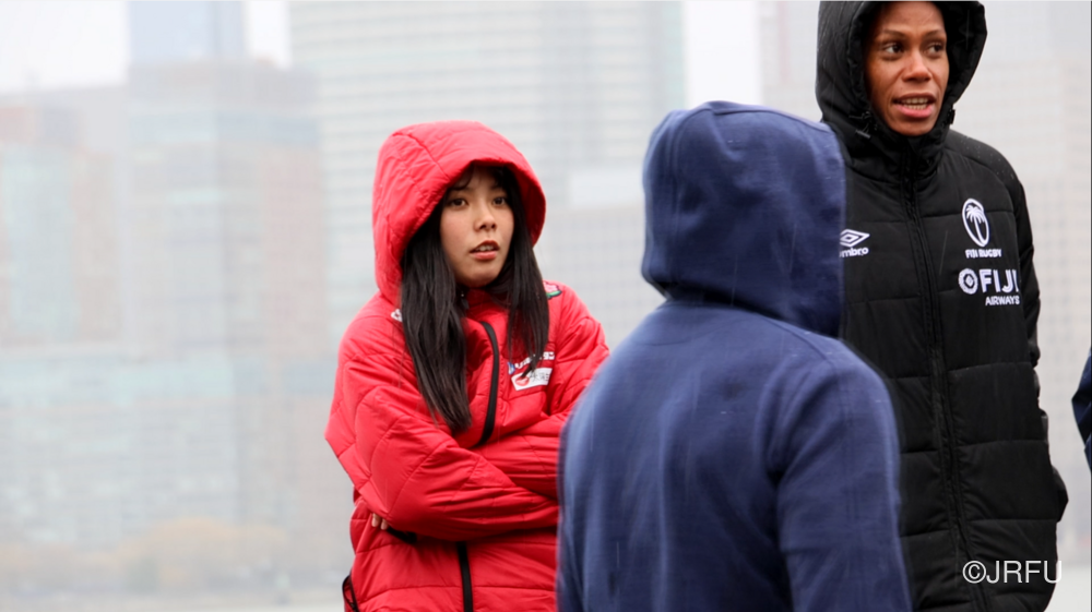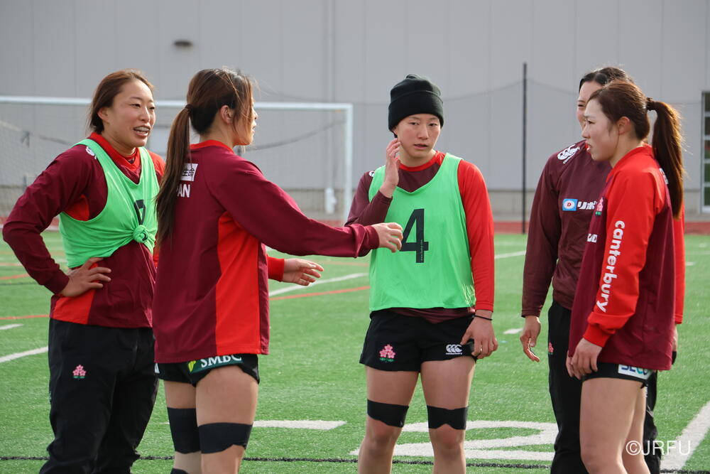 遠征5日目。大会前日の今日は、水たまりが凍るほど空気が冷たく、午前中はウォームジャケットに身を包んで大会前最後のフィールド練習へ向かいました。練習が始まると、そこにはこれまでのサクラセブンズから変化が見られました。キャプテンやリーダーを中心に、終始チーム全体が互いに目を向け、鼓舞し合う声が響きます。最後の7対7では、選手たちがいきいきとプレーし、集中力高くパスとランでトライまでボールを繋いでいました。