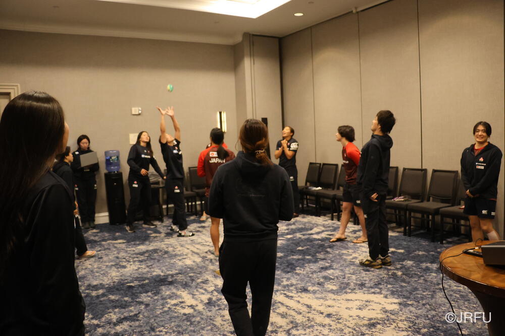 昨夜のミーティングの内容を再確認し、全員が笑顔でハドルを組んでトレーニングがスタート。テニスボールとラグビーボールを組み合わせた2人お手玉は、まだ苦戦しているものの、トレーニングの度に上達しています。特に尾久土選手と庵奥選手のペアは、落ち着いたテンポでボールを繋いでおり、とても息が合っていました。