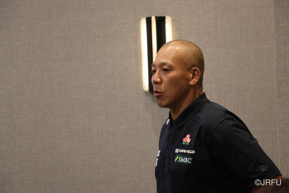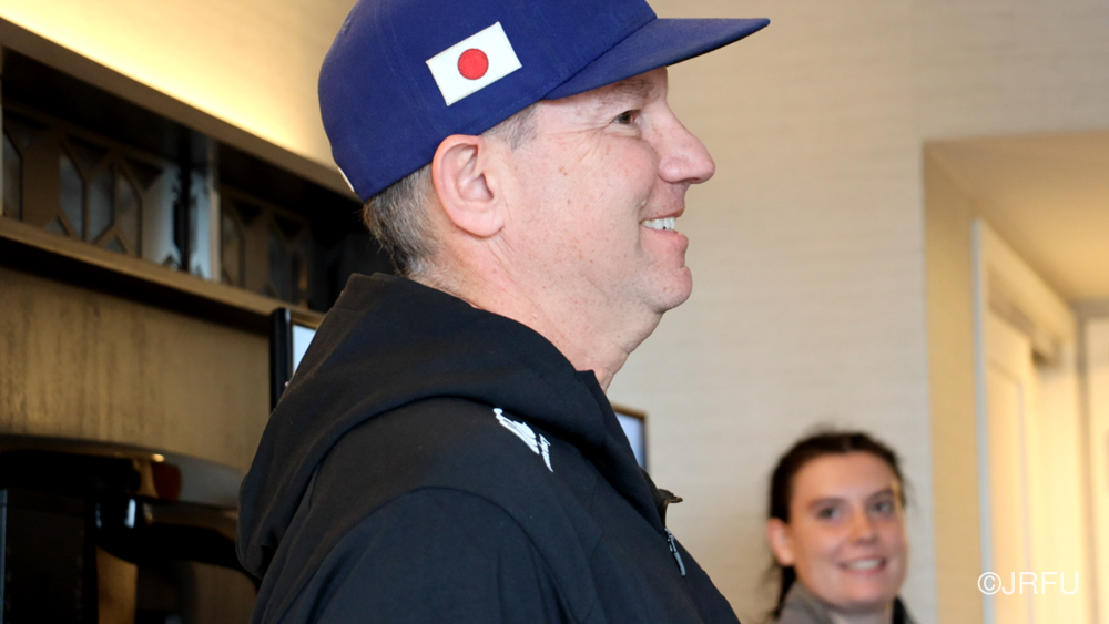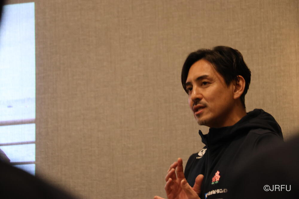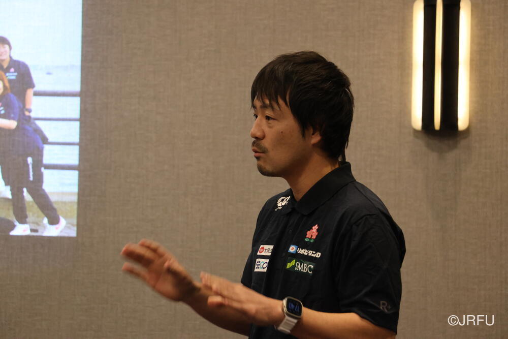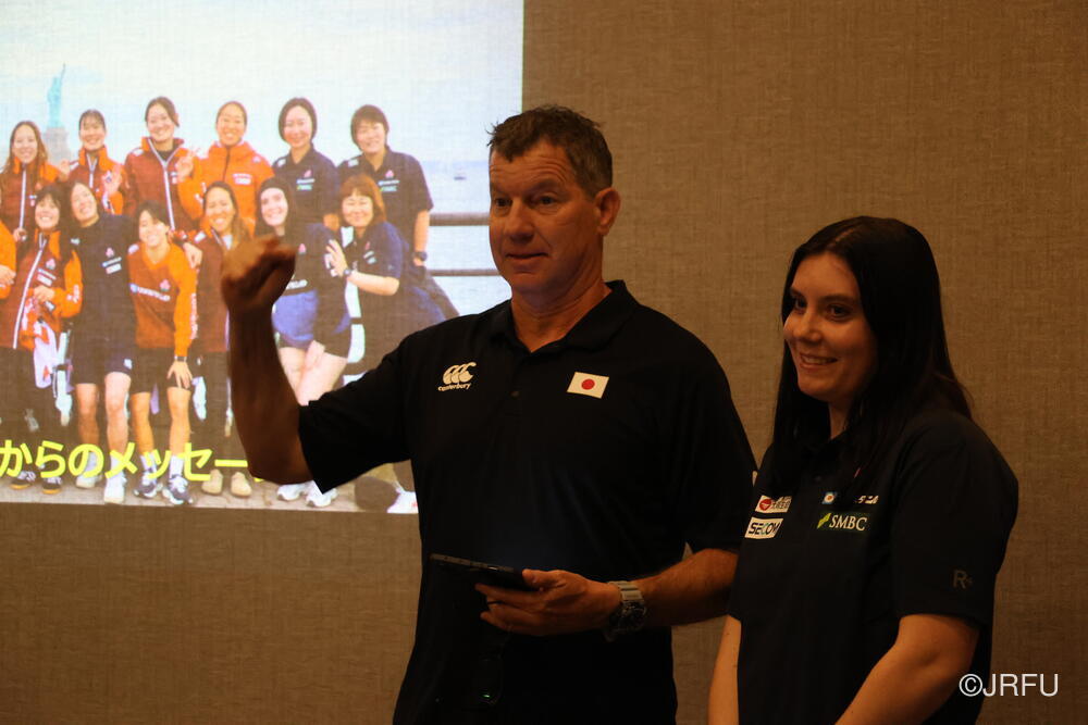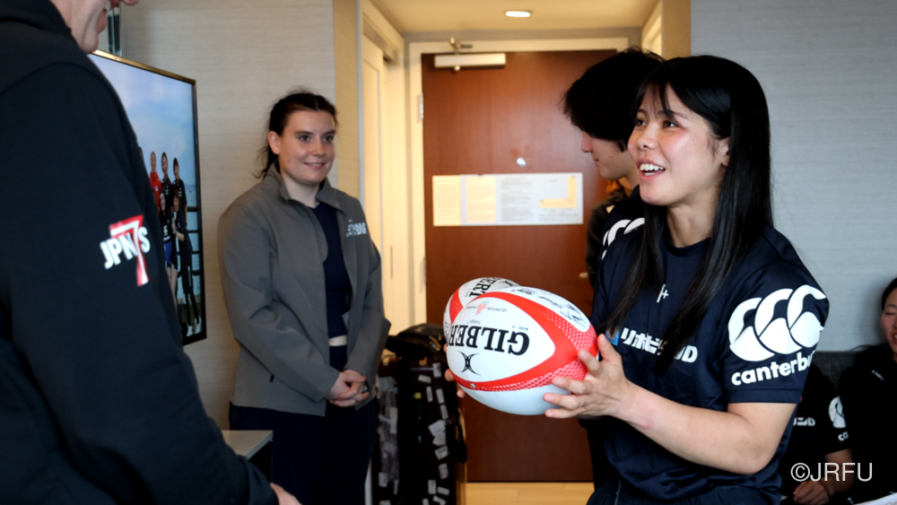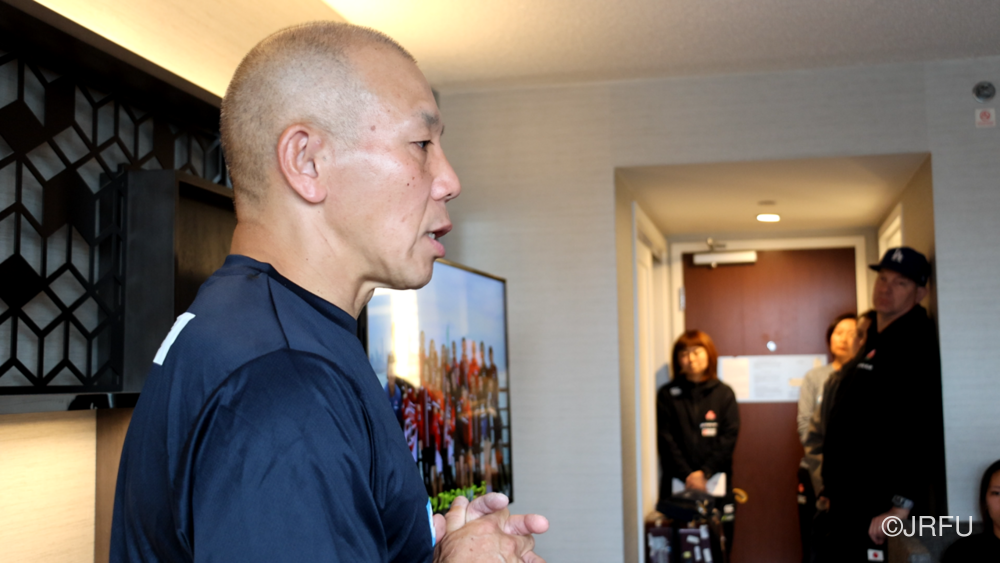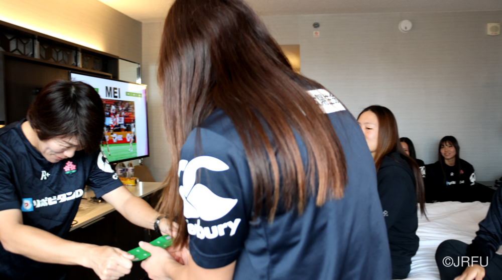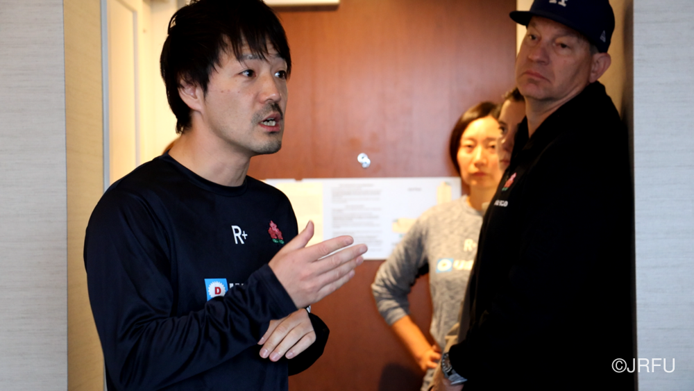 夕方には、昨夜合流された五反田ドクターやリエゾンの方々も加わり、ジャージプレゼンテーションが行われました。スタッフから温かいメッセージをいただいた後、選手たちの手から手へと、想いのこもったメッセージと共にジャージが託されていきます。スライドには選手たちの最新のカッコいい瞬間の写真が映し出され、大きな歓声が上がり、最後は中島アナリスト制作のスペシャル映像が。13名それぞれのナイスプレーが繋がり、最後はチーム全員で守り、チーム全員でトライを奪う。まさに「一人ひとりが繋がる」映像に、チームの心は一つになりました。