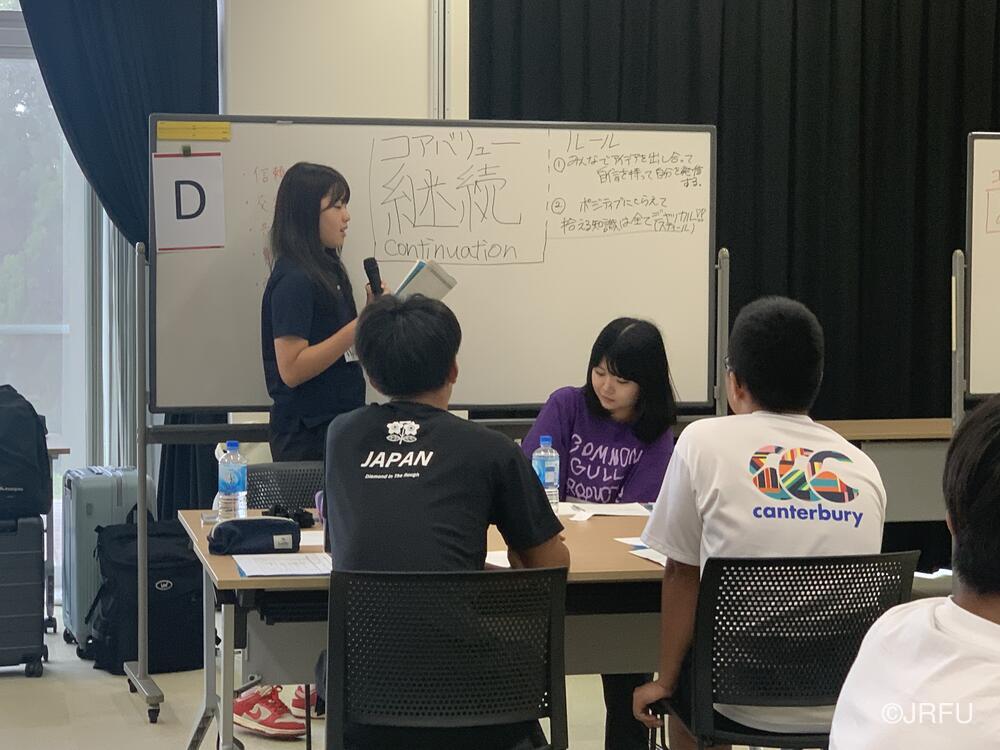 初回の大事なミッションは、ラグビー界が掲げる5つのコアバリューに加え、5期生独自の「6つ目」のコアバリューとルールを定めること。研修初日、参加者は5グループに分かれて話しあい、それぞれに発表。全員での選考を経てコアバリューは「継続」、ルールは「5期生らしく、ジャッカルする!!」に決まりました。