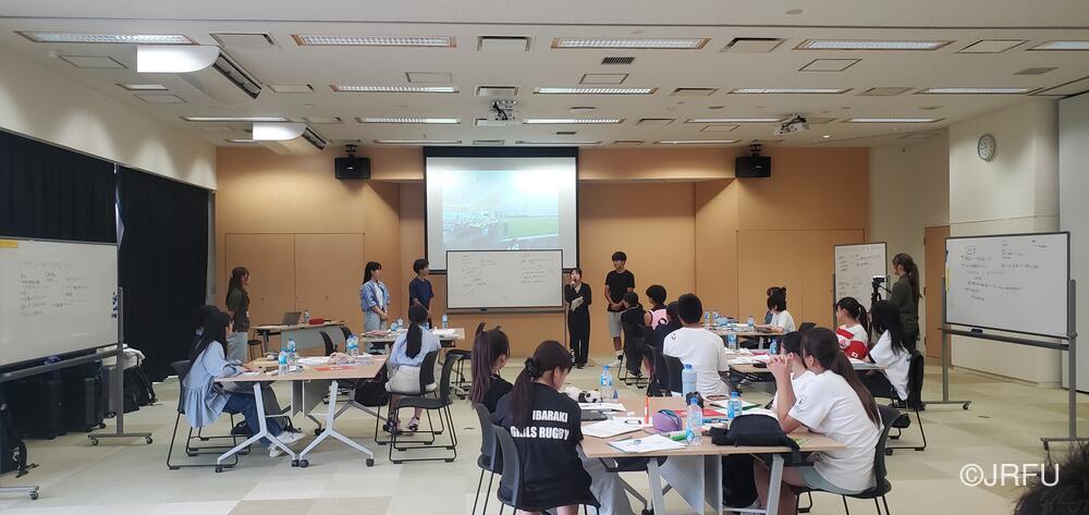 初回の研修ではJRFUについての講義や、「JAPAN BASEの活用方法」のグループワーク、キャリア講義、同宿の男子セブンズ日本代表選手およびスタッフへのインタビュー、さらにはワールドラグビーが誰でも楽しめるラグビーとして、普及を進めている「T1ラグビー」をグラウンドで実践。ラグビー経験者も未経験者も楽しめるT1ラグビーで友好を深めました。