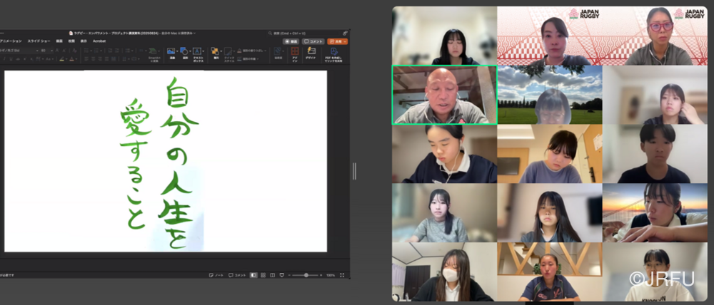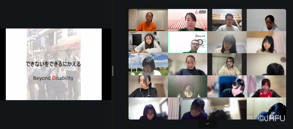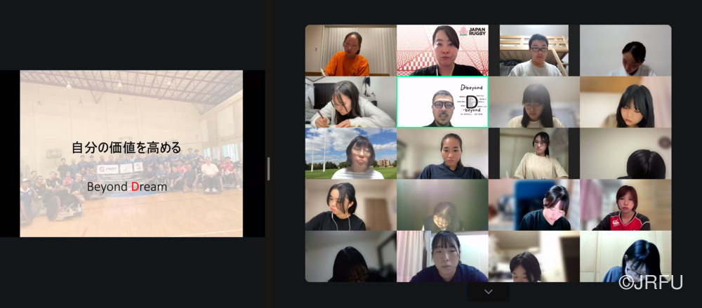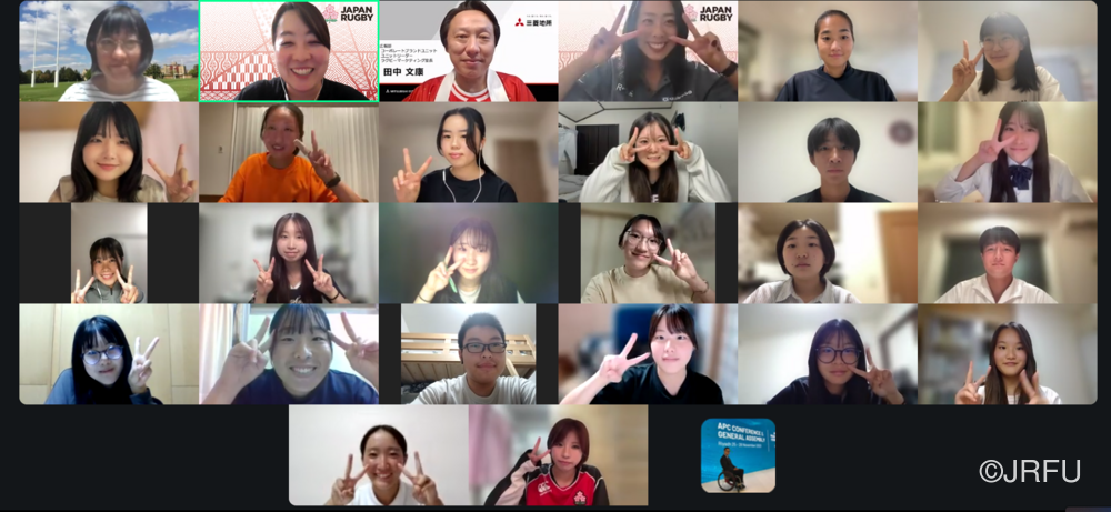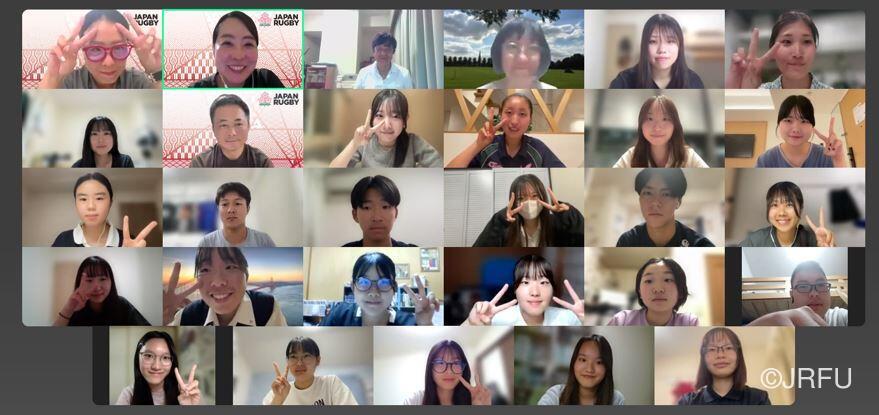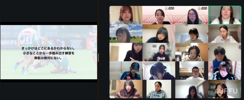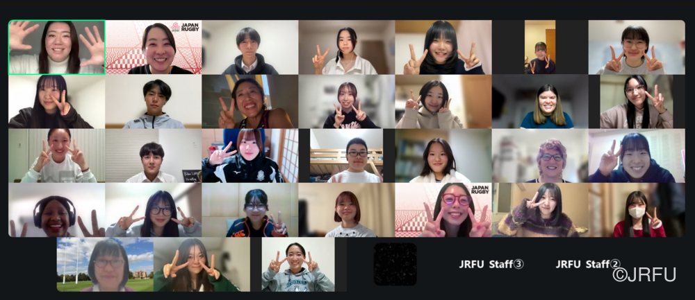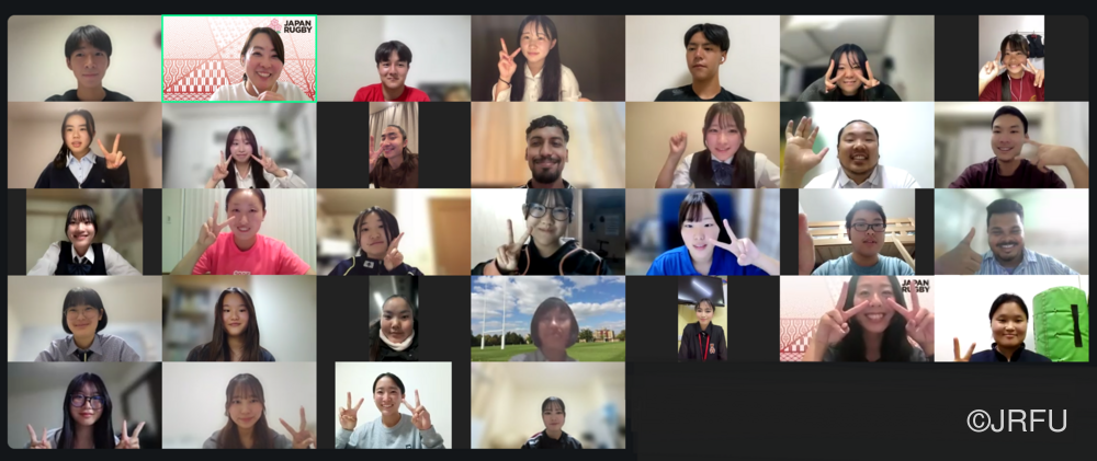 第2部では、世界のラグビー界で活躍する先輩たちとの交流セッションが実施されました。今回は、イングランド協会初の女性会長・Deborah Griffinさん、アフリカ地域の女子ラグビー普及責任者・Paulina Lancoさん、シンガポール協会理事兼女子責任者・Angelina Liuさん、ワールドラグビーハイパフォーマンスコーディネーター・Fionnuala Morrisさんと、そうそうたるメンバーにご参加いただきました。参加者はインタビュー希望者ごとに分かれ、事前に質問を準備して、英語でのインタビューに臨みました。いずれの方々も高校生たちの質問に真摯に耳を傾け、わかりやすい英語で応じてくれました。世界各地から時差も様々な中、日本の若者のために時間を作ってくれたゲストたち。ラグビーは世界を繋ぐツールであることをあらためて実感した回でもありました。
