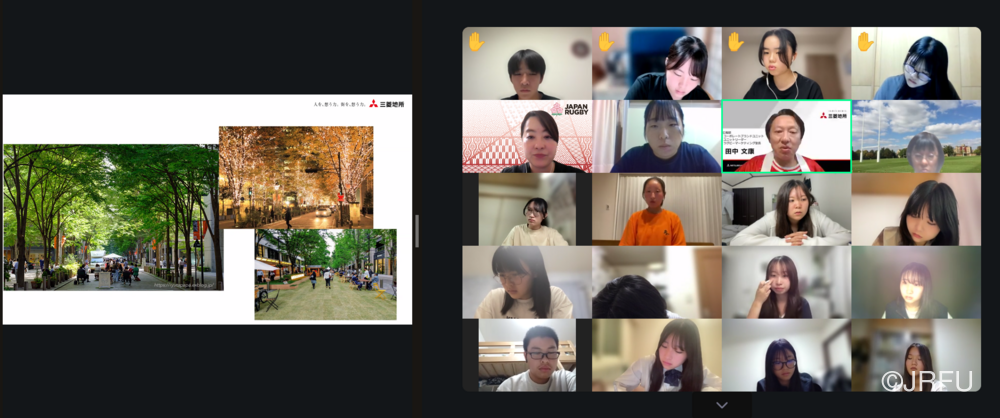前半は、2019年に日本で開催されたラグビーワールドカップの際、機運醸成に大きな役割を果たした「丸の内15丁目プロジェクト」の仕掛け人である三菱地所株式会社・田中 史康さんが登場。同社の理念とラグビーの5つのコアバリューとの親和性が高いことから発足した同プロジェクト。それまで日本では一般の人に馴染みのなかったラグビーをどうやって盛り上げていったのか、緻密な分析や仕掛けなど、裏方として携わった当事者の話は、参加者の興味を引くものでした。