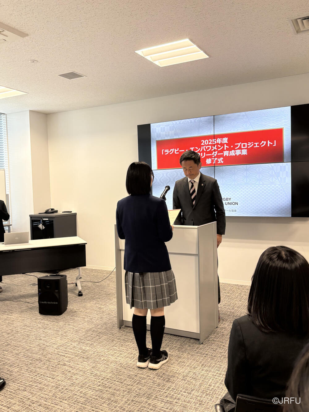 それぞれがREPで学んだこと、そして将来の夢を皆の前で語り、最後に(公財)日本ラグビーフットボール協会・普及育成委員長の西機 真から修了証を受け取りました。