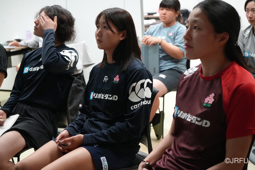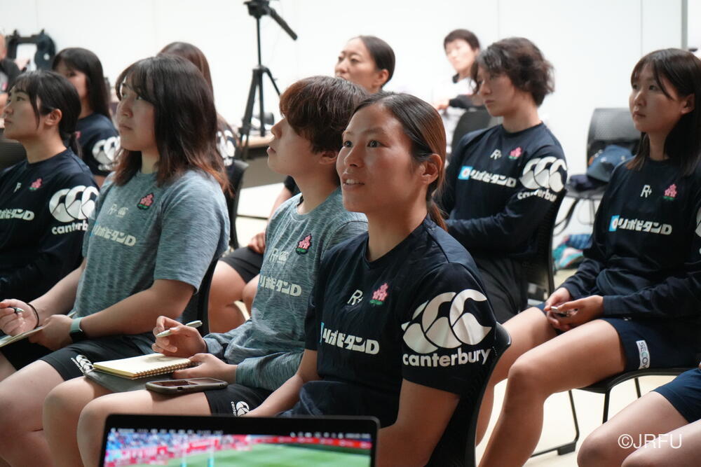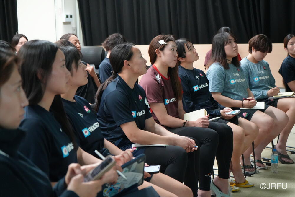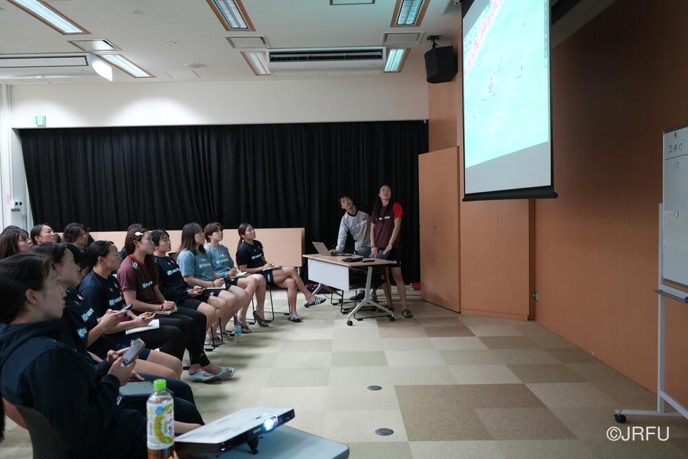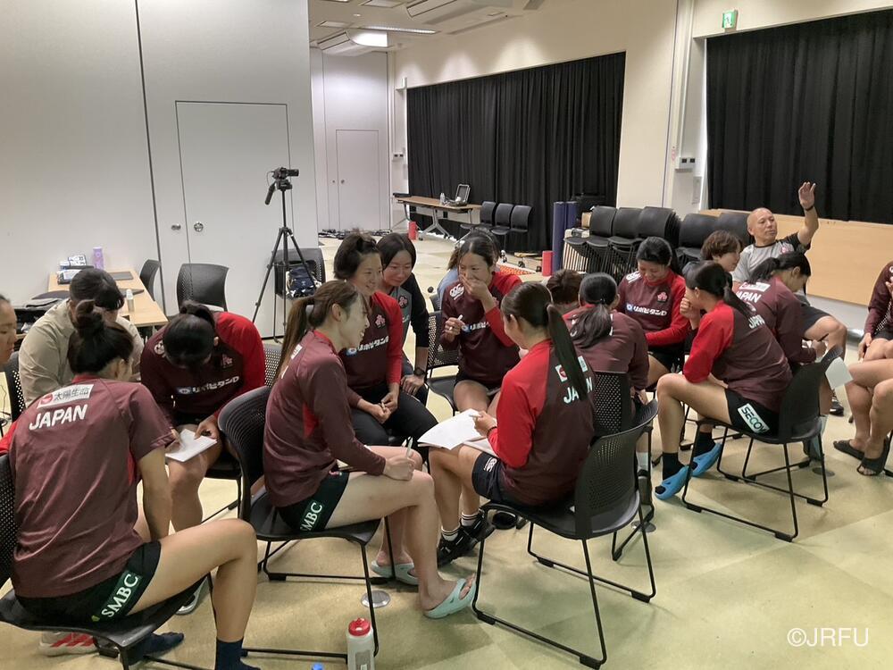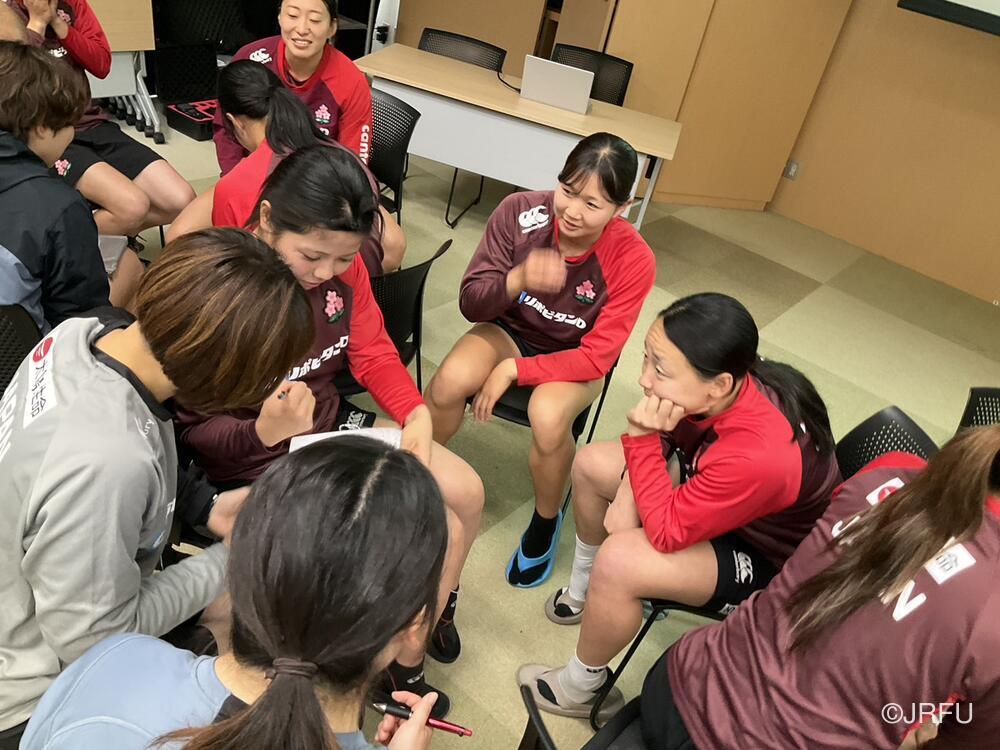 集合後のチームミーティングでは、怪我から復帰してきたメンバーや15人制から戻ってきたメンバーが自己紹介を行い、その後はグループごとのチームアクティビティを実施。スタッフと選手が知恵を出し合う記憶力ゲームを通じて、活発なコミュニケーションを図りました。続いて、ロサンゼルスオリンピックを見据えた長期目標から、今シーズン、そして本合宿における目的を全員で再確認。チームの現在地と目指すチーム像を共有しました。