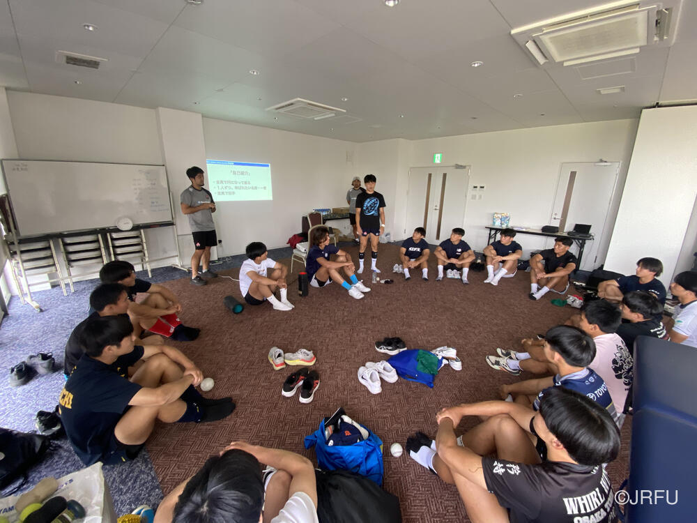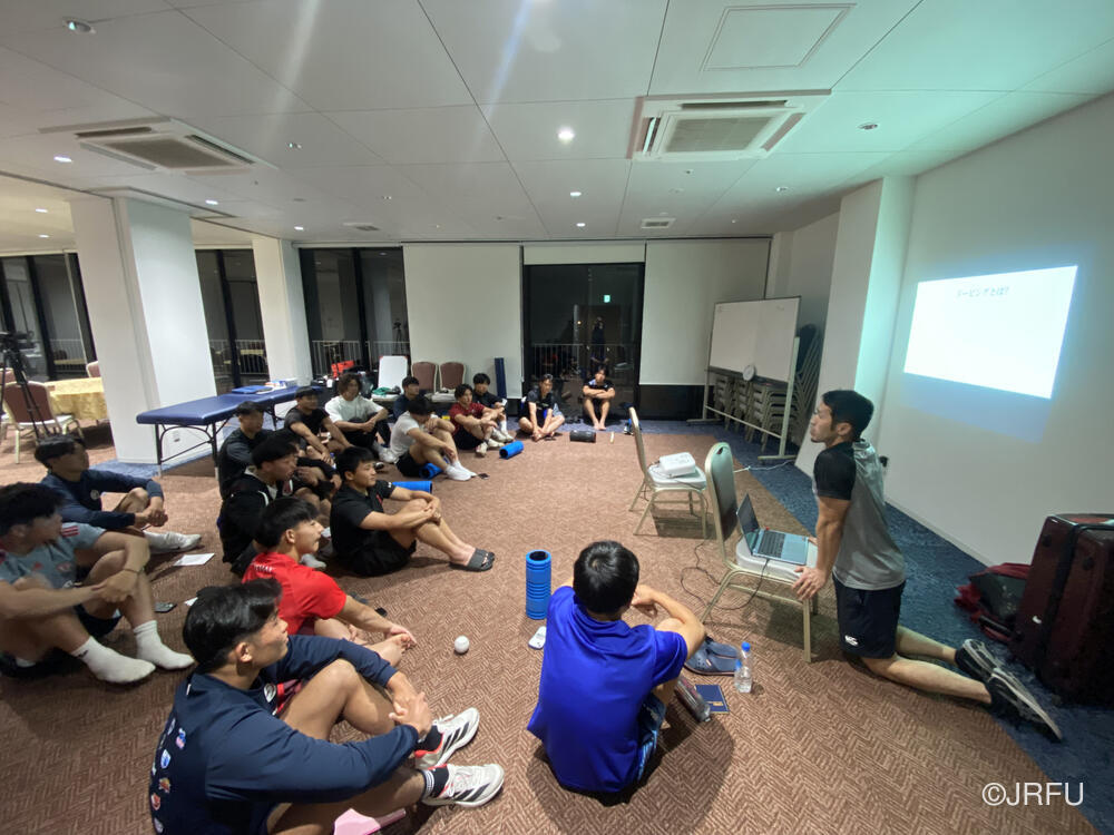 次に、木戸 陽介S&Cコーチからは、「サプリメント」の必要性についてや、体調管理ソフト「ONE TAP SPORTS」の使用目的についてお話の時間がありました。特に「ONE TAP SPORTS」で自分自身をモニタリングすることで見えてくるリカバリーの重要性、そしてリカバリー方法についての説明がありました。最後に、この合宿中に行動のスタンダードをあげるためにも小さな習慣が大きなパフォーマンスを作る、というメッセージを送り、本日は終了です。
