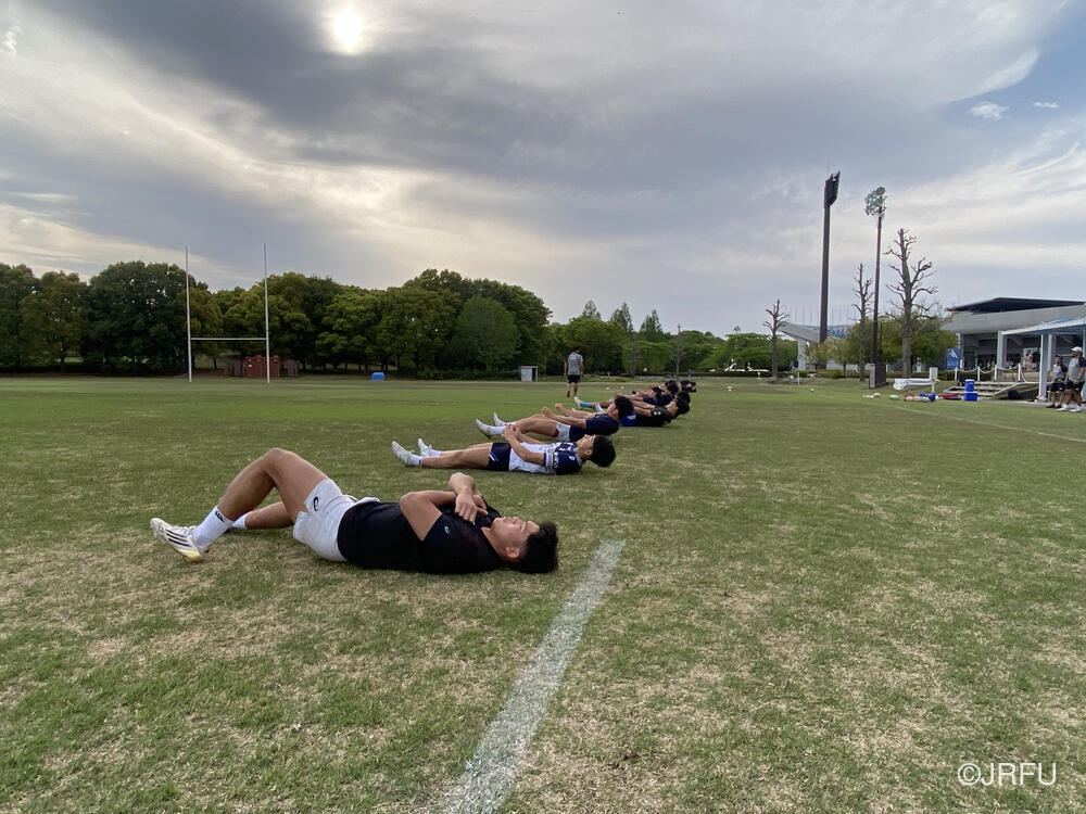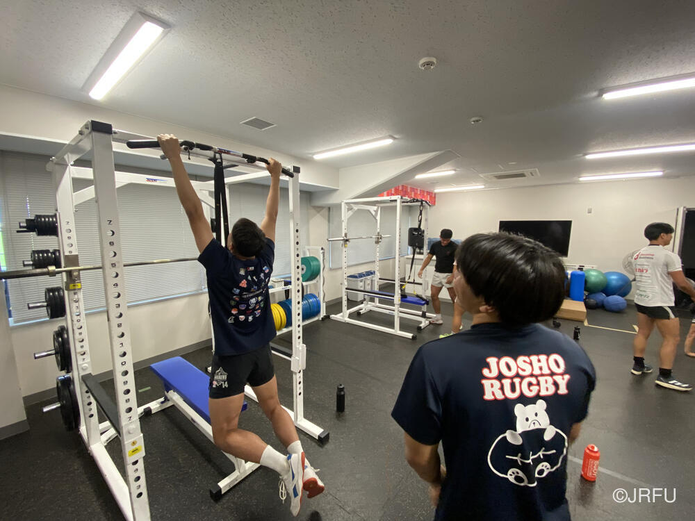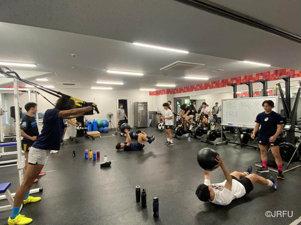 ジムでは、明日から本格的に始まるコンタクト練習に備えて、しっかりと体起こしを行うことを目的としたセッションを行いました。特に体幹を鍛える部分では、苦しい表情を浮かべながらも懸命に取り組む選手の姿がありました。