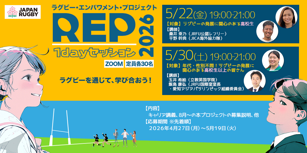 公益財団法人日本ラグビーフットボール協会は、「ラグビー・エンパワメント・プロジェクト」次世代リーダー育成事業の1dayセッション参加者募集について、下記のとおり、お知らせいたします。